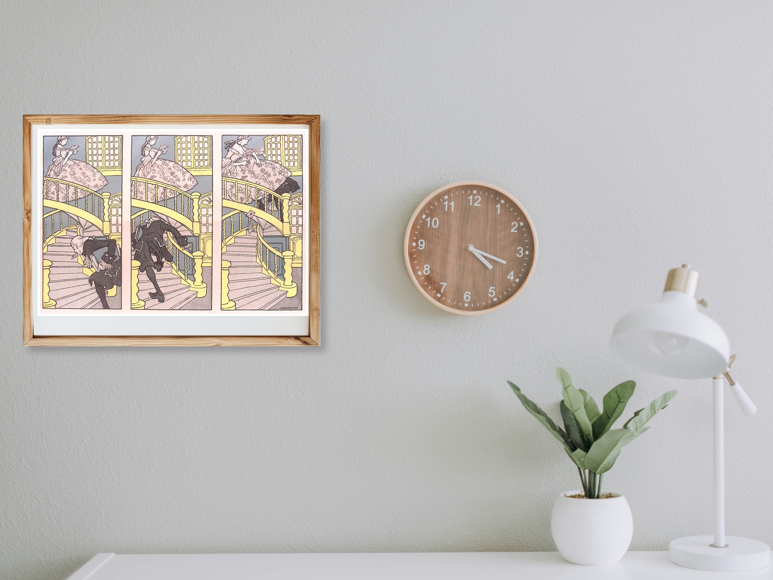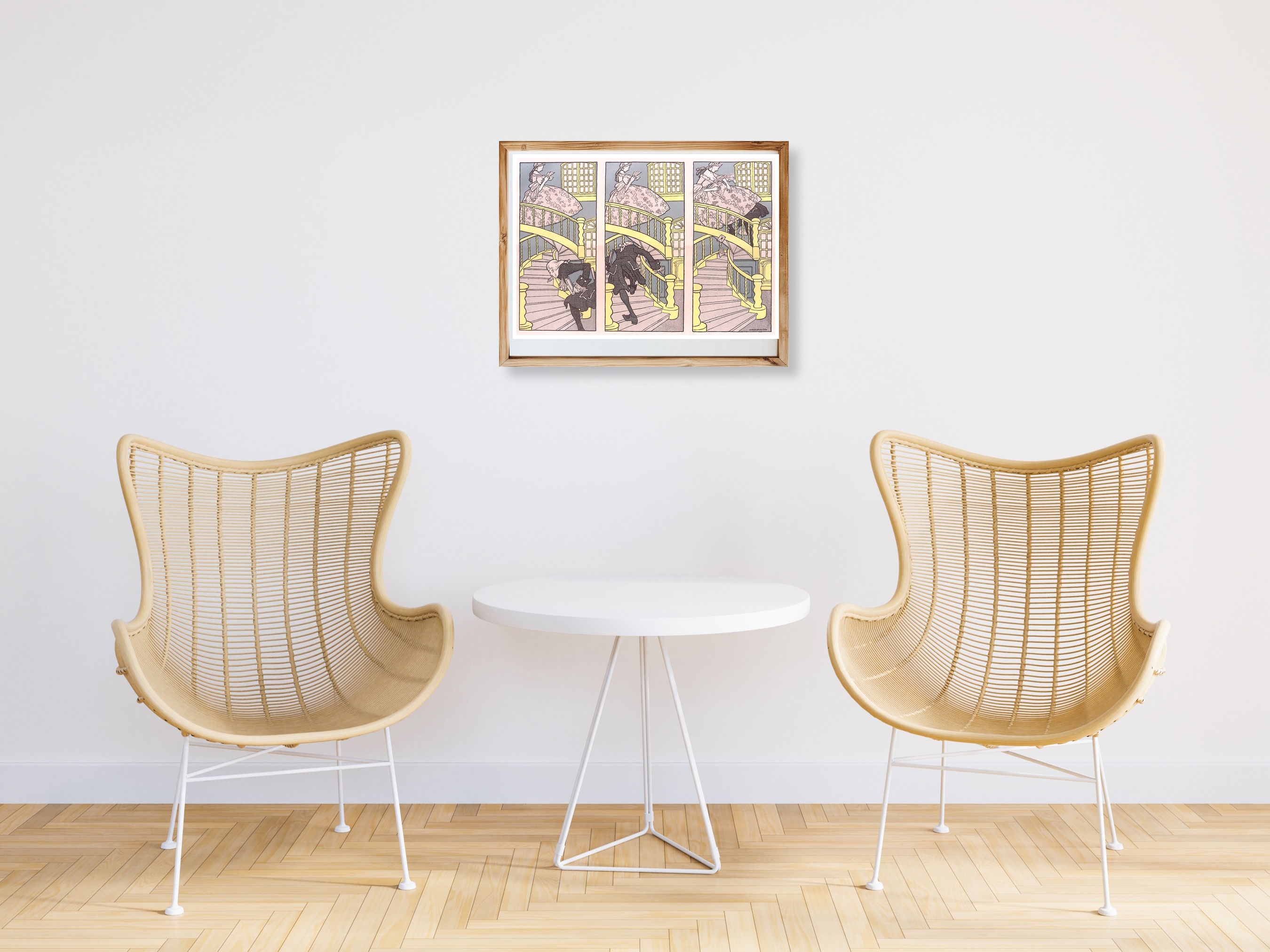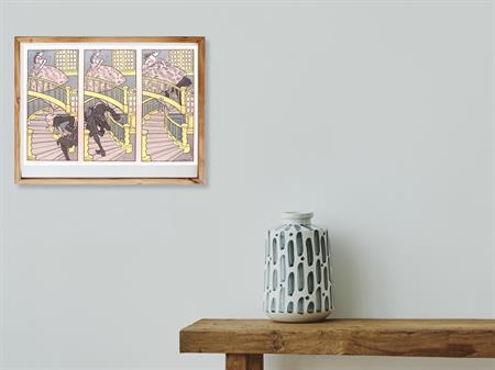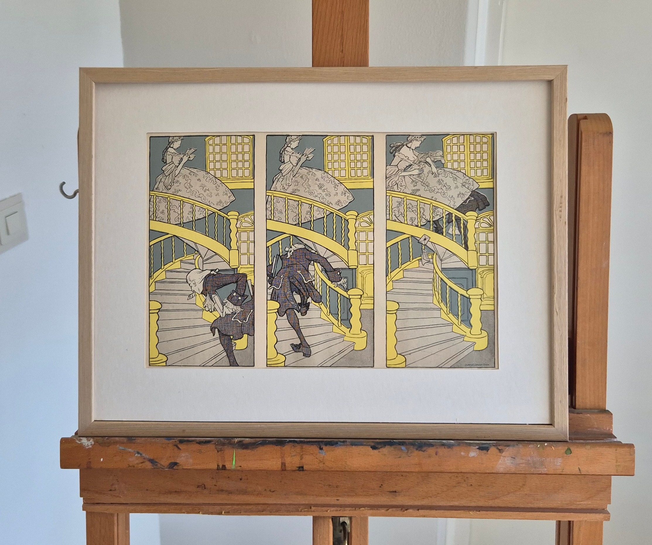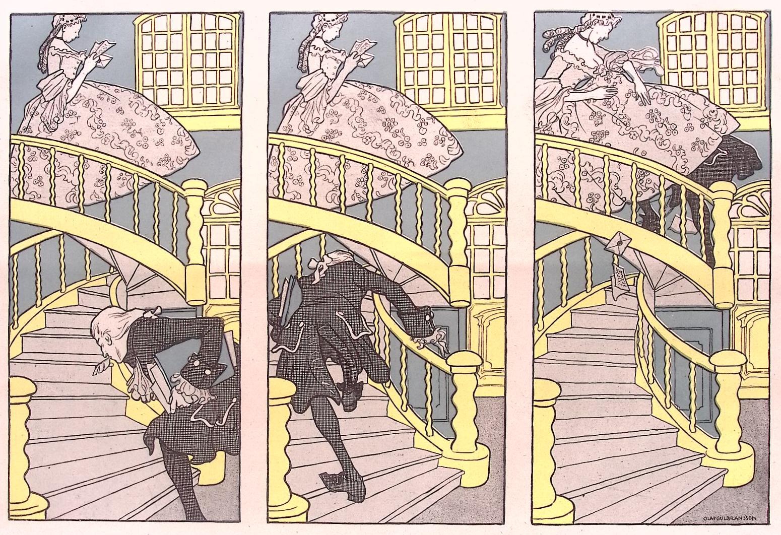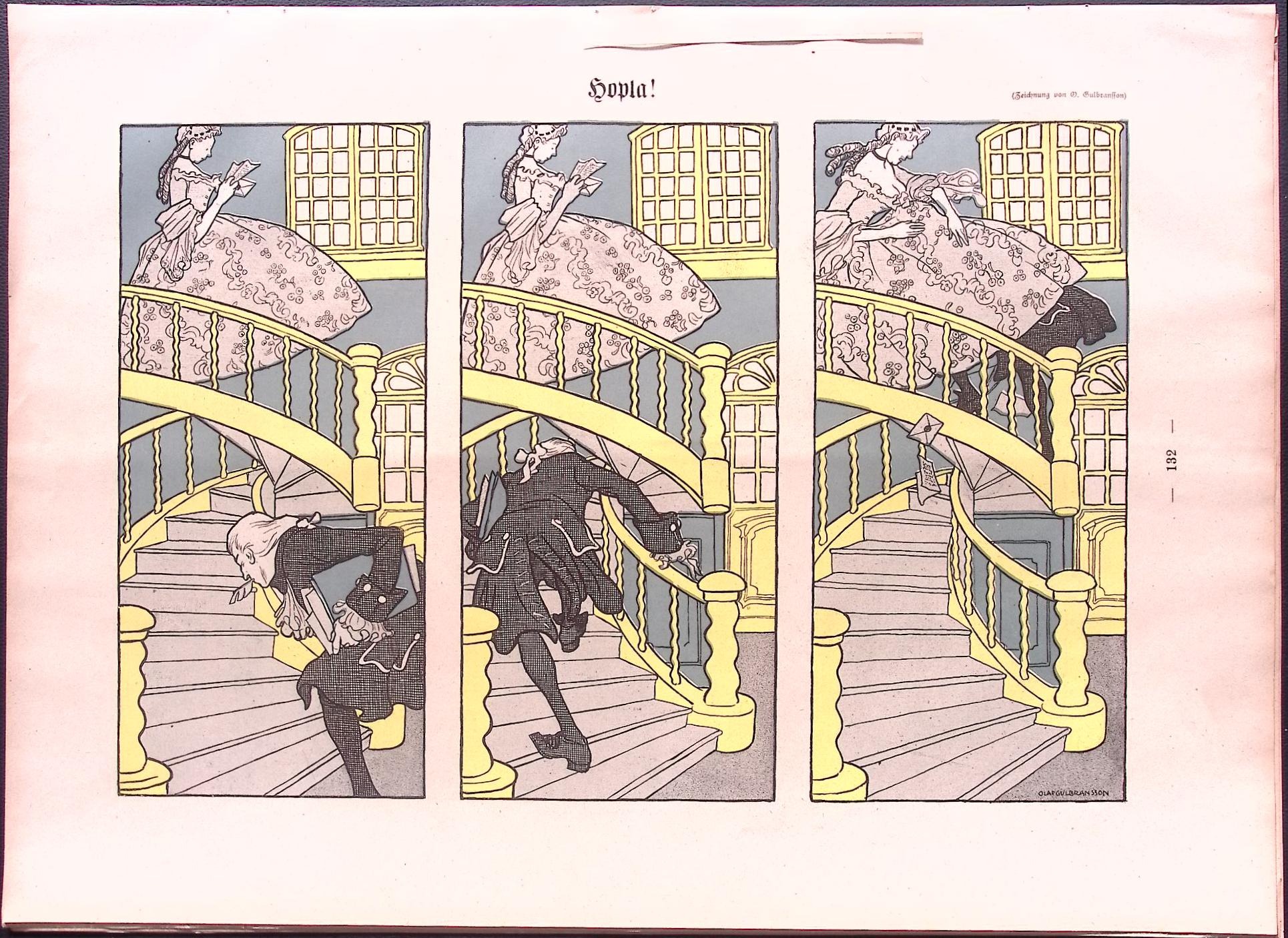 Onder de rok. Leuke authentieke prent die een bijzondere inkijk geeft in de mode en lifestyle van begin jaren 20e eeuw. De prent is afkomstig uit het Duitse weekblad Simplicissimus. Elke week werd er een mode, lifestyle of licht erotische prent afgedrukt. De prent wordt geleverd in passe partout in het formaat 30x40. Gedrukt in 1903, midden in de Art Nouveau periode. Olaf Gulbransson maakte deze prent voor in weekblad Simplicissimus.