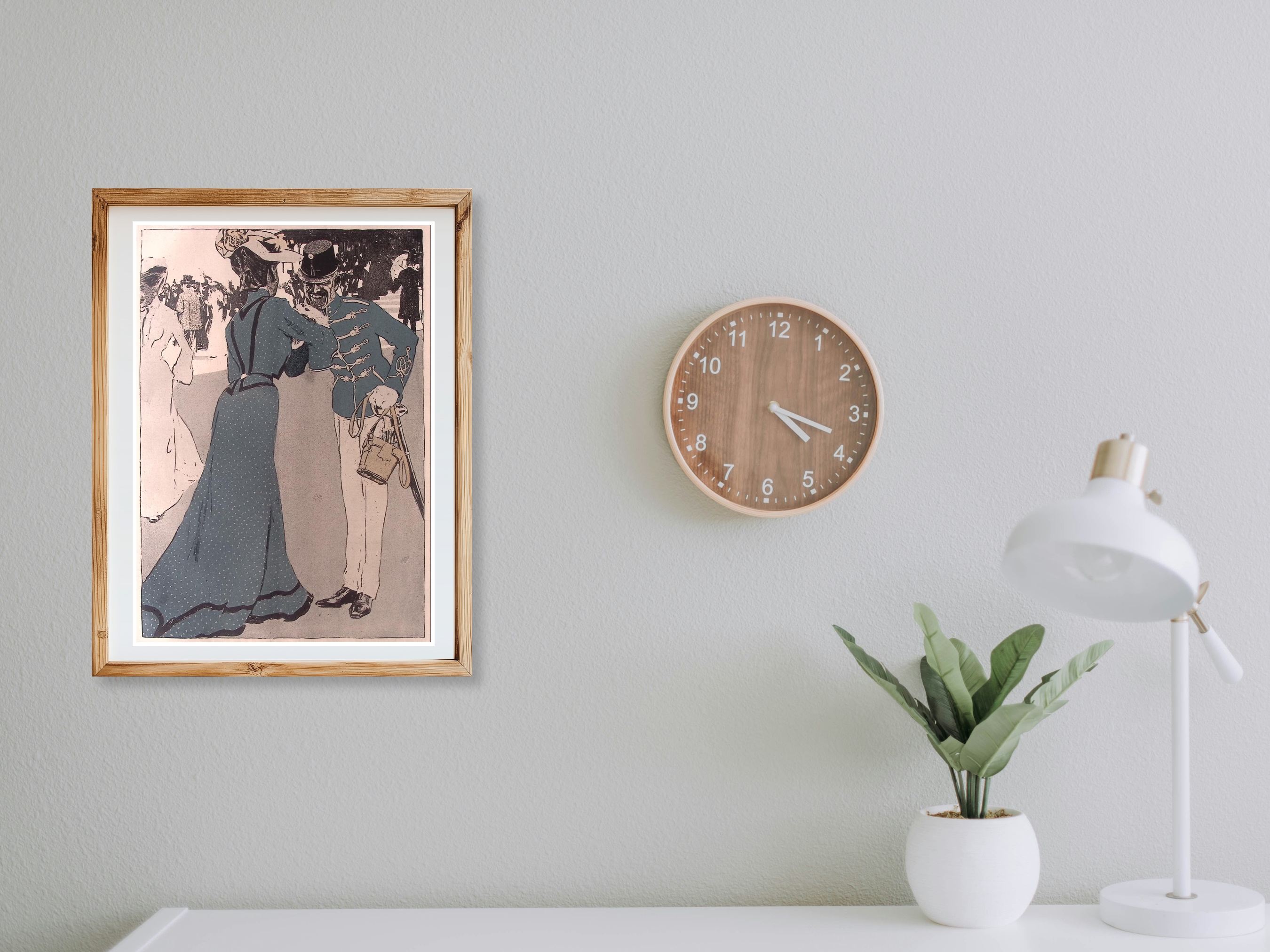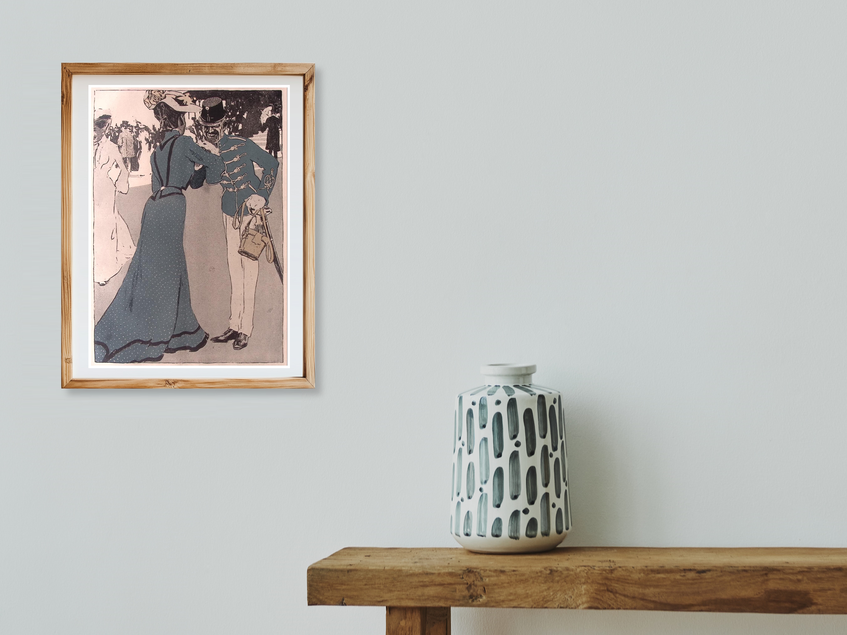 Laat uw kind eens zien. Originele prent uit de Jugendstil tijd. De prent is afkomstig uit het Duitse weekblad Simplicissimus. Mode, lifestyle en licht erotische prenten werden toegevoegd in een weekblad vol spotprenten. De prent wordt geleverd in passe partout in het formaat 30x40. Gedrukt in 1903, midden in de Art Nouveau periode. Prent gemaakt door Eduard Thöny in weekblad Simplicissimus.