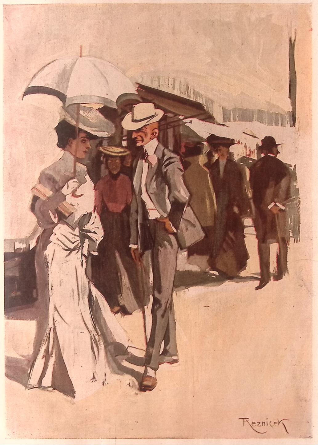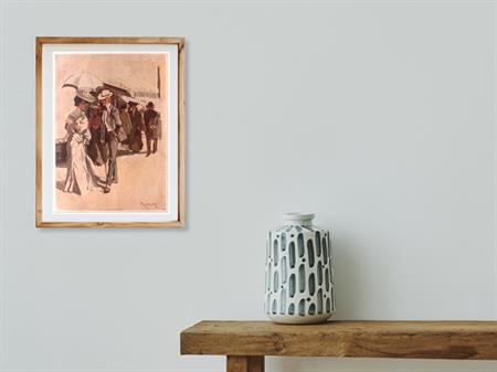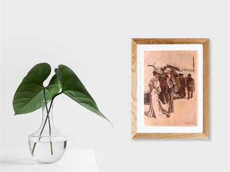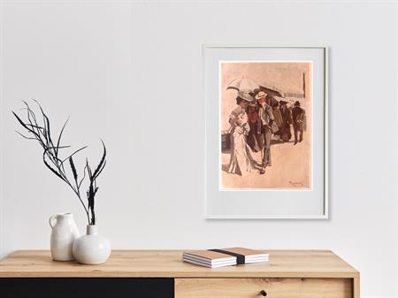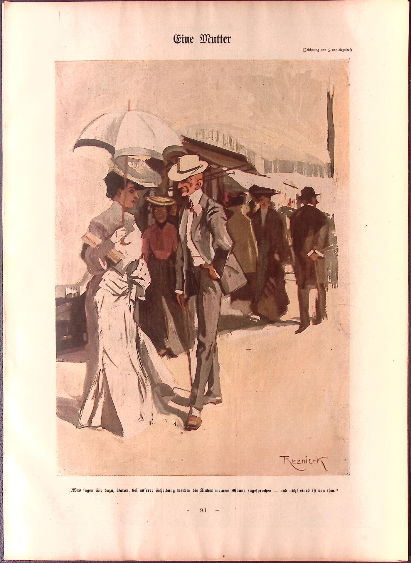 Onder de paraplu. Bijzondere authentieke prent. Mooie inkijk in de mode en lifestyle van begin jaren 20e eeuw. Komt uit Duits weekblad Simplicissimus, waar elke week een mode, lifestyle of licht erotische prent werd afgedrukt. De prent wordt geleverd in passe partout in het formaat 30x40. Deze prent is gedrukt midden in de Jugendstil periode in 1903. Ferdinand von Reznicek maakte deze prent voor in weekblad Simplicissimus.