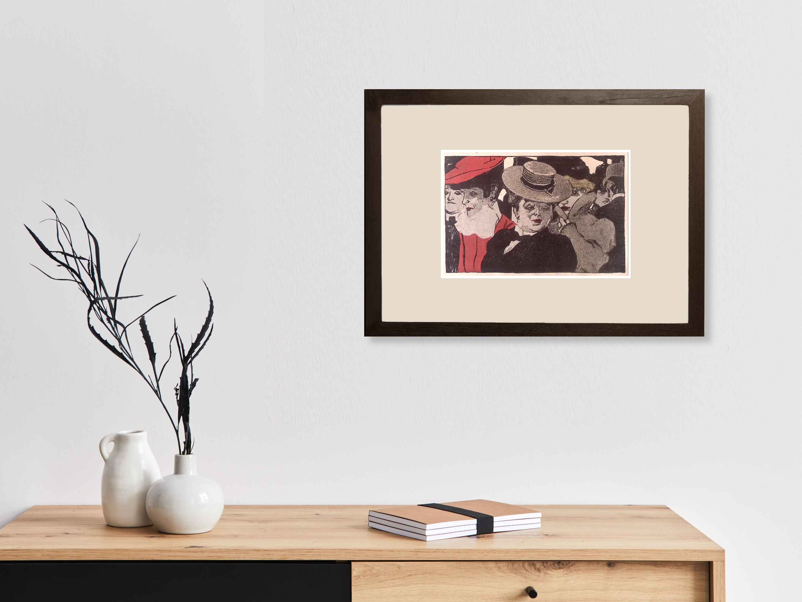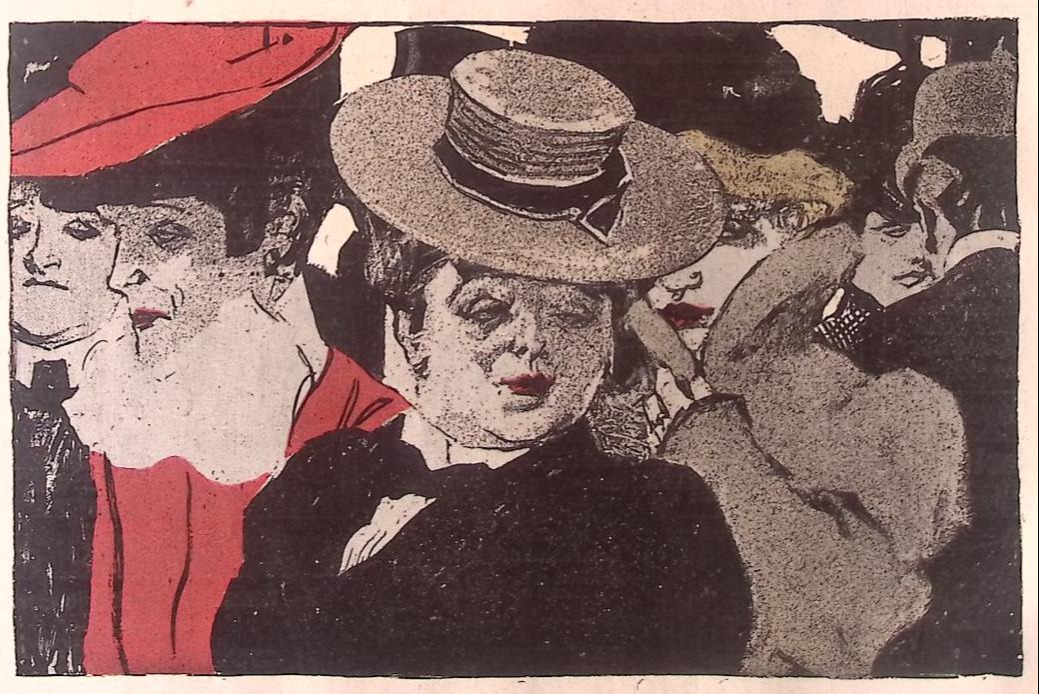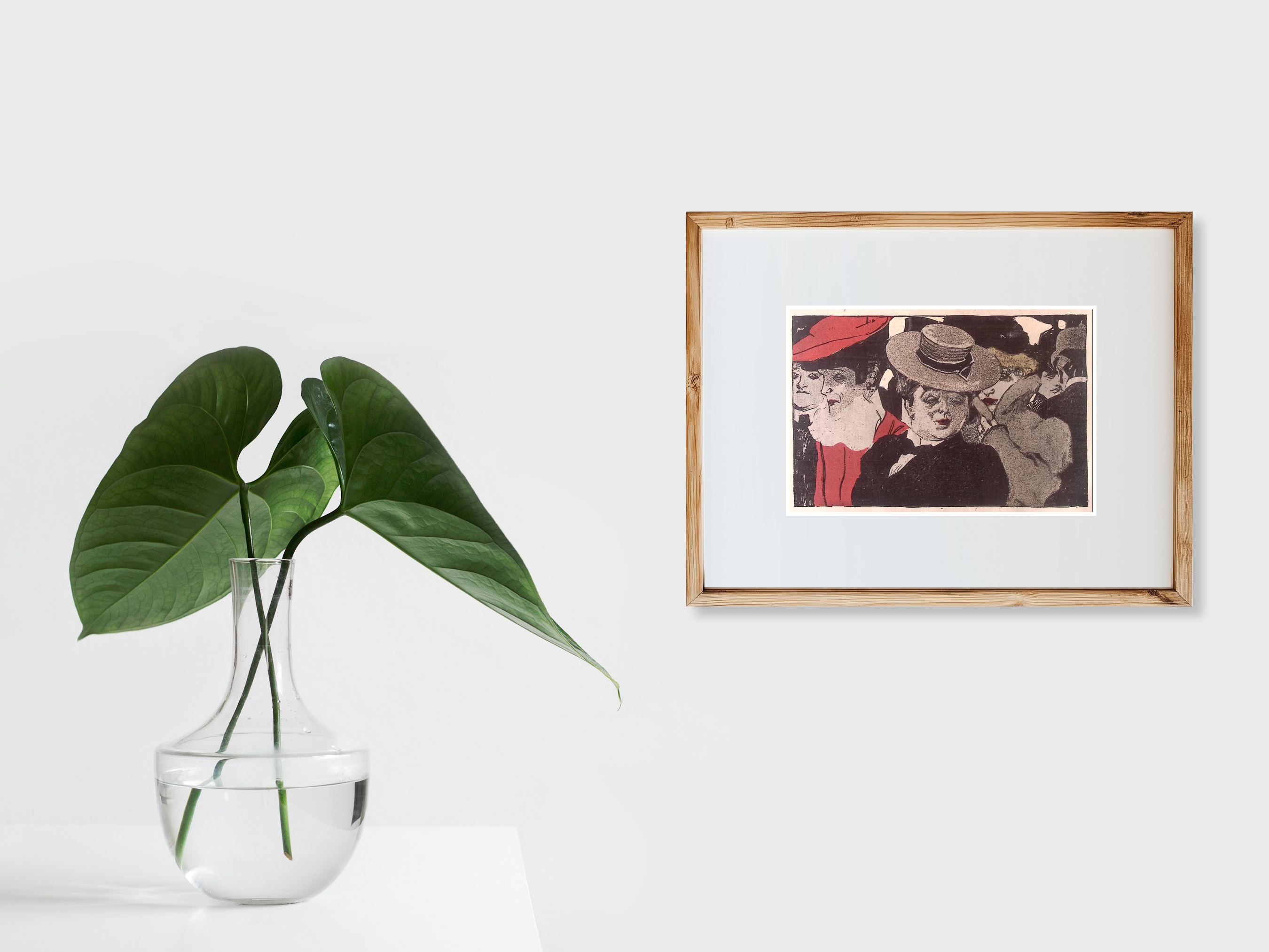 Nette dames. Leuke authentieke prent die een bijzondere inkijk geeft in de mode en lifestyle van begin jaren 20e eeuw. De prent is afkomstig uit het Duitse weekblad Simplicissimus. Elke week werd er een mode, lifestyle of licht erotische prent afgedrukt. De prent wordt geleverd in passe partout in het formaat 30x40. Gedrukt in 1903, midden in de Art Nouveau periode. Eduard Thöny maakte deze prent voor in weekblad Simplicissimus.