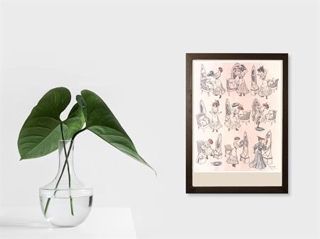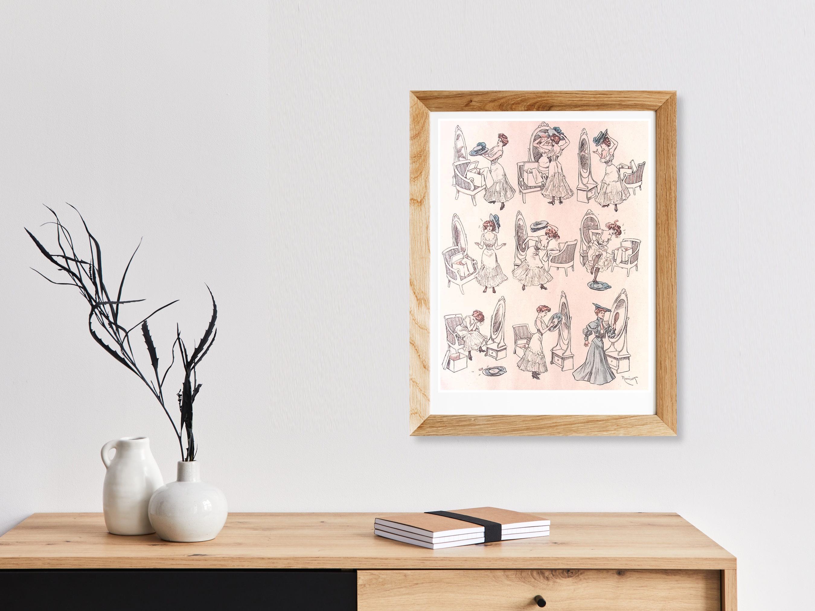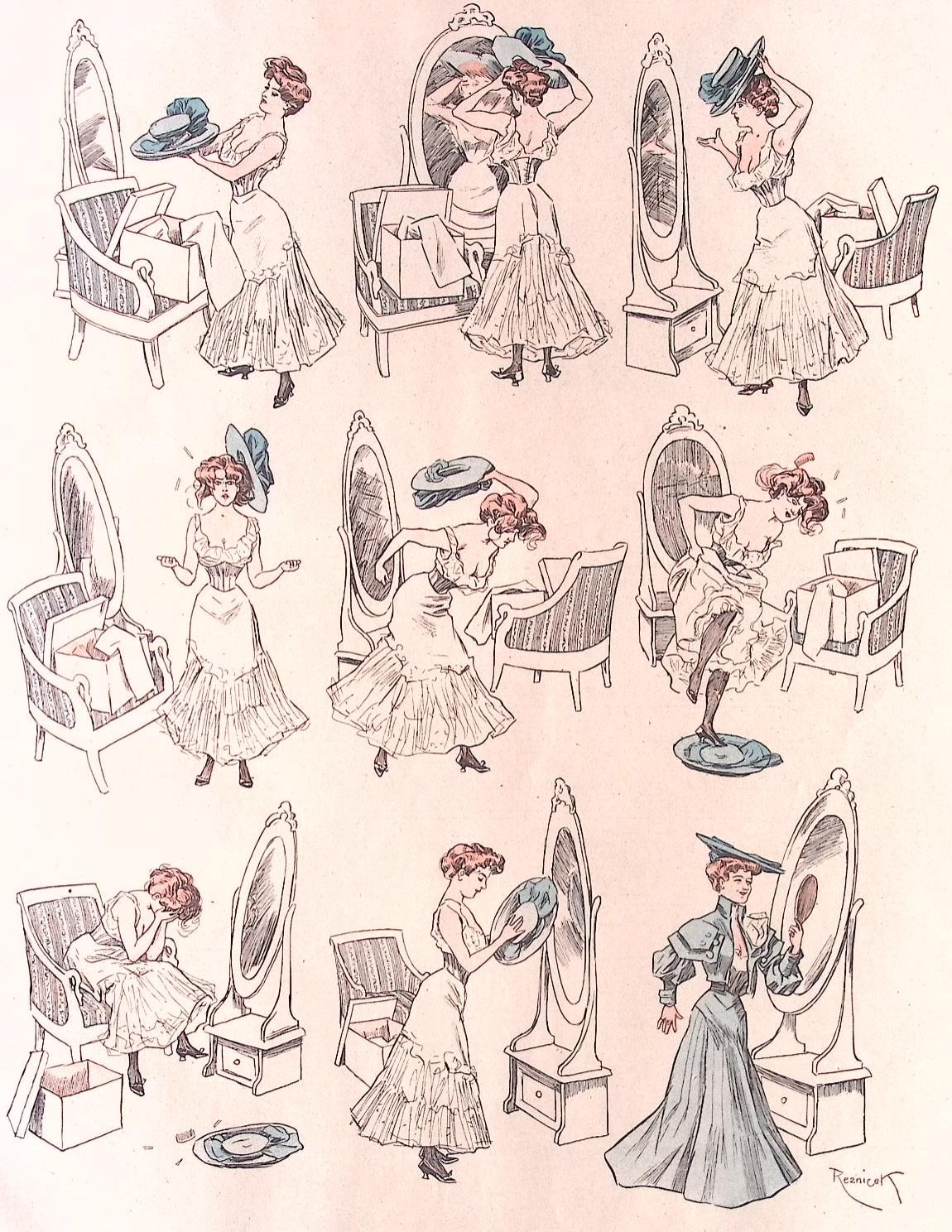 Zit mijn hoed goed. Leuke authentieke prent die een bijzondere inkijk geeft in de mode en lifestyle van begin jaren 20e eeuw. De prent is afkomstig uit het Duitse weekblad Simplicissimus. Elke week werd er een mode, lifestyle of licht erotische prent afgedrukt. De prent wordt geleverd in passe partout in het formaat 30x40. Deze prent is gedrukt midden in de Jugendstil periode in 1903. Prent gemaakt door Ferdinand von Reznicek in weekblad Simplicissimus.