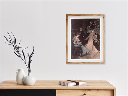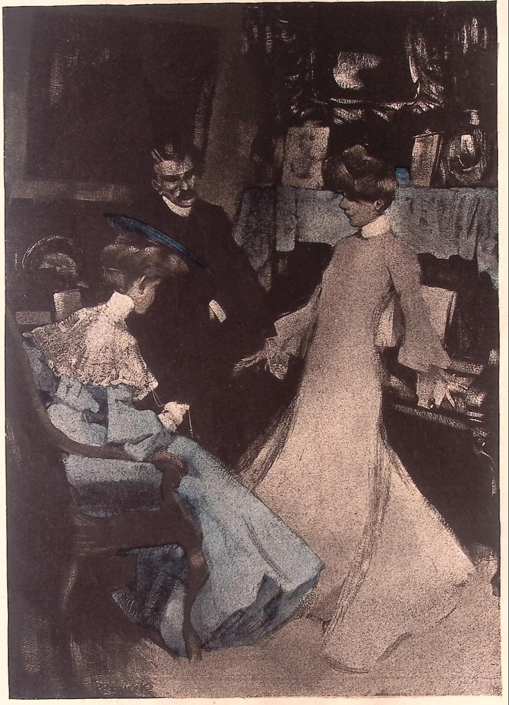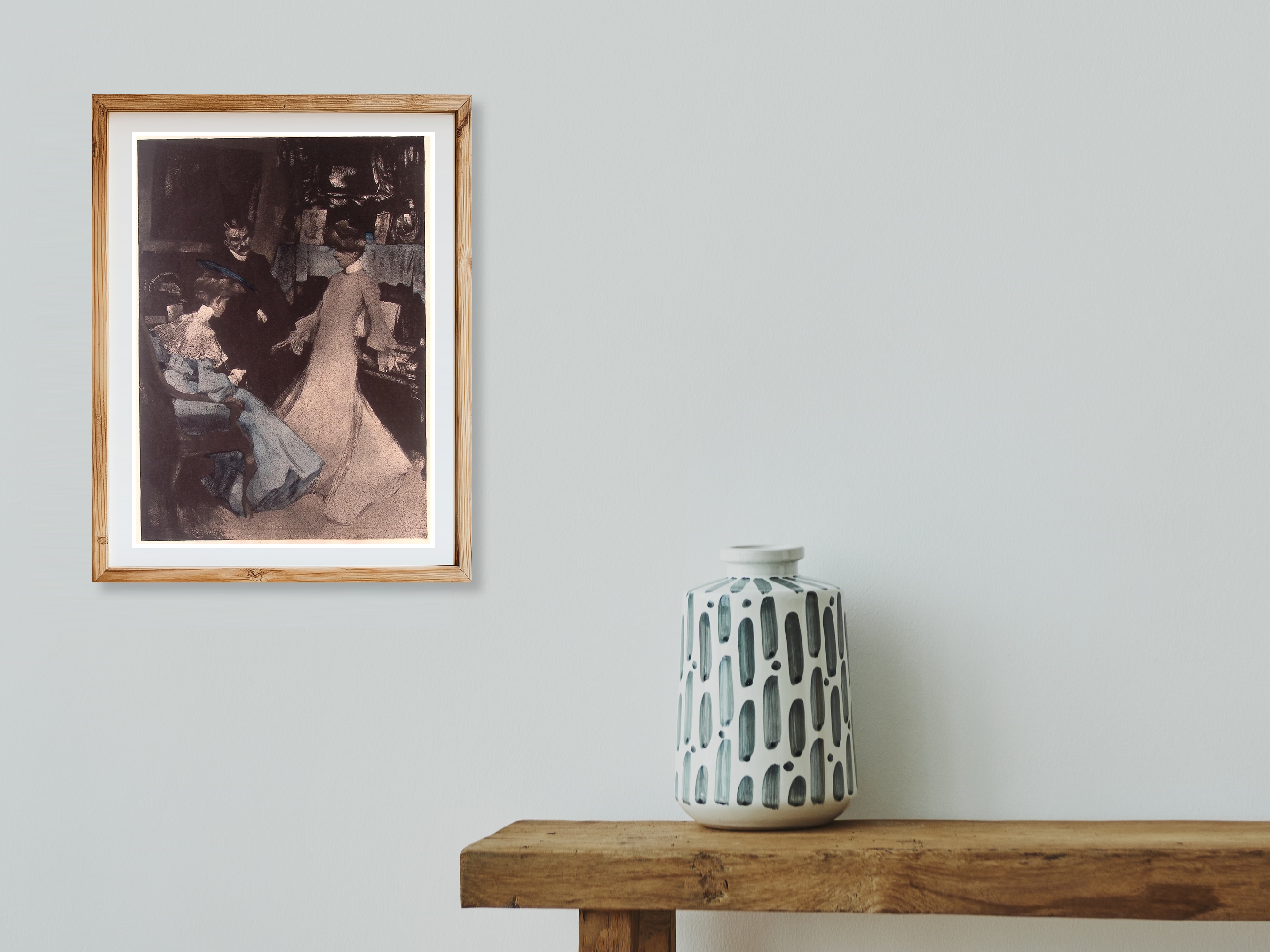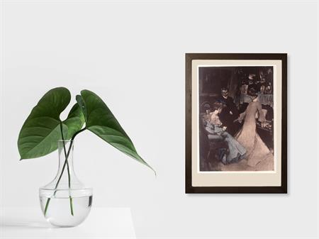Hangend op de piano. Leuke authentieke prent die een bijzondere inkijk geeft in de mode en lifestyle van begin jaren 20e eeuw. De prent is afkomstig uit het Duitse weekblad Simplicissimus. Elke week werd er een mode, lifestyle of licht erotische prent afgedrukt. De prent wordt geleverd in passe partout in het formaat 30x40. Deze prent is gedrukt midden in de Jugendstil periode in 1903. Prent gemaakt door Ferdinand von Reznicek in weekblad Simplicissimus.