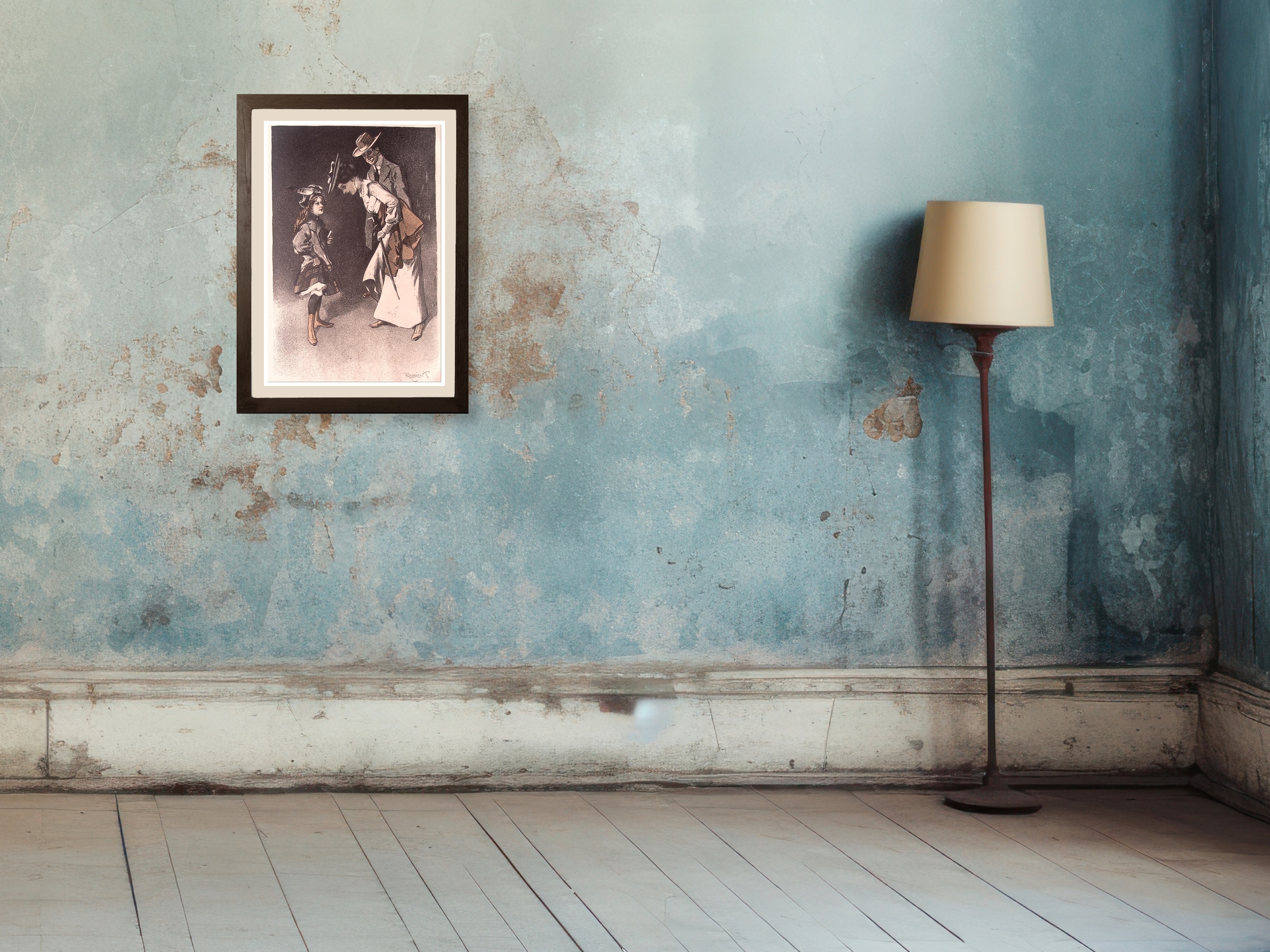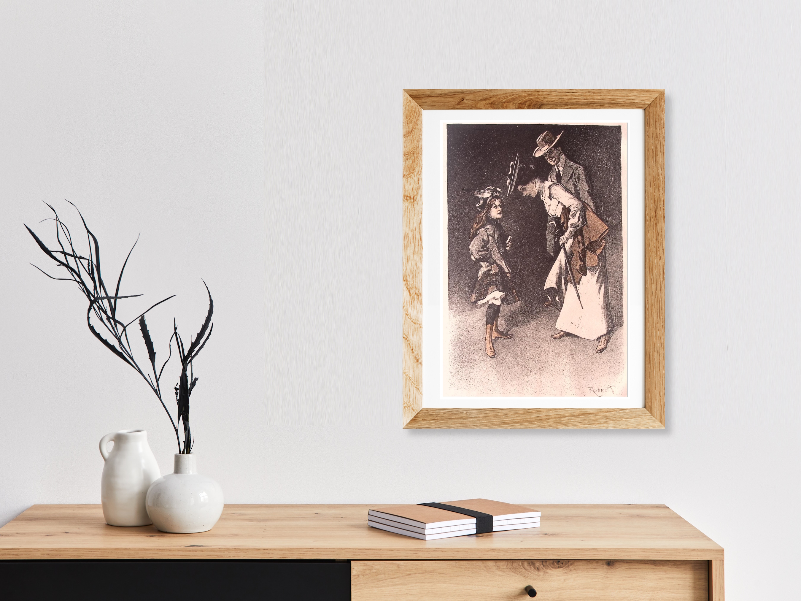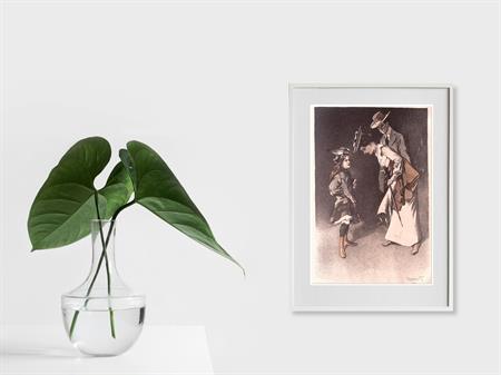 Laat je schoen eens zien. Bijzondere authentieke prent. Mooie inkijk in de mode en lifestyle van begin jaren 20e eeuw. Komt uit Duits weekblad Simplicissimus, waar elke week een mode, lifestyle of licht erotische prent werd afgedrukt. De prent wordt geleverd in passe partout in het formaat 30x40. De vintage prent is gedrukt in 1903, midden in de Art Nouveau periode. Prent gemaakt door Ferdinand von Reznicek in weekblad Simplicissimus.