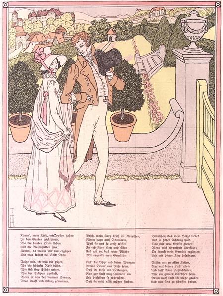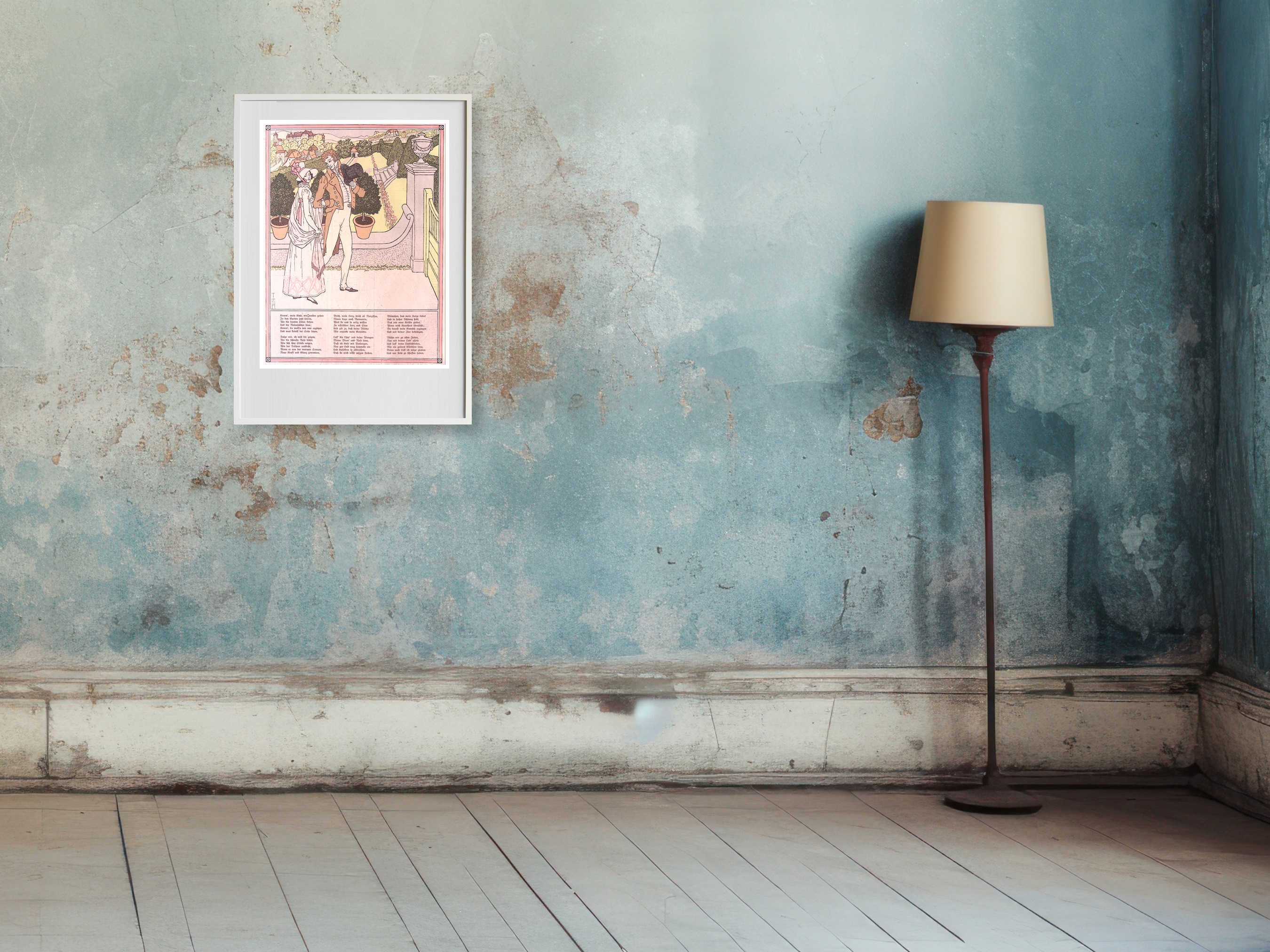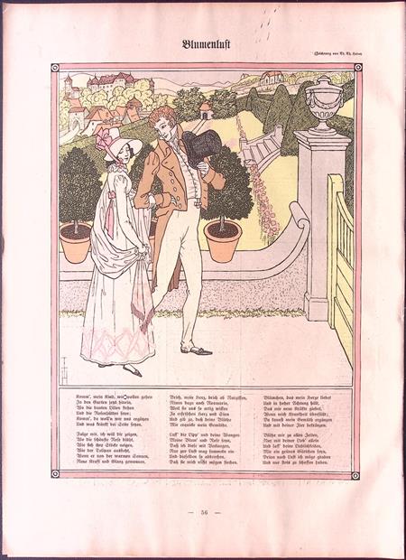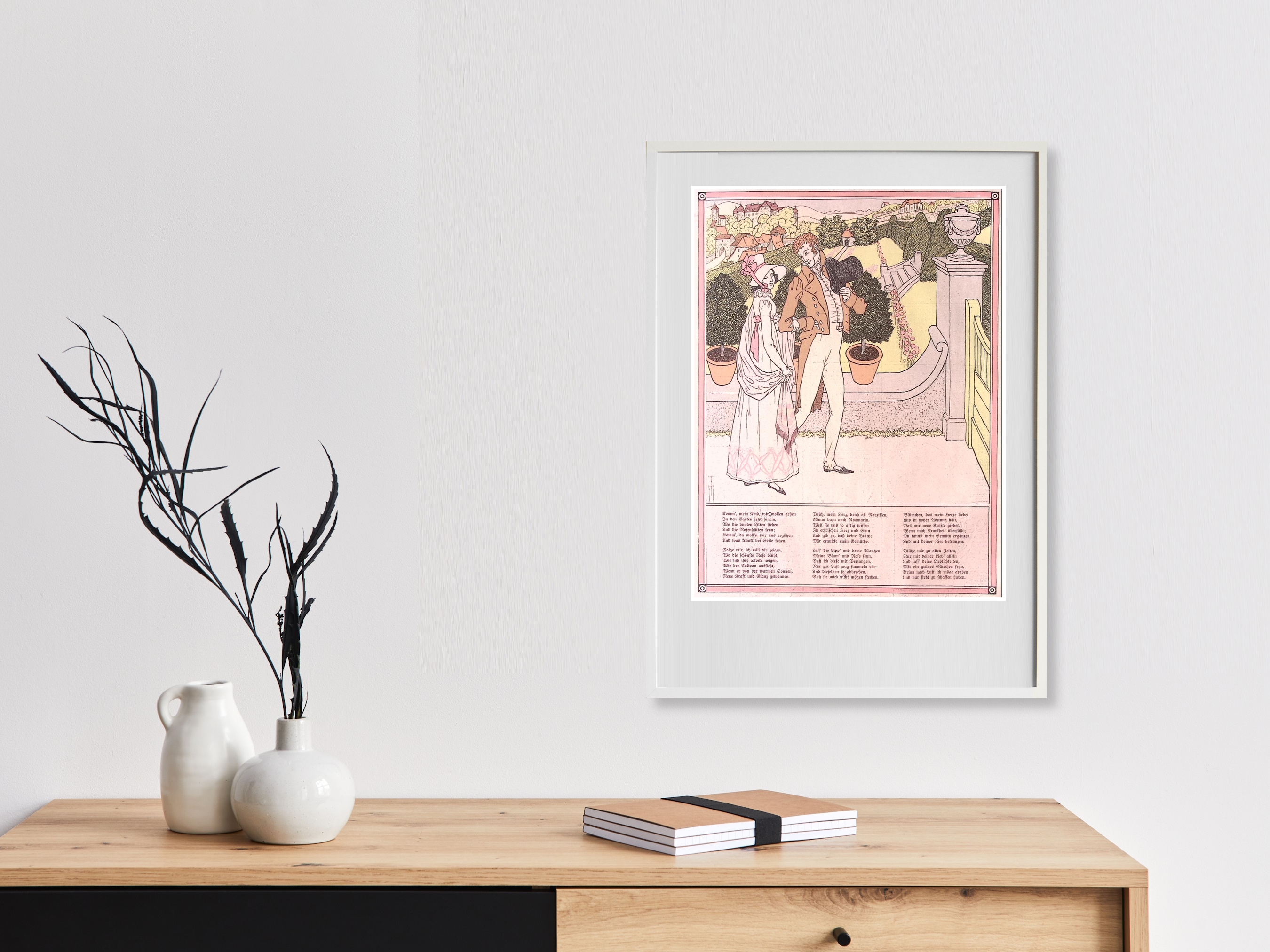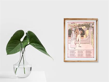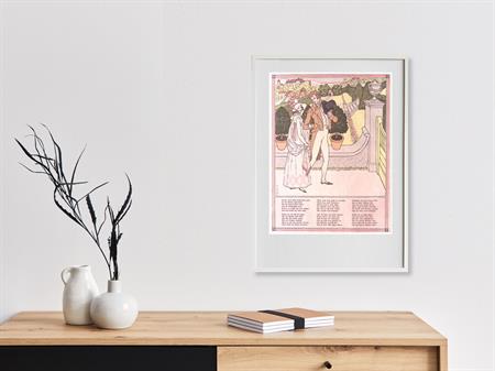 Een roze droom. Leuke authentieke prent die een bijzondere inkijk geeft in de mode en lifestyle van begin jaren 20e eeuw. De prent is afkomstig uit het Duitse weekblad Simplicissimus. Elke week werd er een mode, lifestyle of licht erotische prent afgedrukt. De prent wordt geleverd in passe partout in het formaat 30x40. Gedrukt in 1903, midden in de Art Nouveau periode. Thomas Theodor Heine maakte deze prent voor in weekblad Simplicissimus.