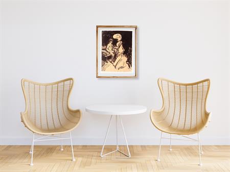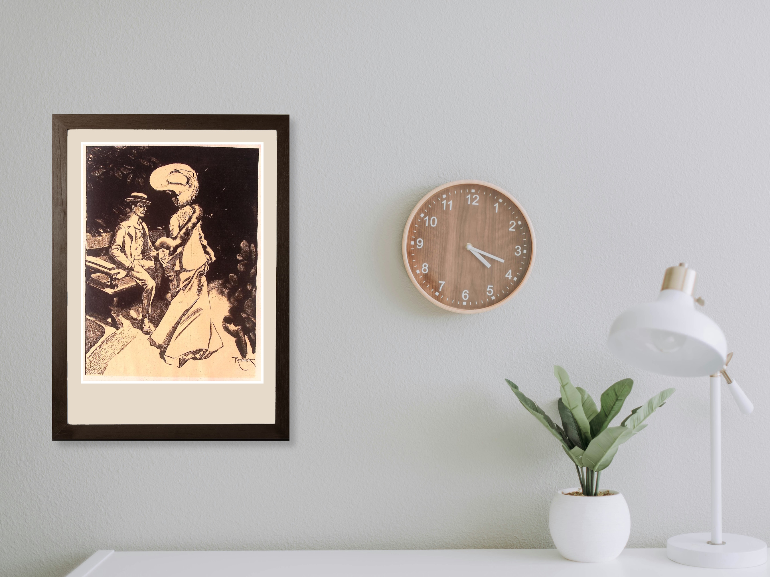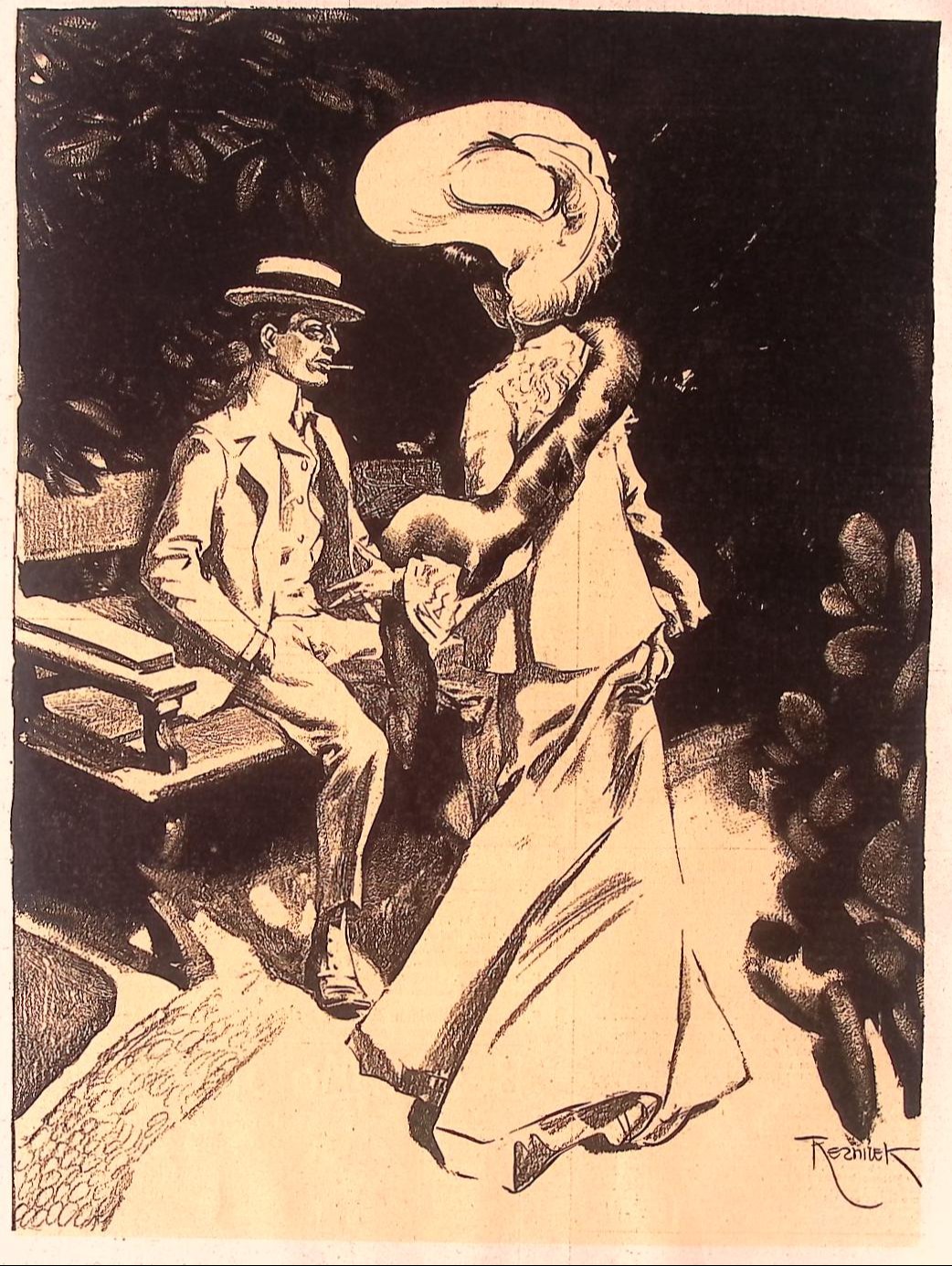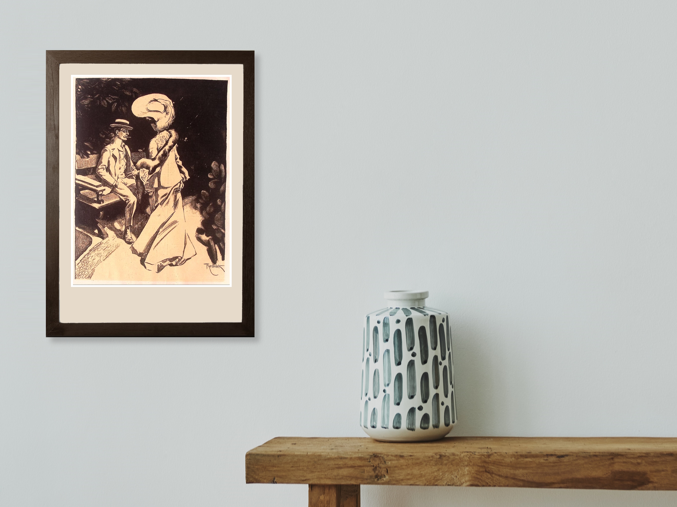 Een hoed kan niet groot genoeg zijn. Originele prent uit de Jugendstil tijd. De prent is afkomstig uit het Duitse weekblad Simplicissimus. Mode, lifestyle en licht erotische prenten werden toegevoegd in een weekblad vol spotprenten. De prent wordt geleverd in passe partout in het formaat 30x40. Deze prent is gedrukt midden in de Jugendstil periode in 1903. Ferdinand von Reznicek maakte deze prent voor in weekblad Simplicissimus.