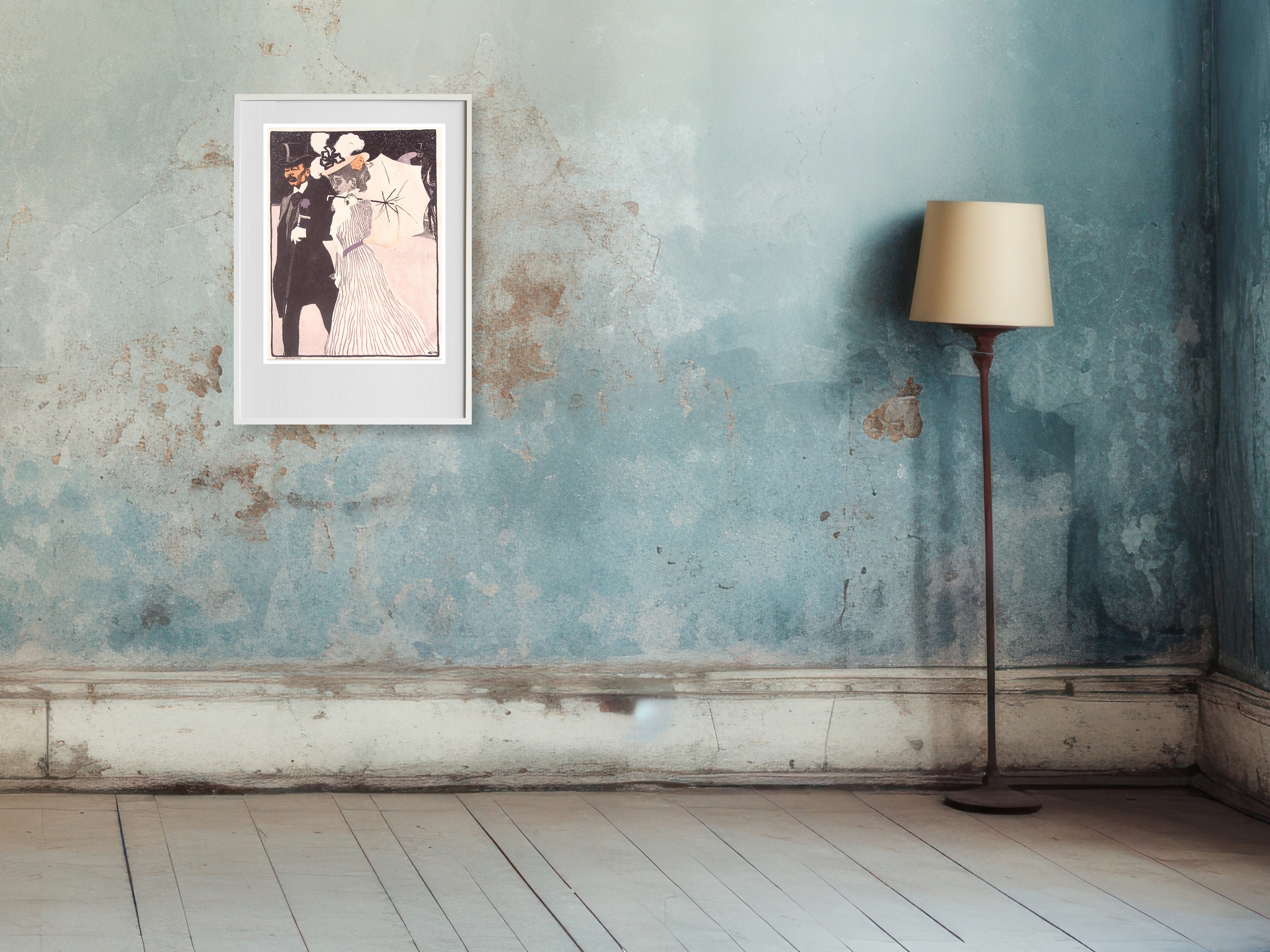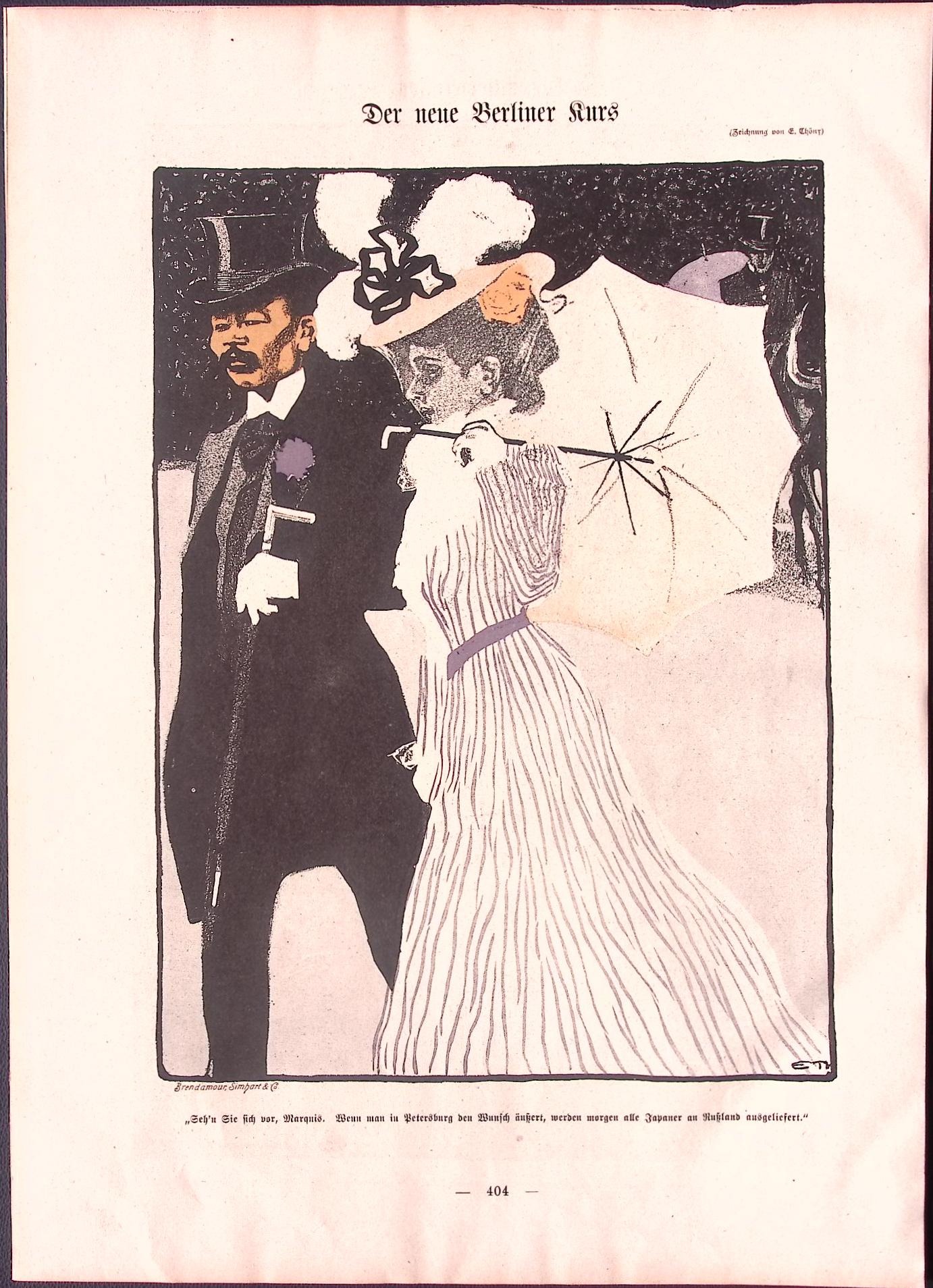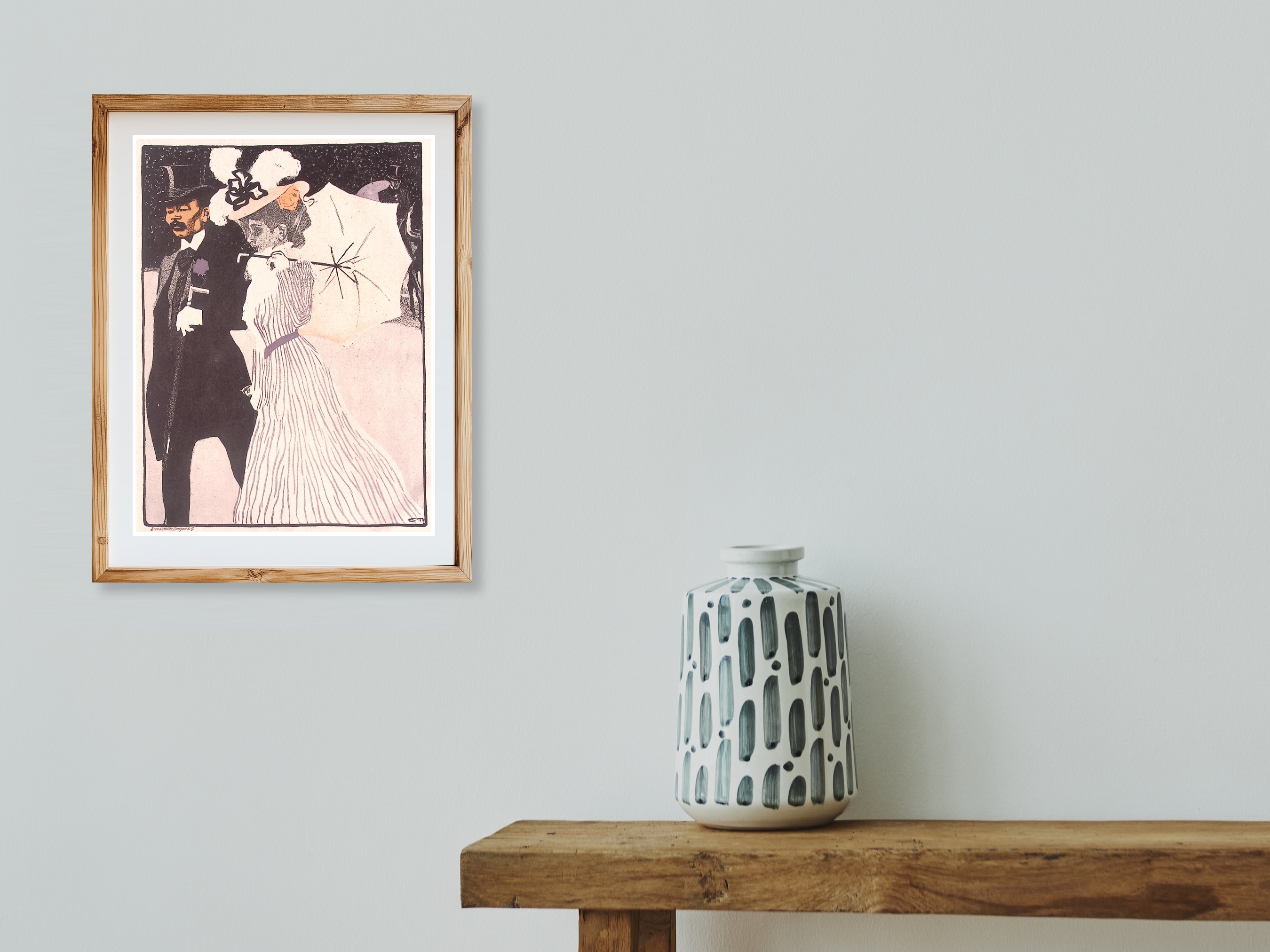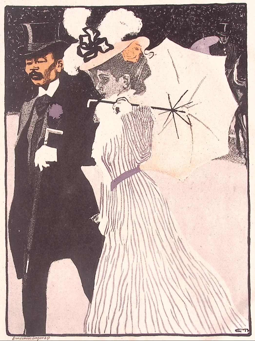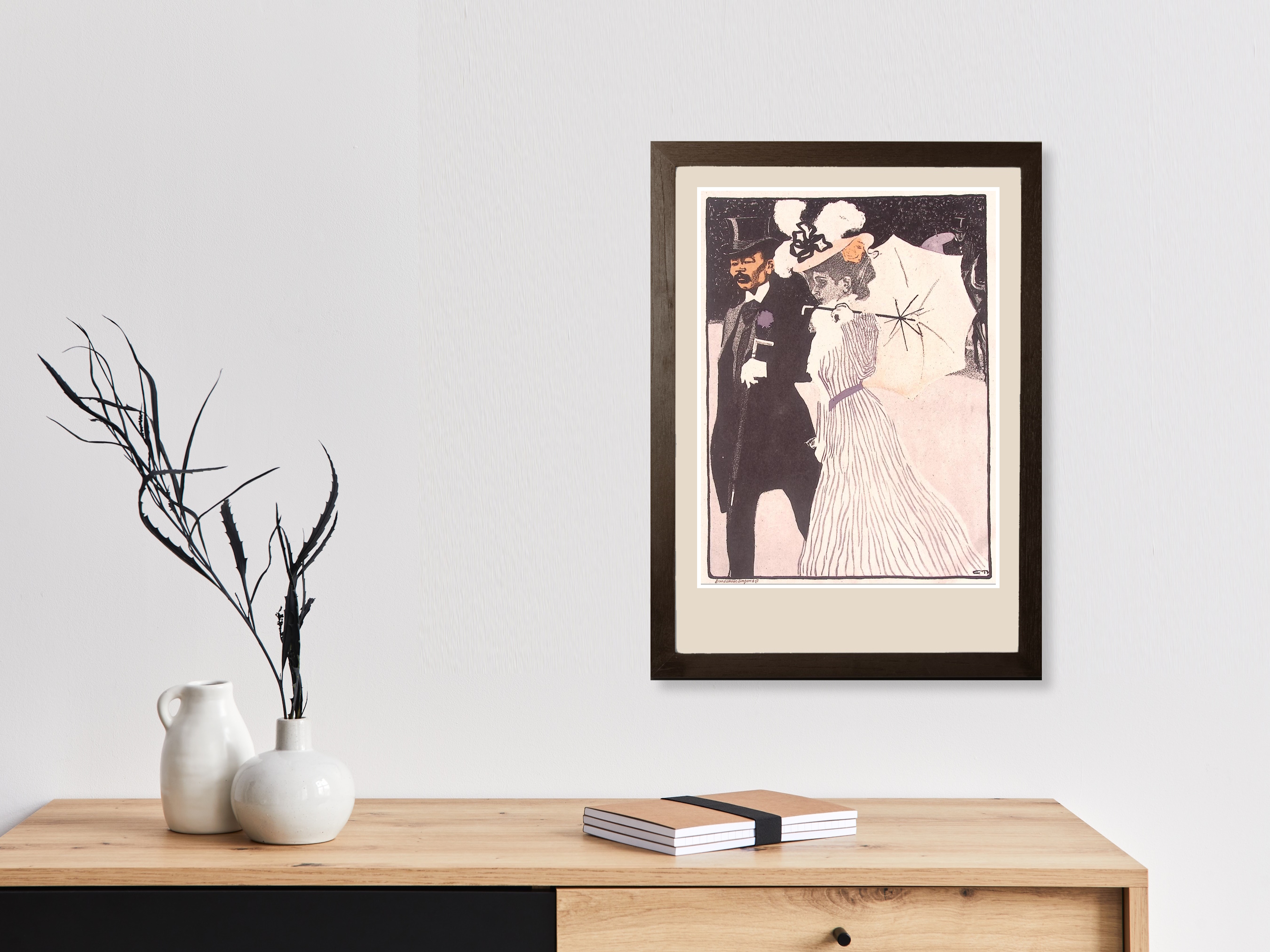 Samen op pad met paraplu. Bijzondere authentieke prent. Mooie inkijk in de mode en lifestyle van begin jaren 20e eeuw. Komt uit Duits weekblad Simplicissimus, waar elke week een mode, lifestyle of licht erotische prent werd afgedrukt. De prent wordt geleverd in passe partout in het formaat 30x40. Deze prent is gedrukt midden in de Jugendstil periode in 1903. Eduard Thöny maakte deze prent voor in weekblad Simplicissimus.