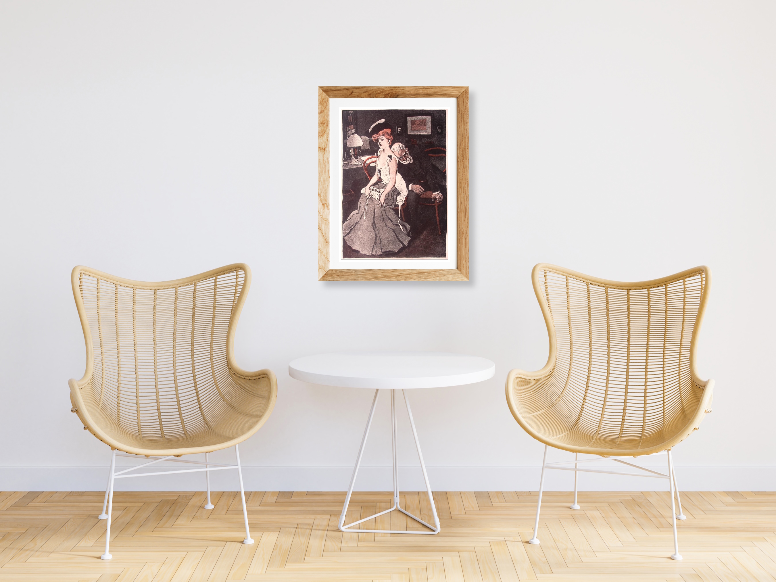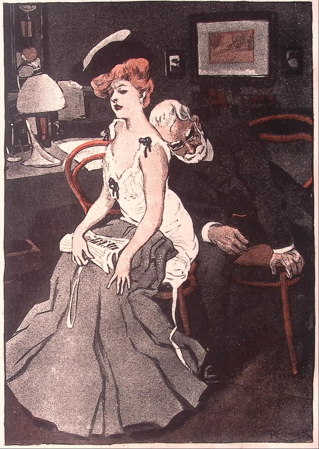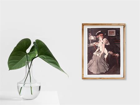 Mag ik je even als leuning gebruiken. Bijzondere authentieke prent. Mooie inkijk in de mode en lifestyle van begin jaren 20e eeuw. Komt uit Duits weekblad Simplicissimus, waar elke week een mode, lifestyle of licht erotische prent werd afgedrukt. De prent wordt geleverd in passe partout in het formaat 30x40. Deze prent is gedrukt midden in de Jugendstil periode in 1903. Ferdinand von Reznicek maakte deze prent voor in weekblad Simplicissimus.
