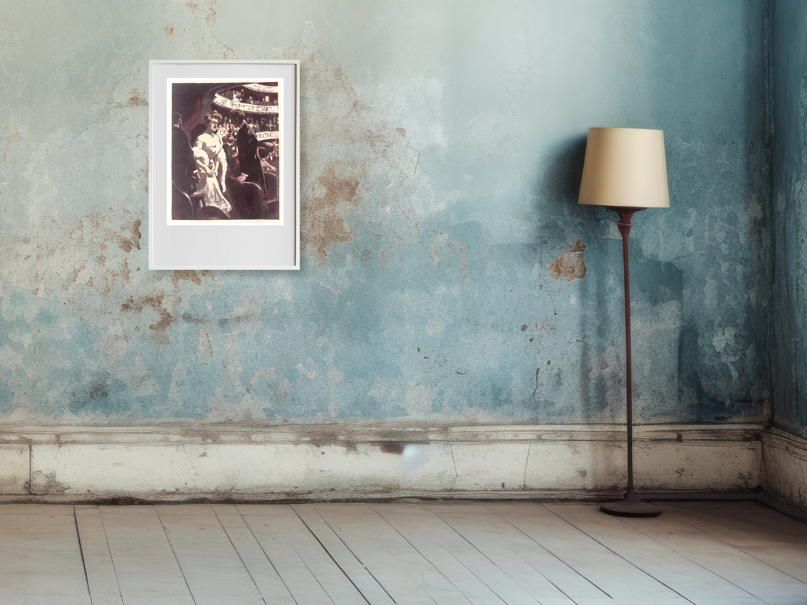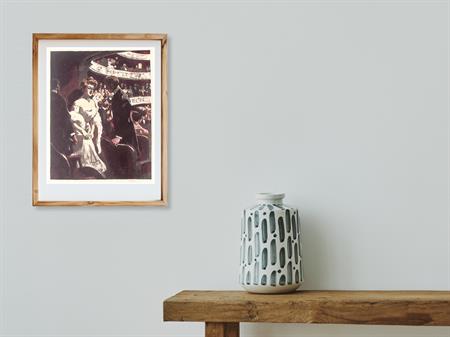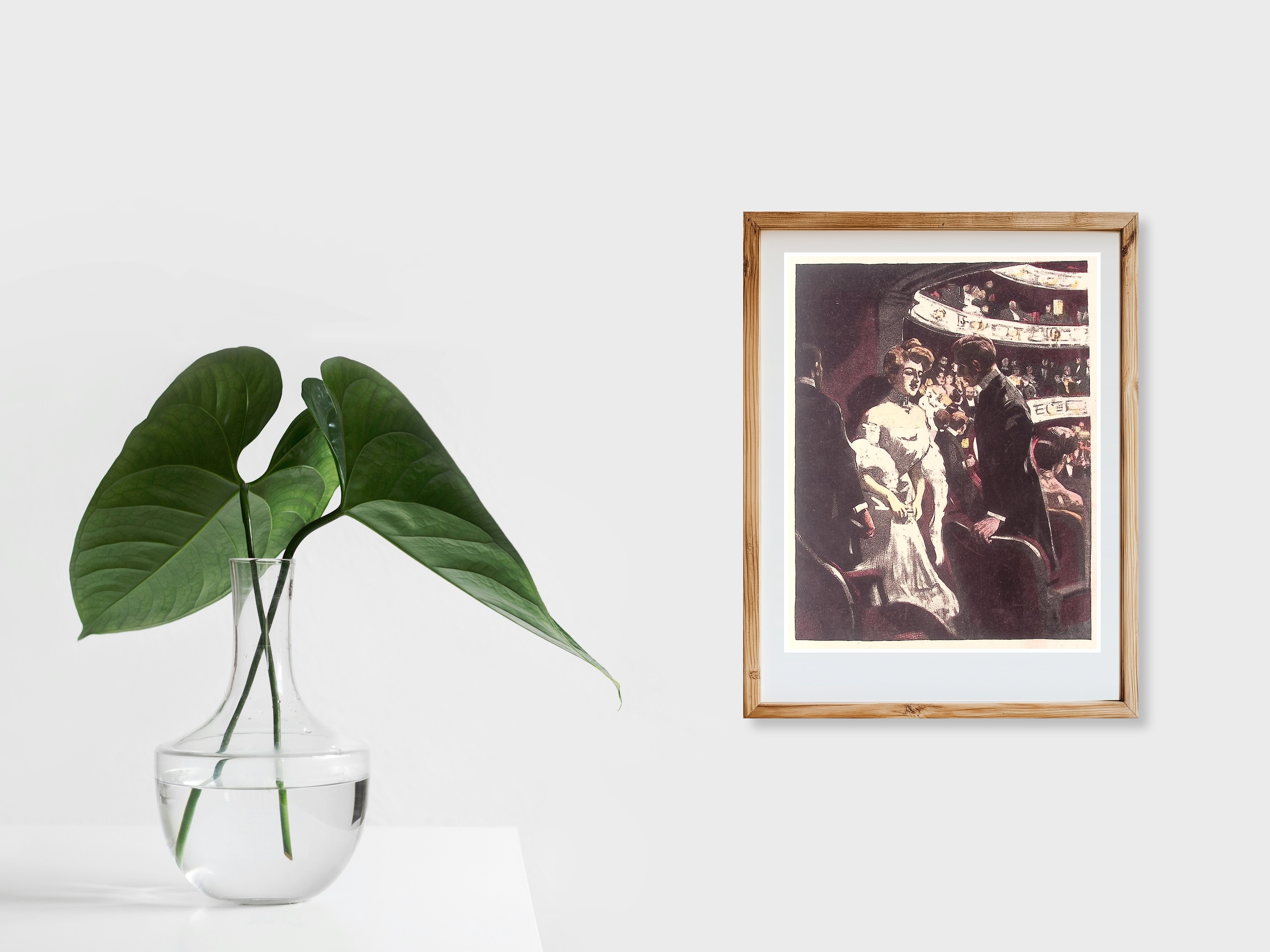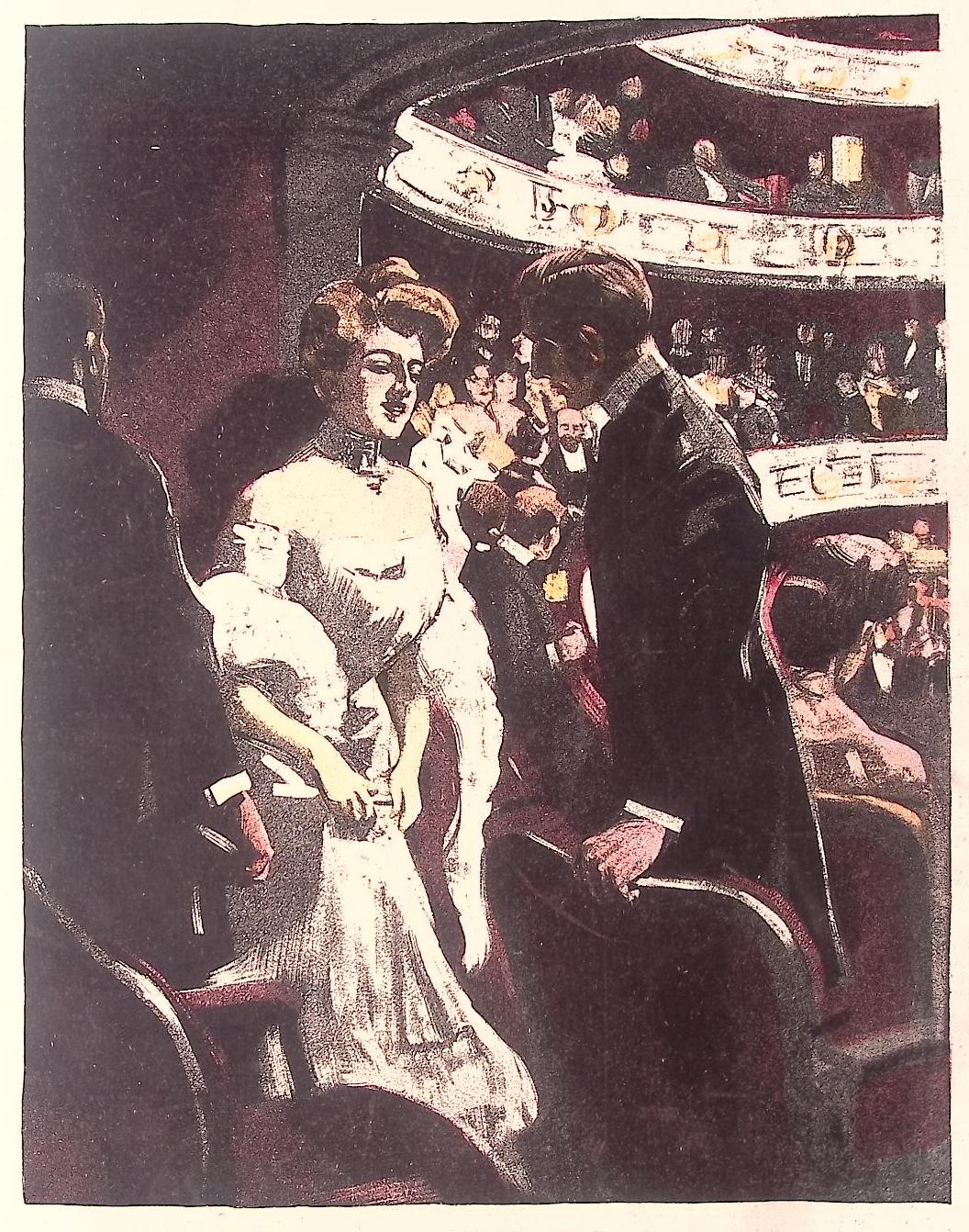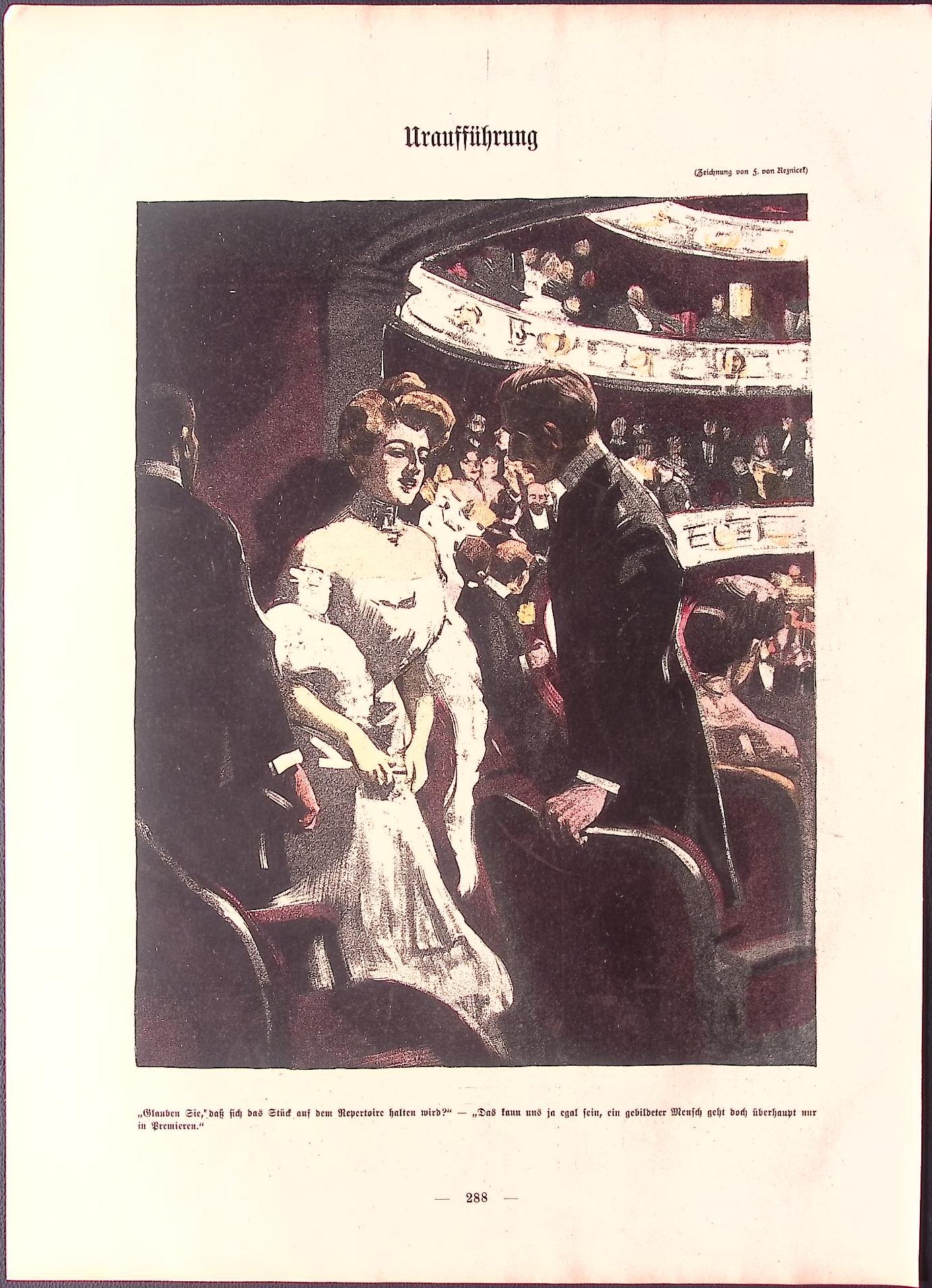 Een avond in het theater. Originele prent uit de Jugendstil tijd. De prent is afkomstig uit het Duitse weekblad Simplicissimus. Mode, lifestyle en licht erotische prenten werden toegevoegd in een weekblad vol spotprenten. De prent wordt geleverd in passe partout in het formaat 30x40. Gedrukt in 1903, midden in de Art Nouveau periode. Prent gemaakt door Ferdinand von Reznicek in weekblad Simplicissimus.