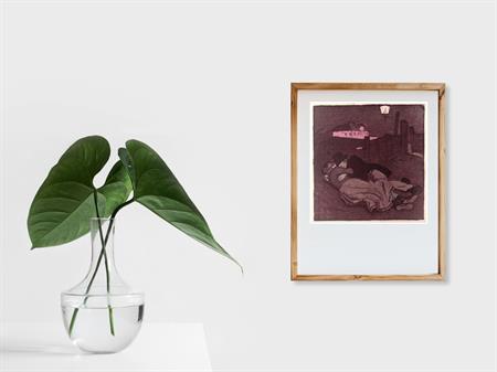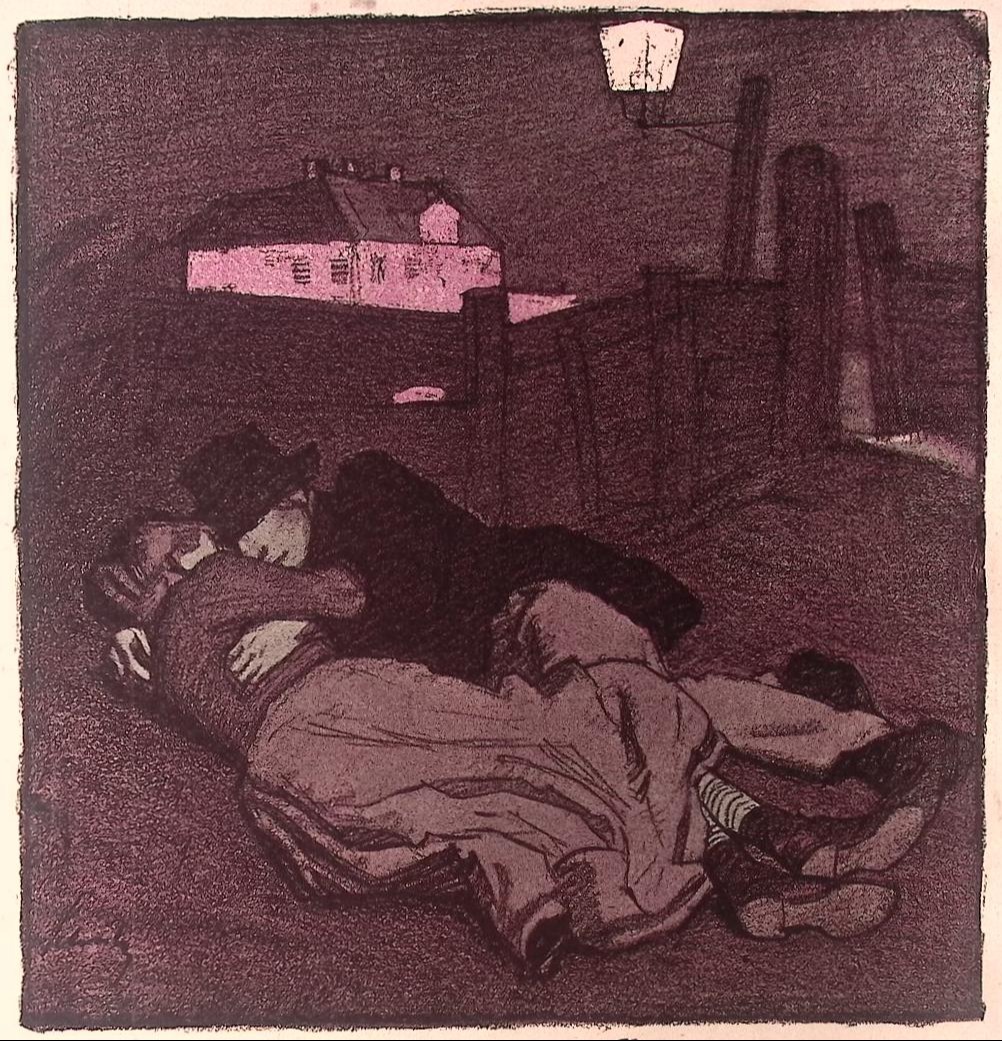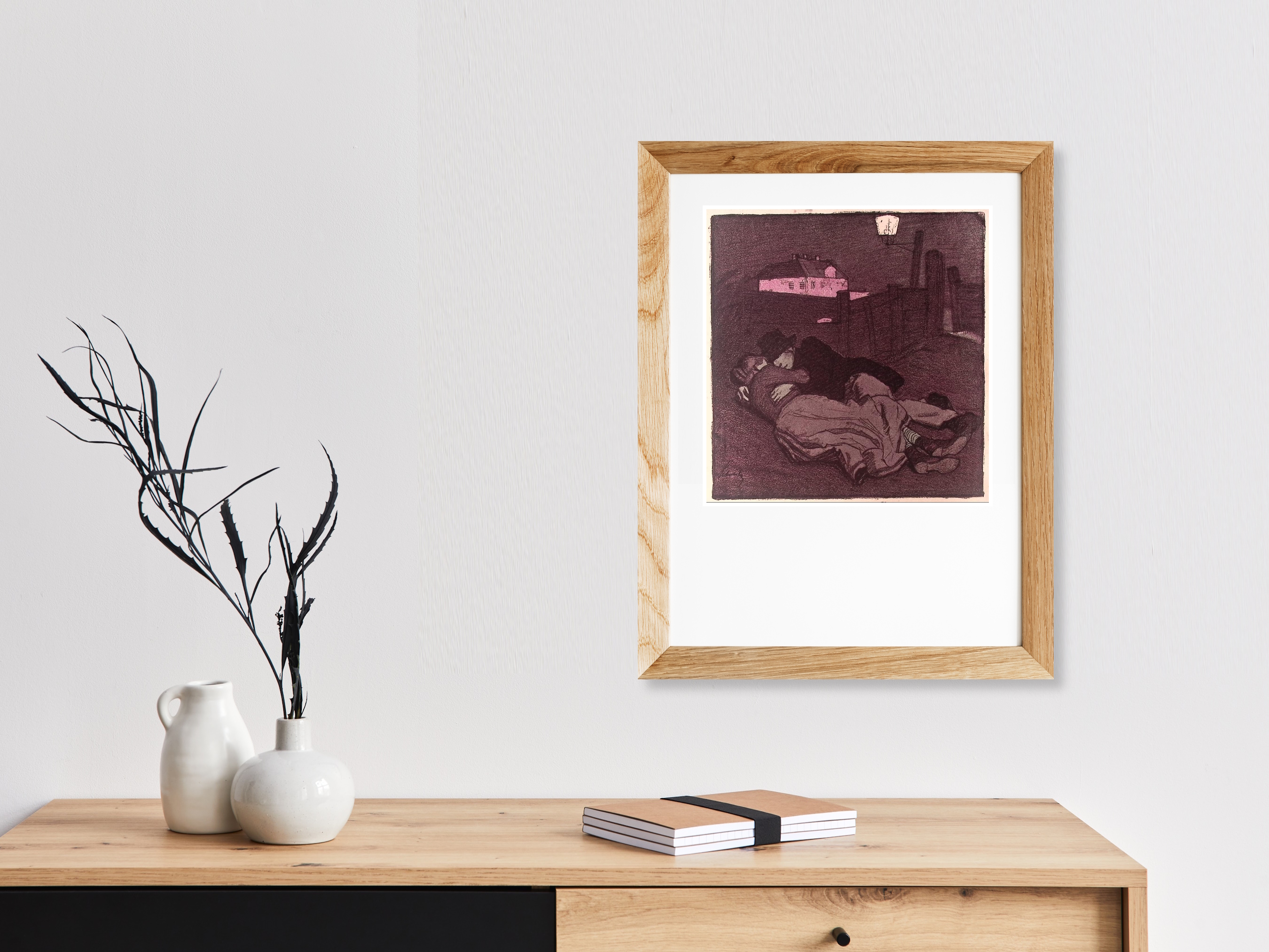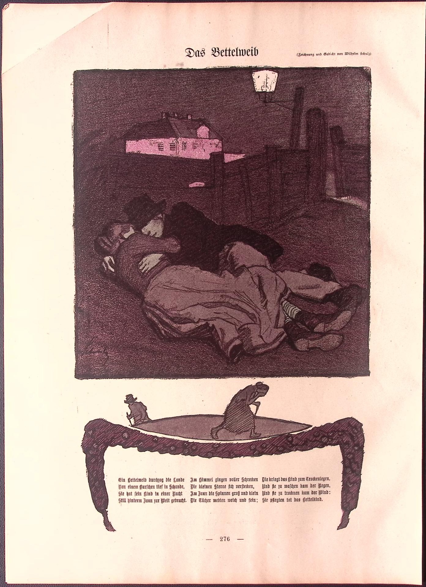 Een knuffel in de nacht. Bijzondere authentieke prent. Mooie inkijk in de mode en lifestyle van begin jaren 20e eeuw. Komt uit Duits weekblad Simplicissimus, waar elke week een mode, lifestyle of licht erotische prent werd afgedrukt. De prent wordt geleverd in passe partout in het formaat 30x40. Deze prent is gedrukt midden in de Jugendstil periode in 1903. Prent gemaakt door Wilhelm Schulz in weekblad Simplicissimus.