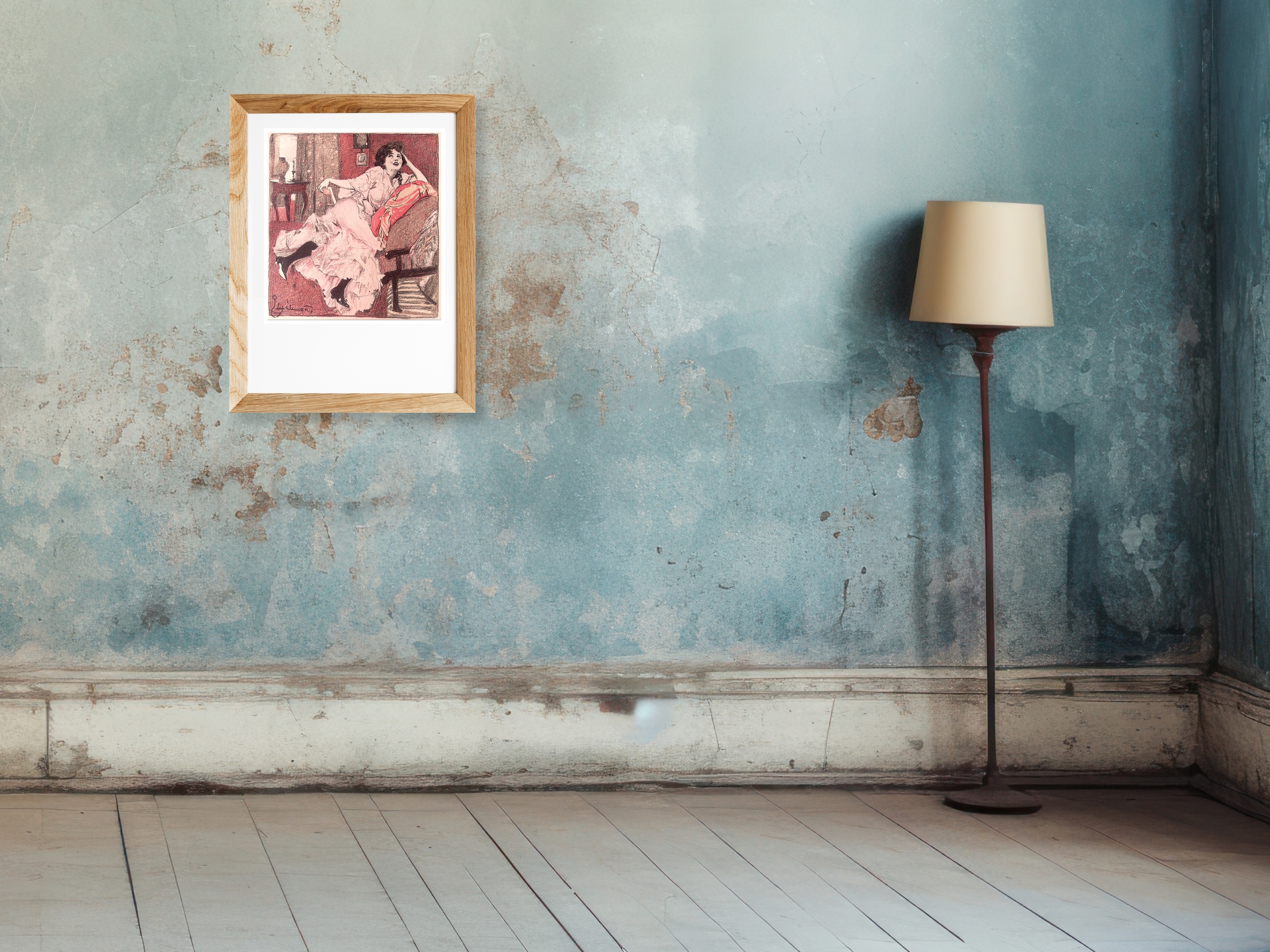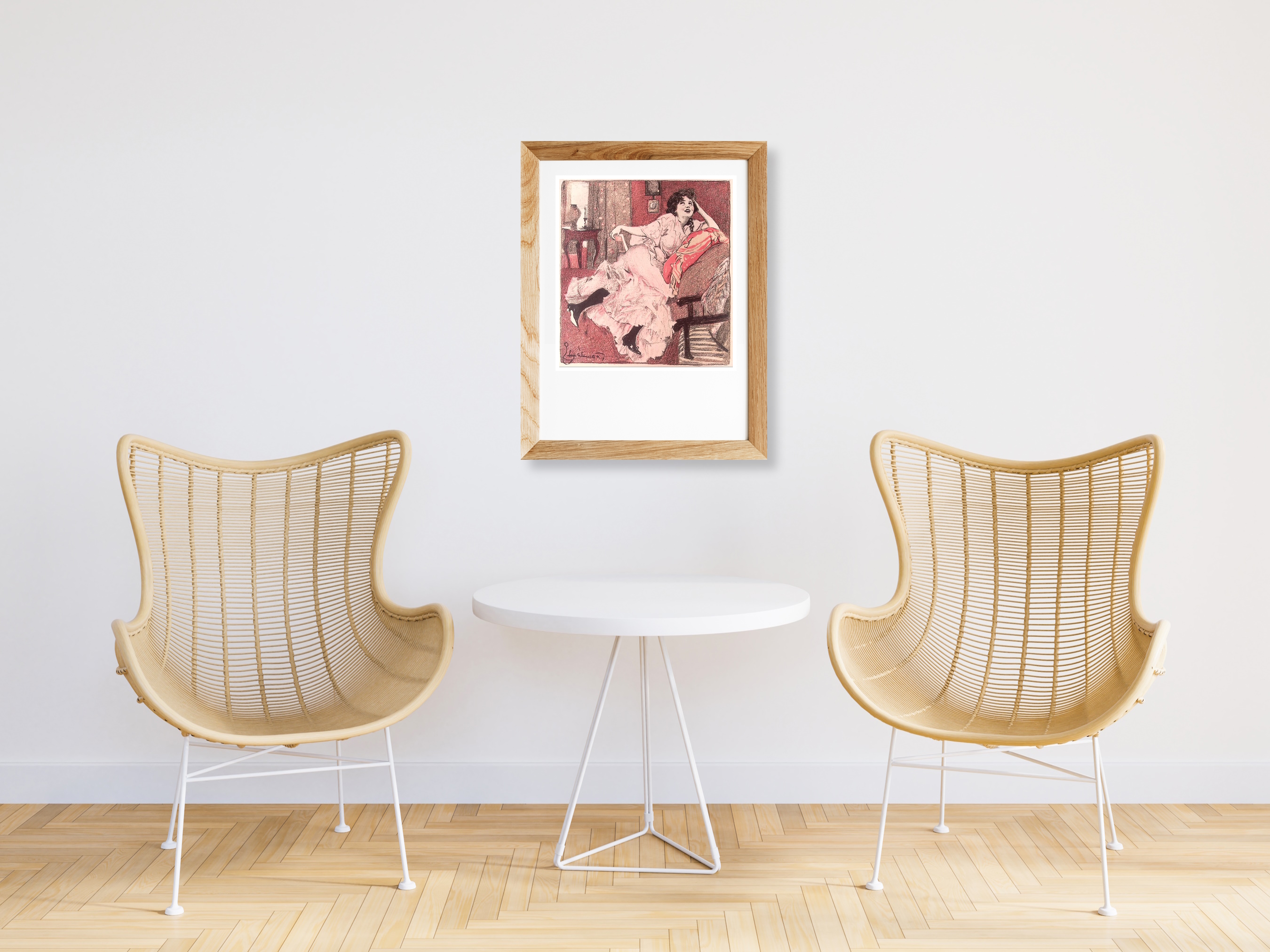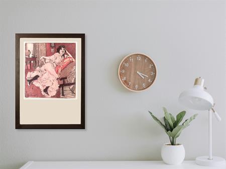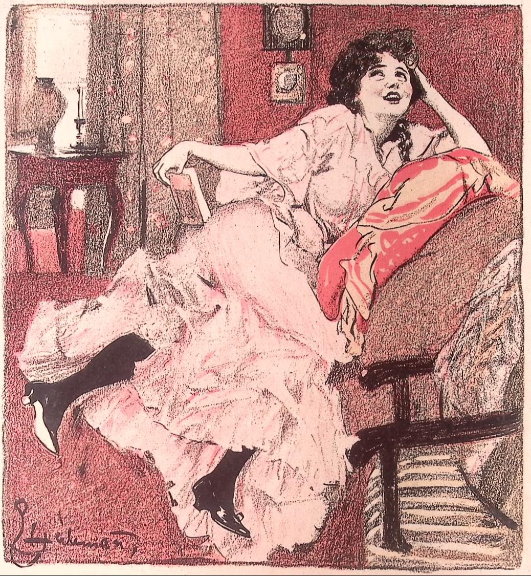 Roze mijmering. Originele prent uit de Jugendstil tijd. De prent is afkomstig uit het Duitse weekblad Simplicissimus. Mode, lifestyle en licht erotische prenten werden toegevoegd in een weekblad vol spotprenten. De prent wordt geleverd in passe partout in het formaat 30x40. De vintage prent is gedrukt in 1903, midden in de Art Nouveau periode. Prent gemaakt door Ernst Heilemann in weekblad Simplicissimus.
