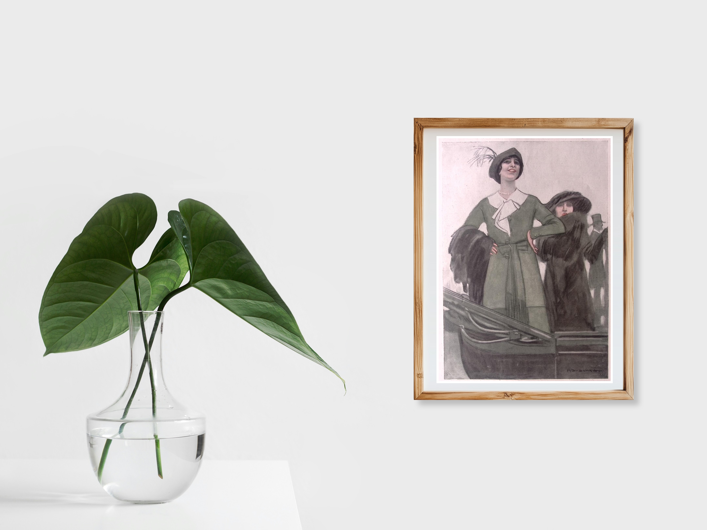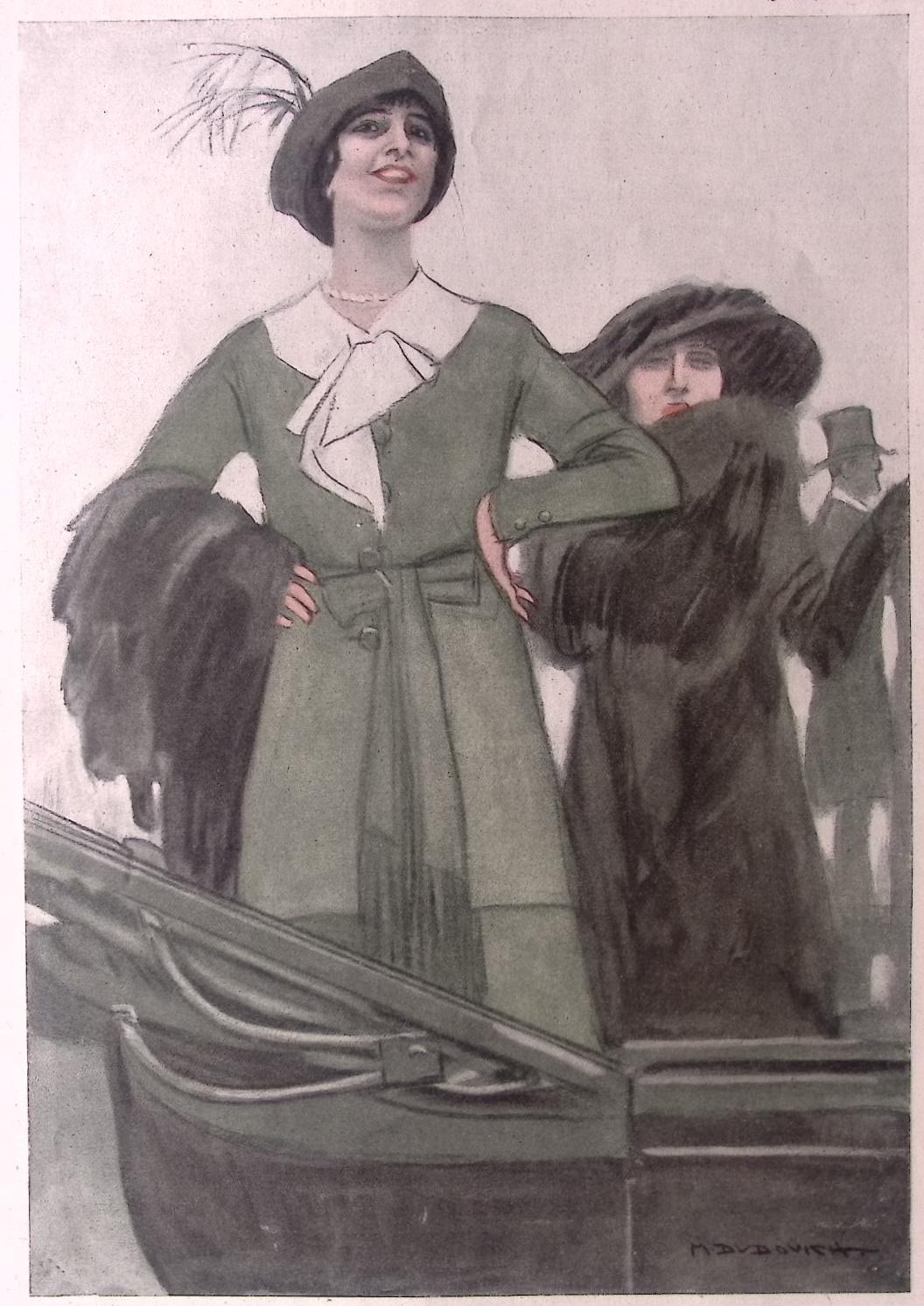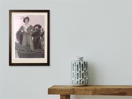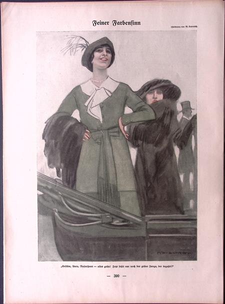 Pronkend groen. Originele prent uit de Jugendstil tijd. De prent is afkomstig uit het Duitse weekblad Simplicissimus. Mode, lifestyle en licht erotische prenten werden toegevoegd in een weekblad vol spotprenten. De prent wordt geleverd in passe partout in het formaat 30x40. De vintage prent is gedrukt in 1913, midden in de Art Nouveau periode. Prent gemaakt door Marcello Dudovich in weekblad Simplicissimus.
