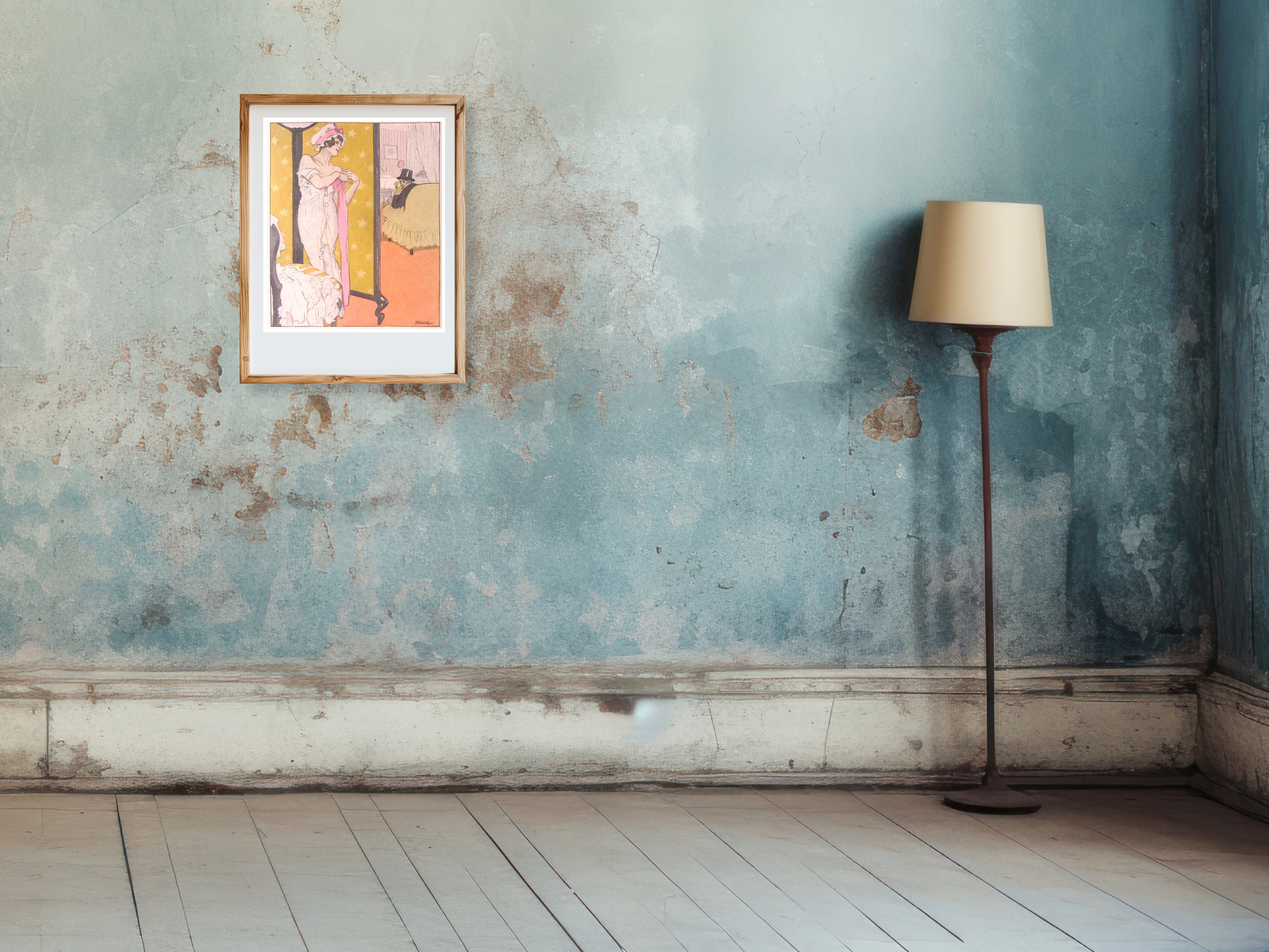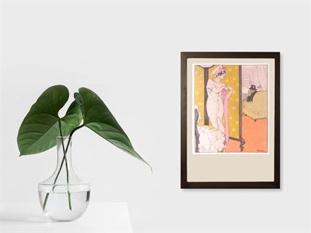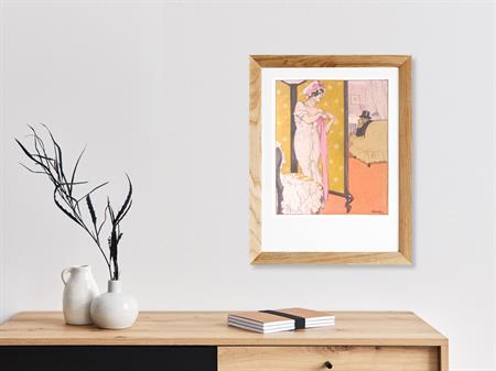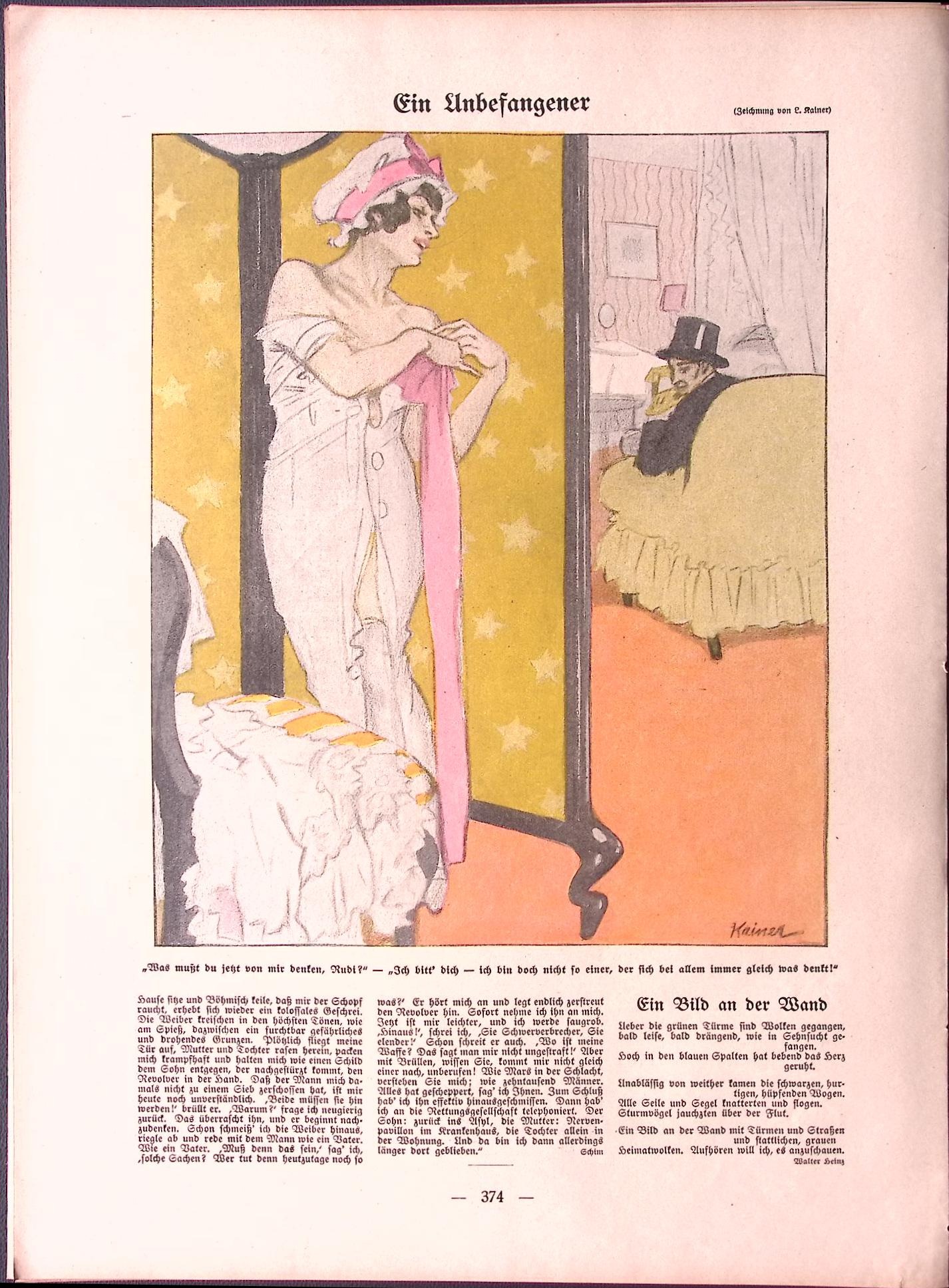 Achter het kamerscherm. Originele prent uit de Jugendstil tijd. De prent is afkomstig uit het Duitse weekblad Simplicissimus. Mode, lifestyle en licht erotische prenten werden toegevoegd in een weekblad vol spotprenten. De prent wordt geleverd in passe partout in het formaat 30x40. Deze prent is gedrukt midden in de Jugendstil periode in 1913. L. Rainer maakte deze prent voor in weekblad Simplicissimus.