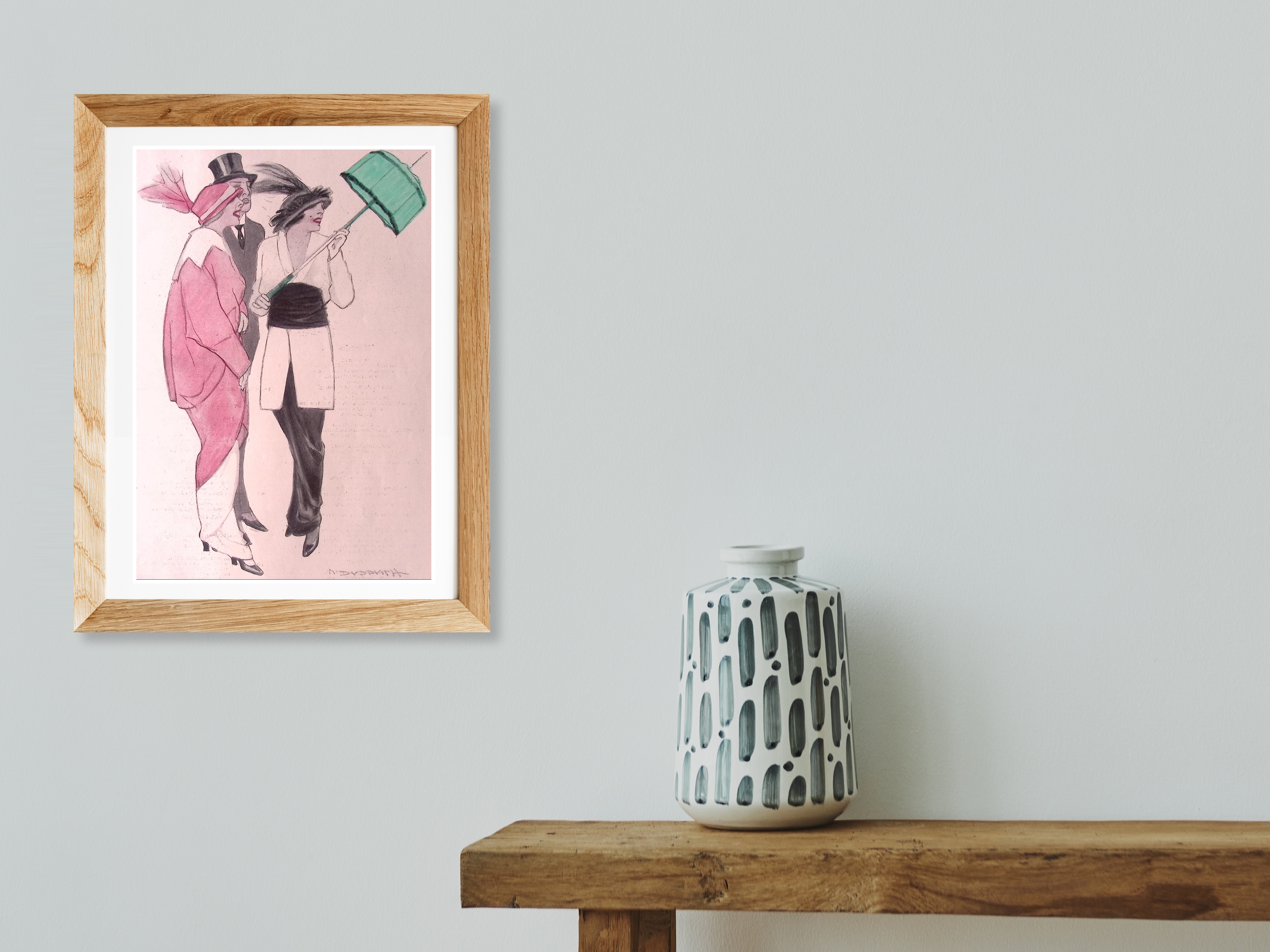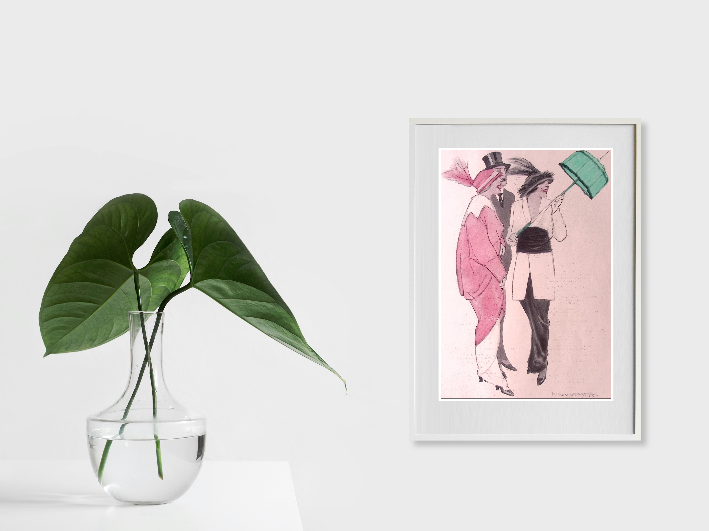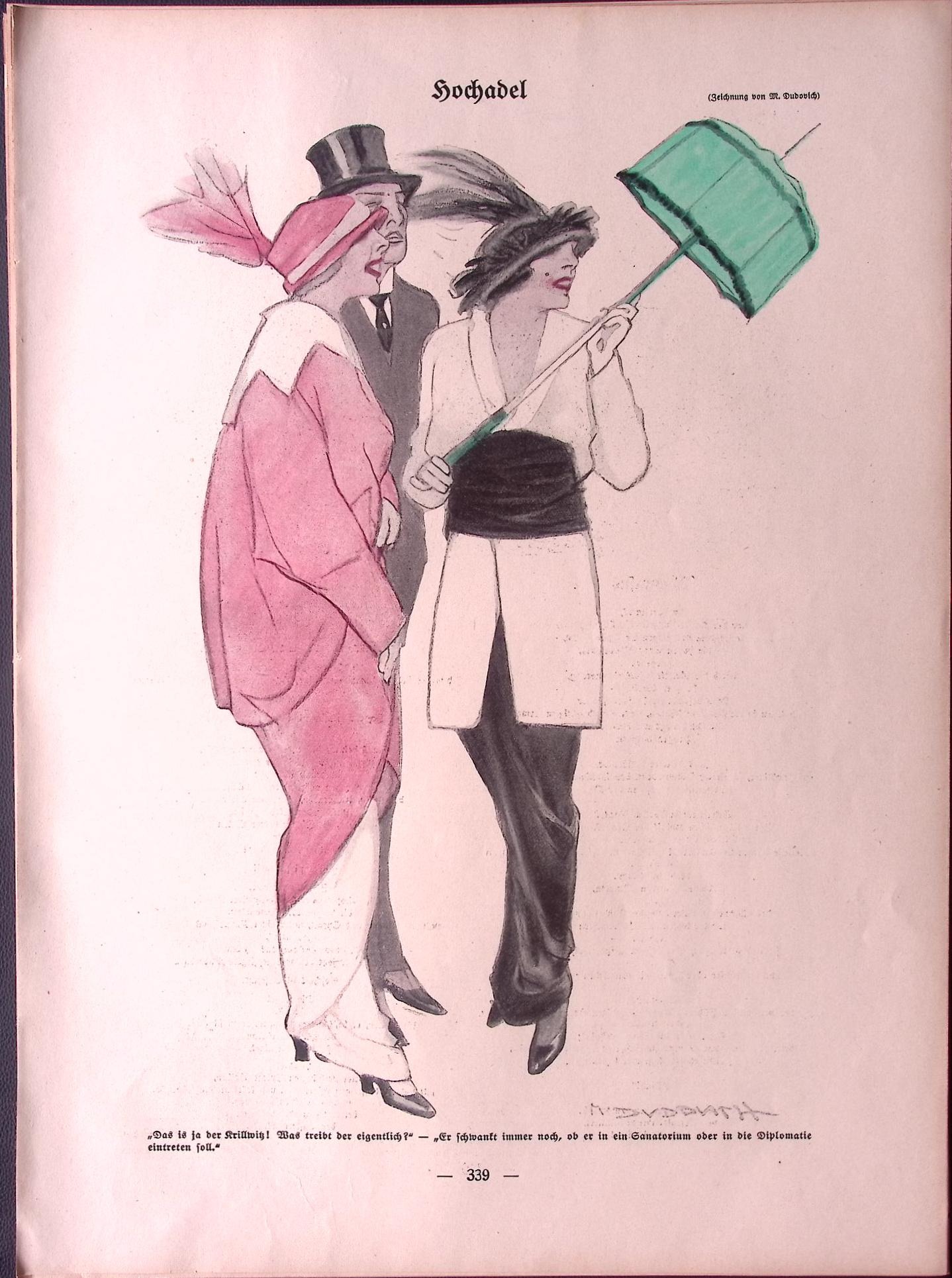 Modieuze adel. Bijzondere authentieke prent. Mooie inkijk in de mode en lifestyle van begin jaren 20e eeuw. Komt uit Duits weekblad Simplicissimus, waar elke week een mode, lifestyle of licht erotische prent werd afgedrukt. De prent wordt geleverd in passe partout in het formaat 30x40. Gedrukt in 1913, midden in de Art Nouveau periode. Marcello Dudovich maakte deze prent voor in weekblad Simplicissimus.