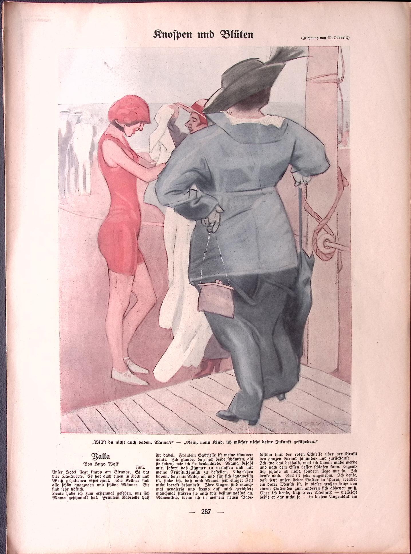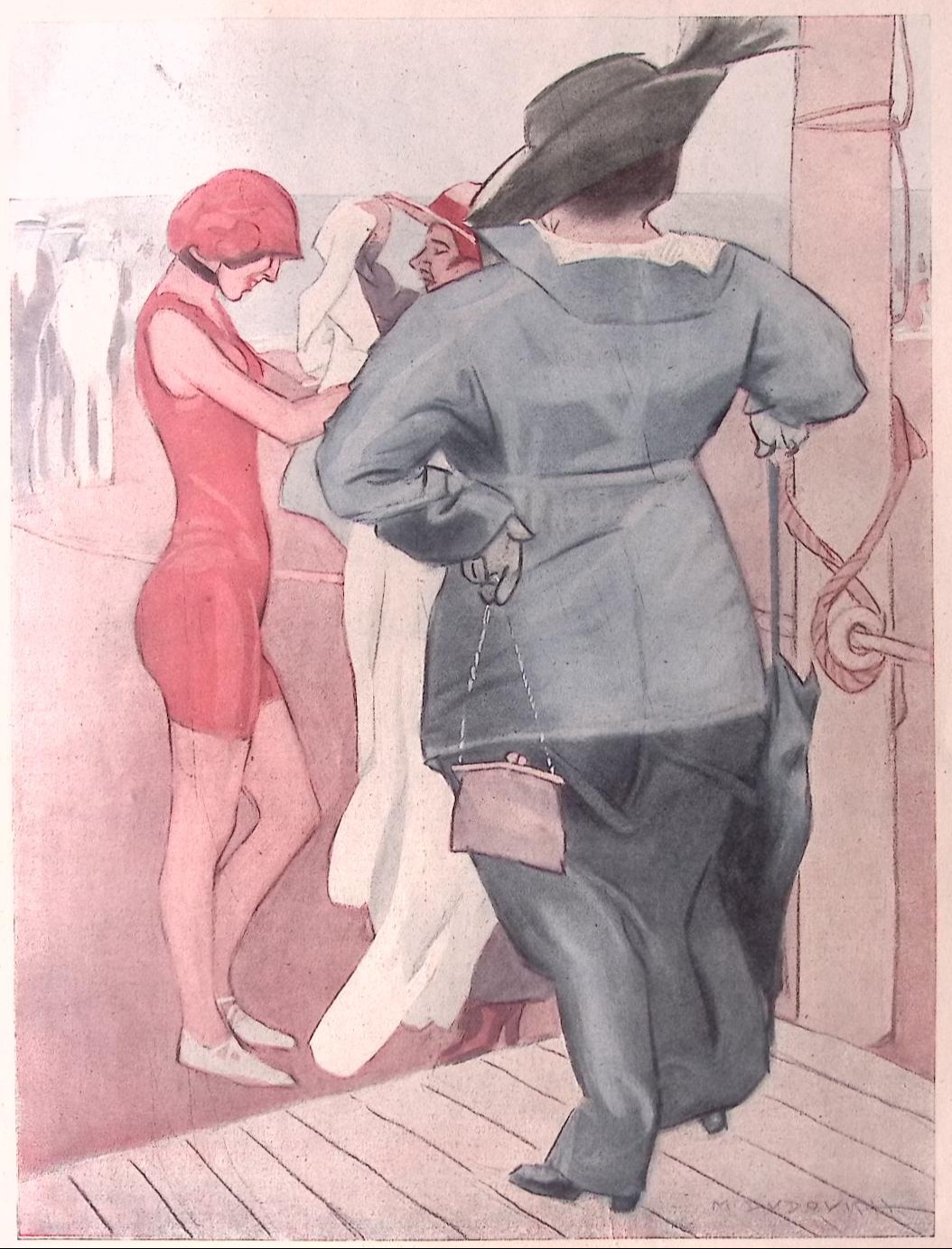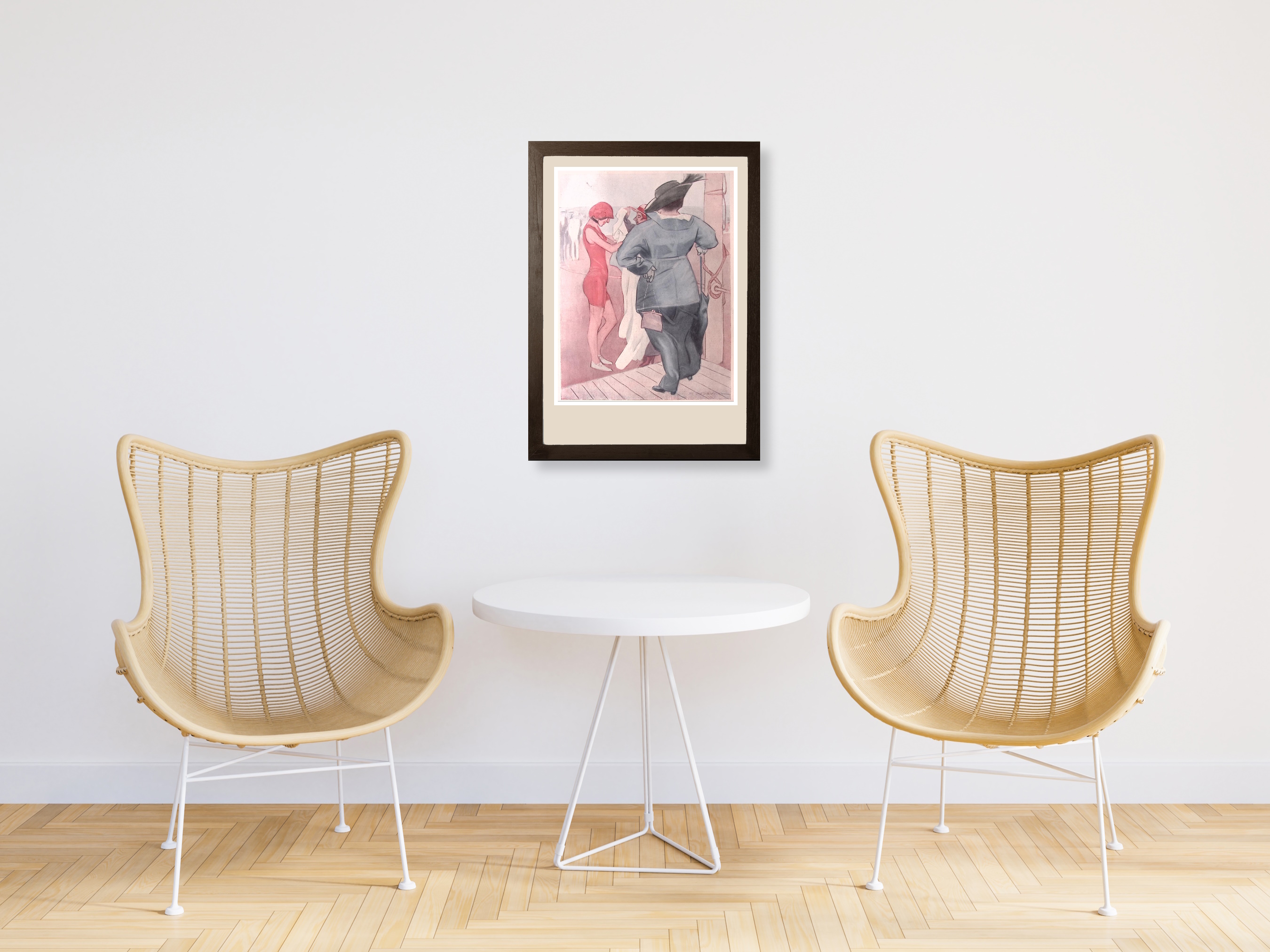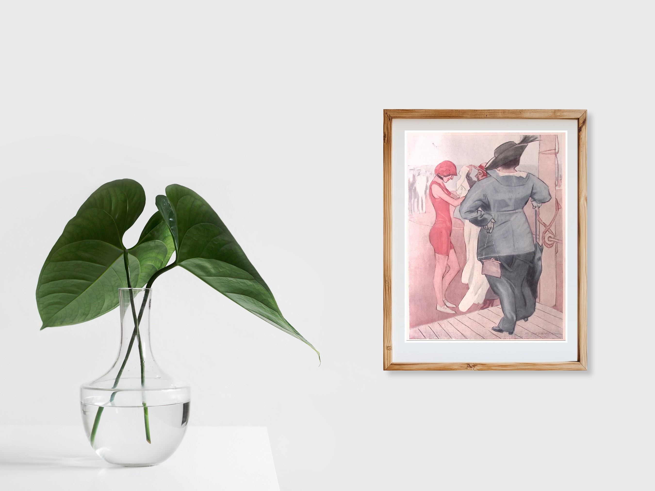 Aan het strand. Originele prent uit de Jugendstil tijd. De prent is afkomstig uit het Duitse weekblad Simplicissimus. Mode, lifestyle en licht erotische prenten werden toegevoegd in een weekblad vol spotprenten. De prent wordt geleverd in passe partout in het formaat 30x40. De vintage prent is gedrukt in 1913, midden in de Art Nouveau periode. Marcello Dudovich maakte deze prent voor in weekblad Simplicissimus.