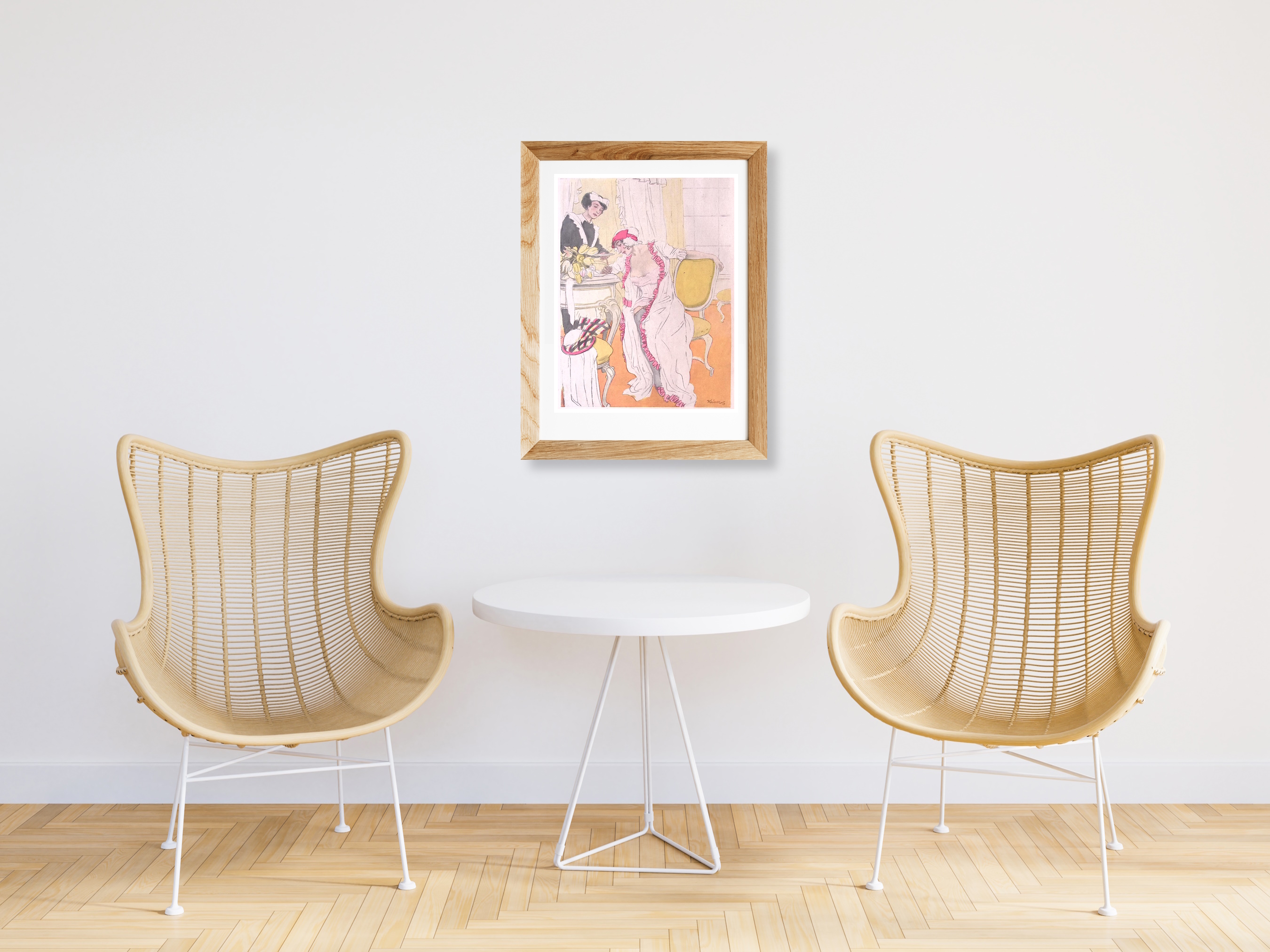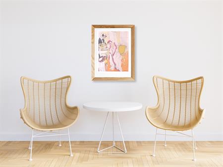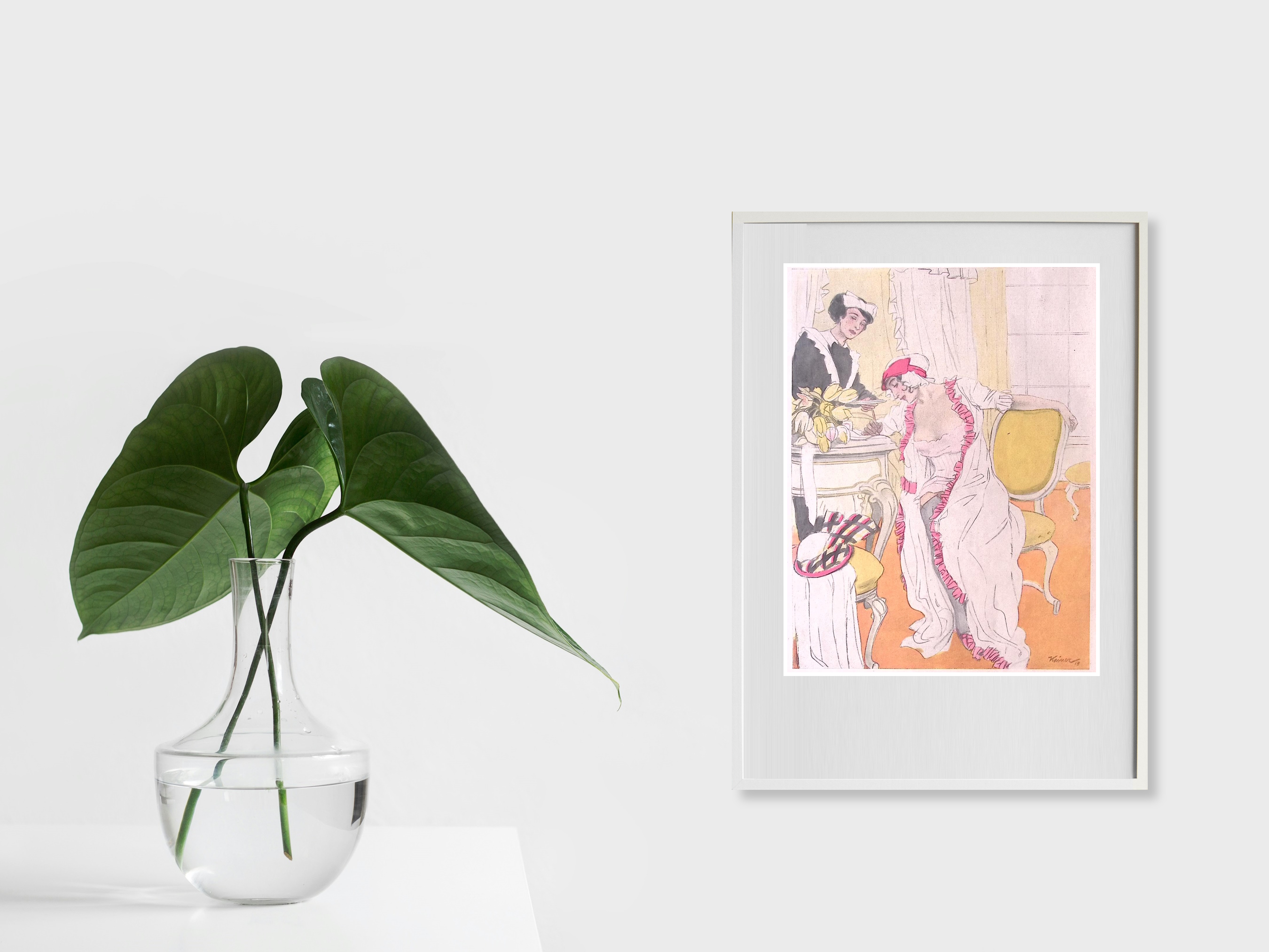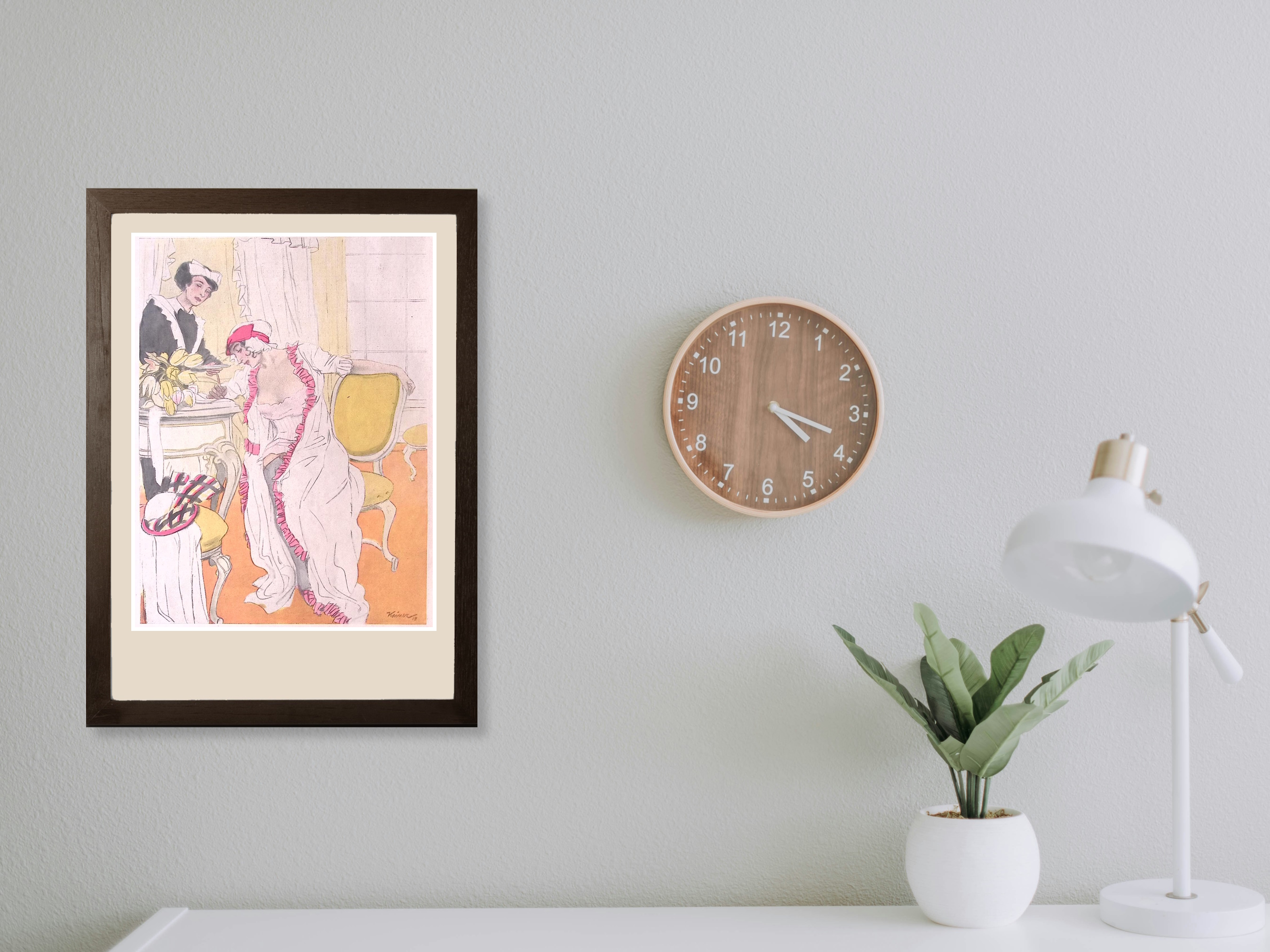 In nachtjapon. Leuke authentieke prent die een bijzondere inkijk geeft in de mode en lifestyle van begin jaren 20e eeuw. De prent is afkomstig uit het Duitse weekblad Simplicissimus. Elke week werd er een mode, lifestyle of licht erotische prent afgedrukt. De prent wordt geleverd in passe partout in het formaat 30x40. De vintage prent is gedrukt in 1913, midden in de Art Nouveau periode. Prent gemaakt door L. Rainer in weekblad Simplicissimus.