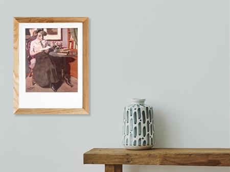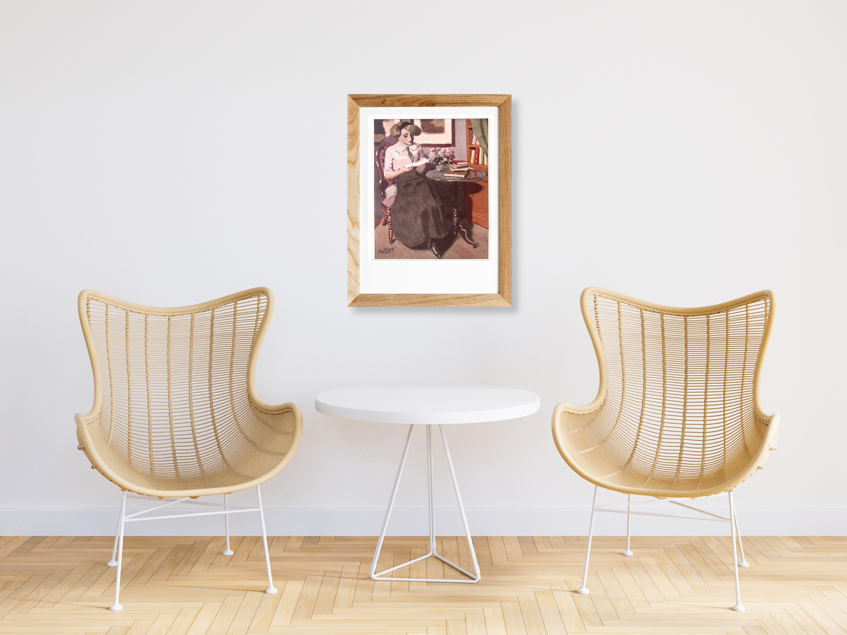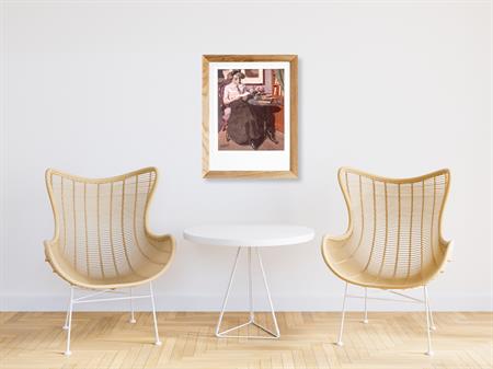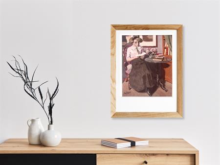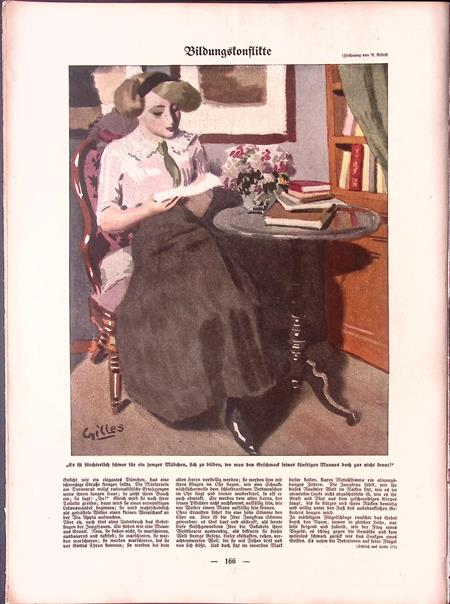 Lezen. Bijzondere authentieke prent. Mooie inkijk in de mode en lifestyle van begin jaren 20e eeuw. Komt uit Duits weekblad Simplicissimus, waar elke week een mode, lifestyle of licht erotische prent werd afgedrukt. De prent wordt geleverd in passe partout in het formaat 30x40. Deze prent is gedrukt midden in de Jugendstil periode in 1913. Nicolas Gilles maakte deze prent voor in weekblad Simplicissimus.
