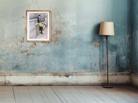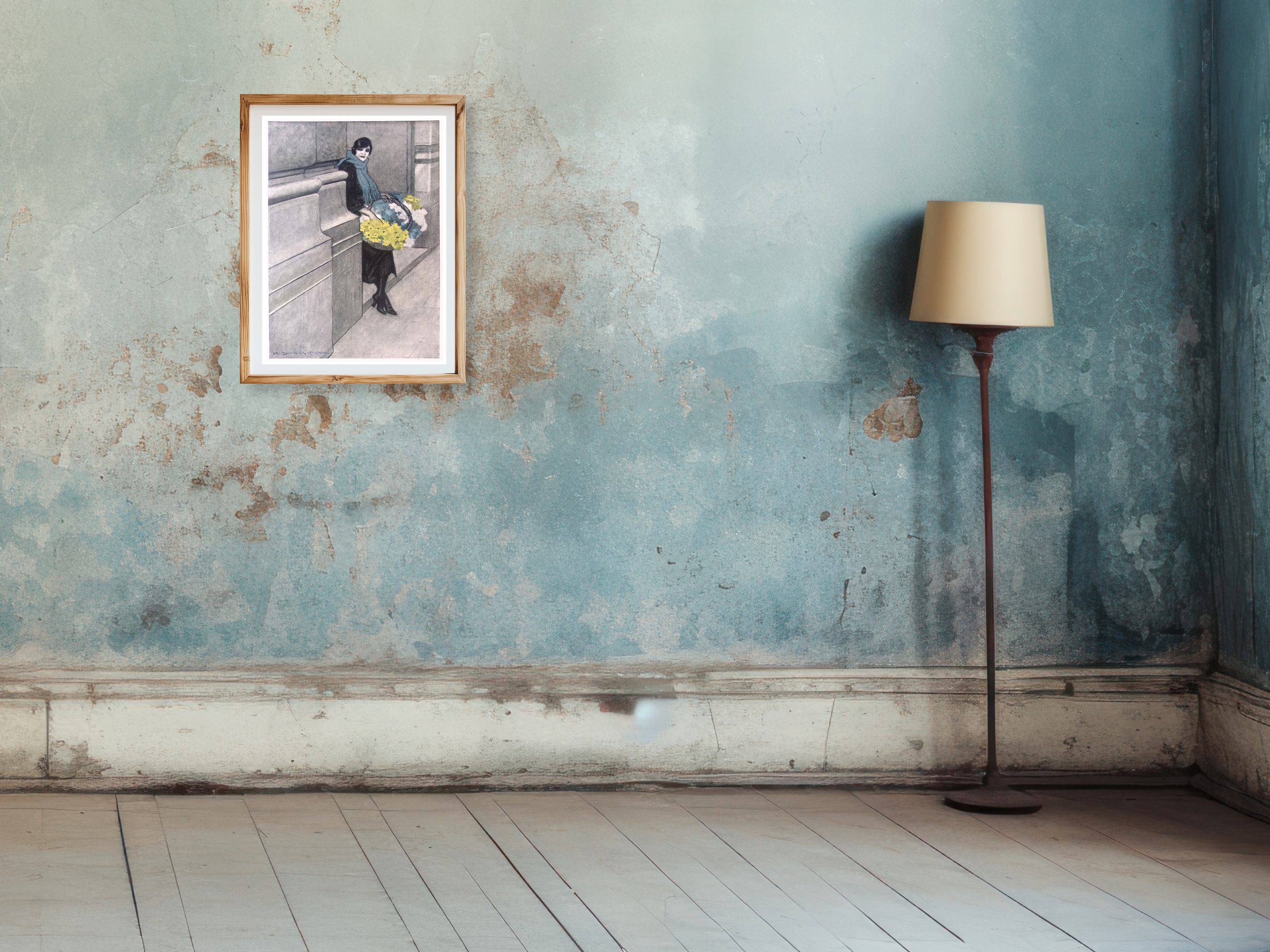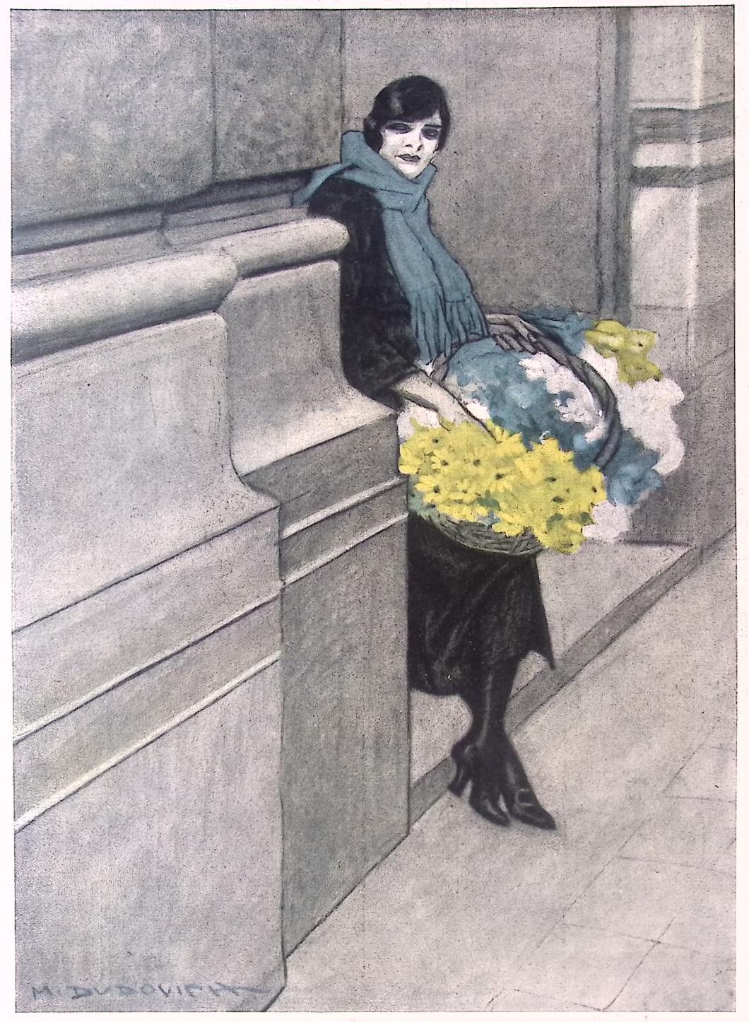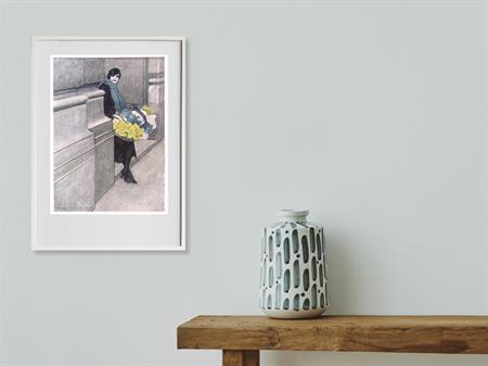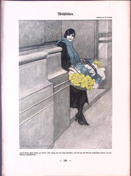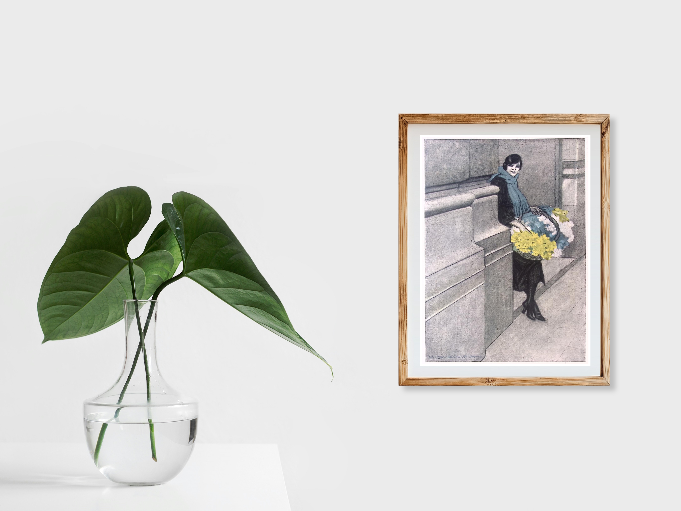 Bloemenmand. Leuke authentieke prent die een bijzondere inkijk geeft in de mode en lifestyle van begin jaren 20e eeuw. De prent is afkomstig uit het Duitse weekblad Simplicissimus. Elke week werd er een mode, lifestyle of licht erotische prent afgedrukt. De prent wordt geleverd in passe partout in het formaat 30x40. Deze prent is gedrukt midden in de Jugendstil periode in 1913. Prent gemaakt door Marcello Dudovich in weekblad Simplicissimus.