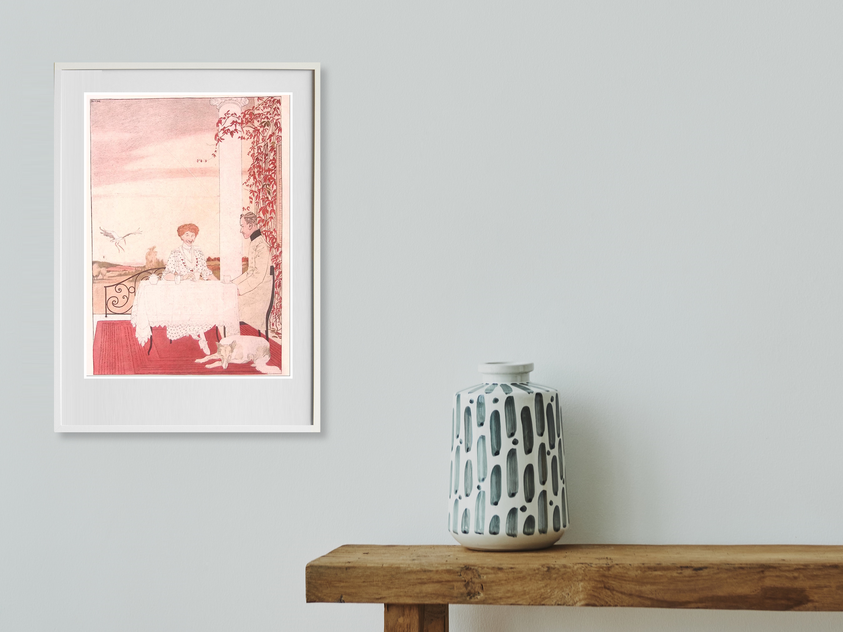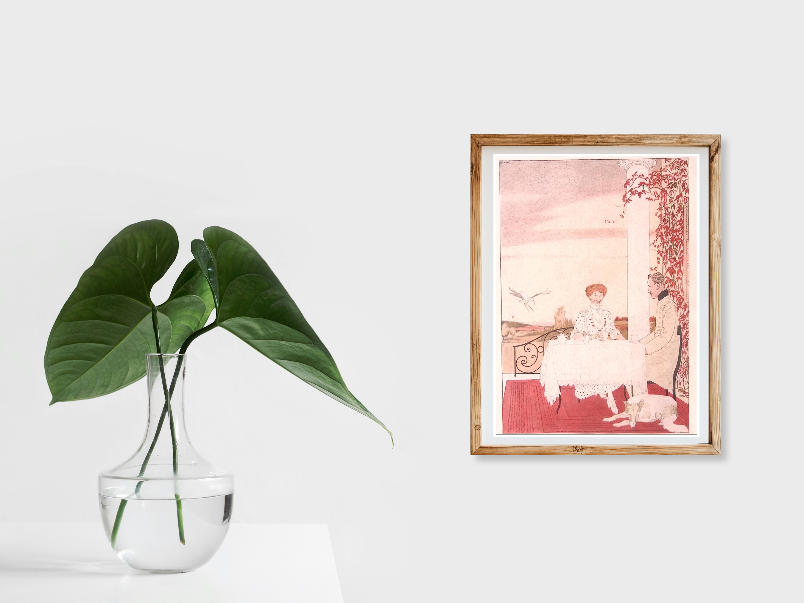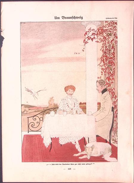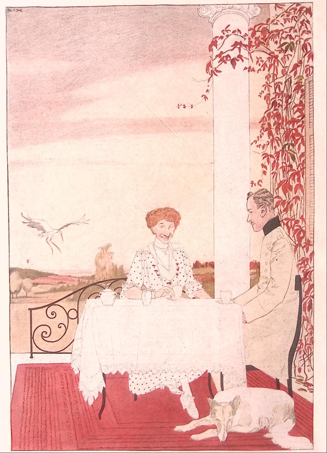 Aan de thee. Originele prent uit de Jugendstil tijd. De prent is afkomstig uit het Duitse weekblad Simplicissimus. Mode, lifestyle en licht erotische prenten werden toegevoegd in een weekblad vol spotprenten. De prent wordt geleverd in passe partout in het formaat 30x40. Gedrukt in 1913, midden in de Art Nouveau periode. Prent gemaakt door Ragnvald Blix in weekblad Simplicissimus.