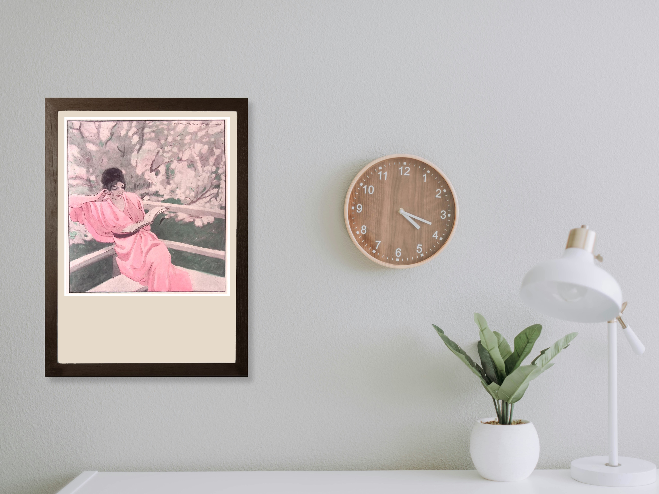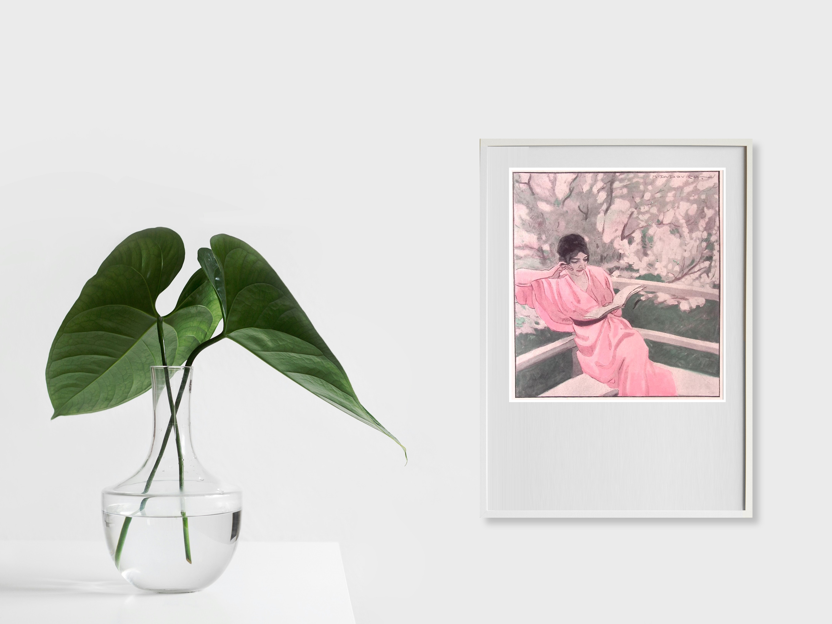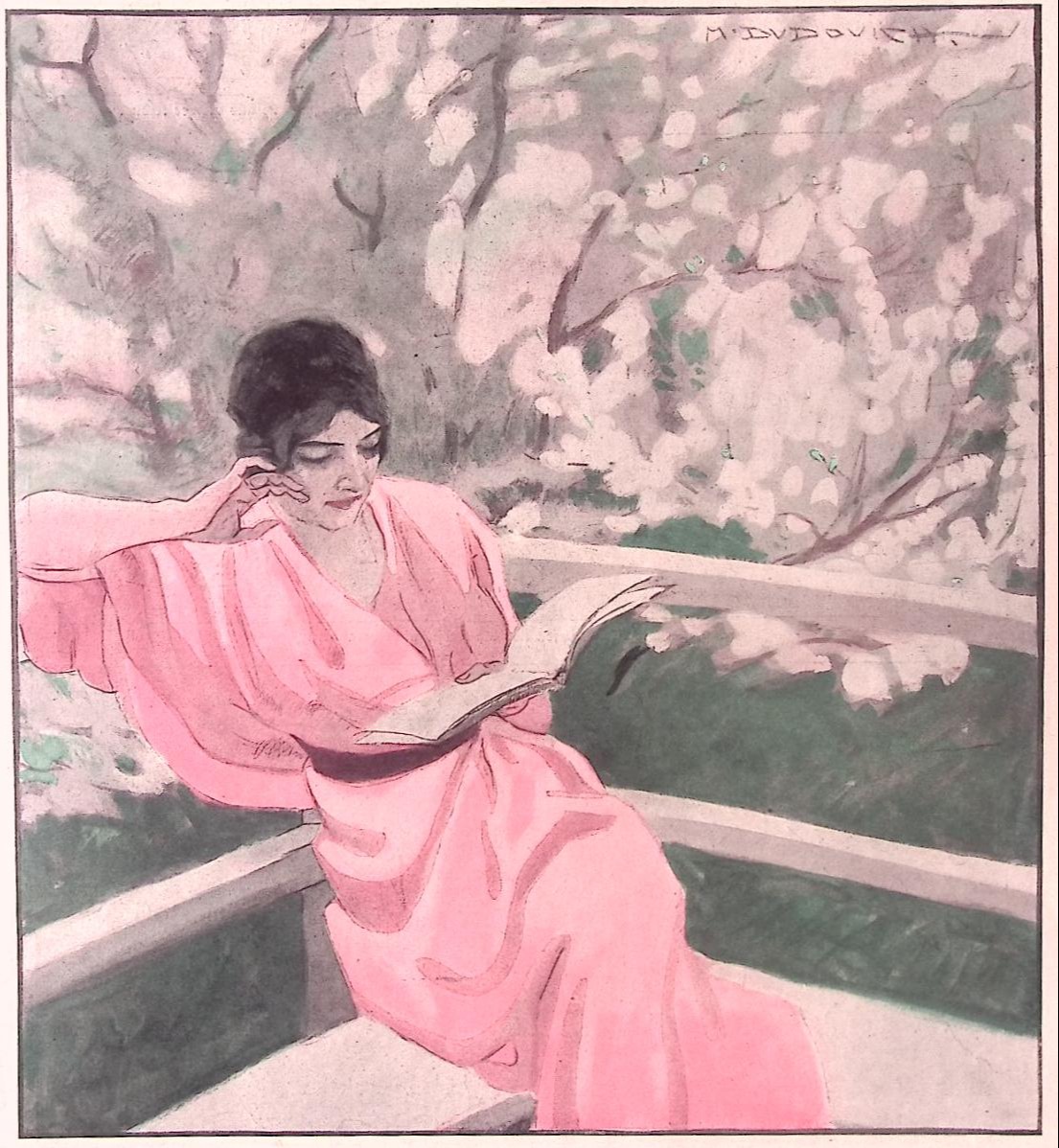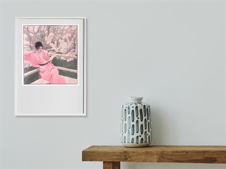 Lezen. Originele prent uit de Jugendstil tijd. De prent is afkomstig uit het Duitse weekblad Simplicissimus. Mode, lifestyle en licht erotische prenten werden toegevoegd in een weekblad vol spotprenten. De prent wordt geleverd in passe partout in het formaat 30x40. Deze prent is gedrukt midden in de Jugendstil periode in 1913. Prent gemaakt door Marcello Dudovich in weekblad Simplicissimus.