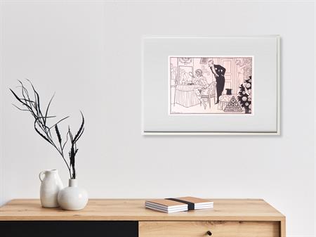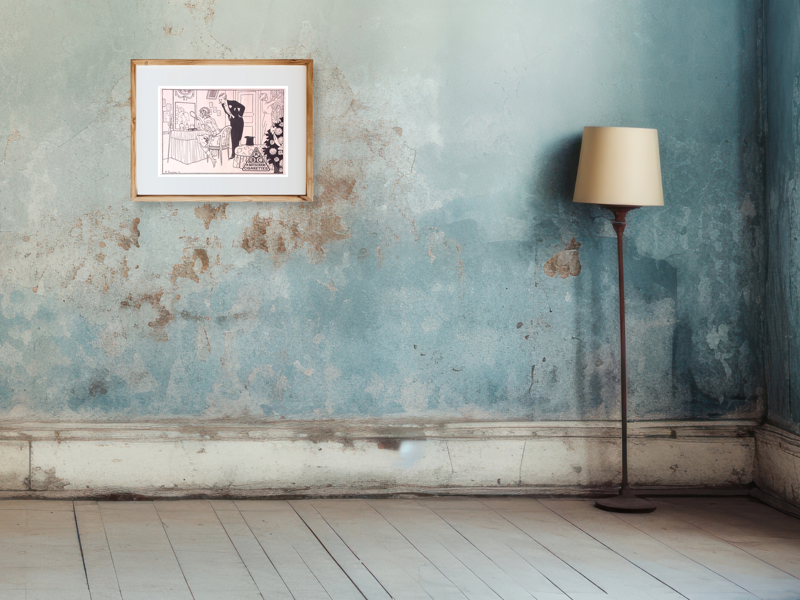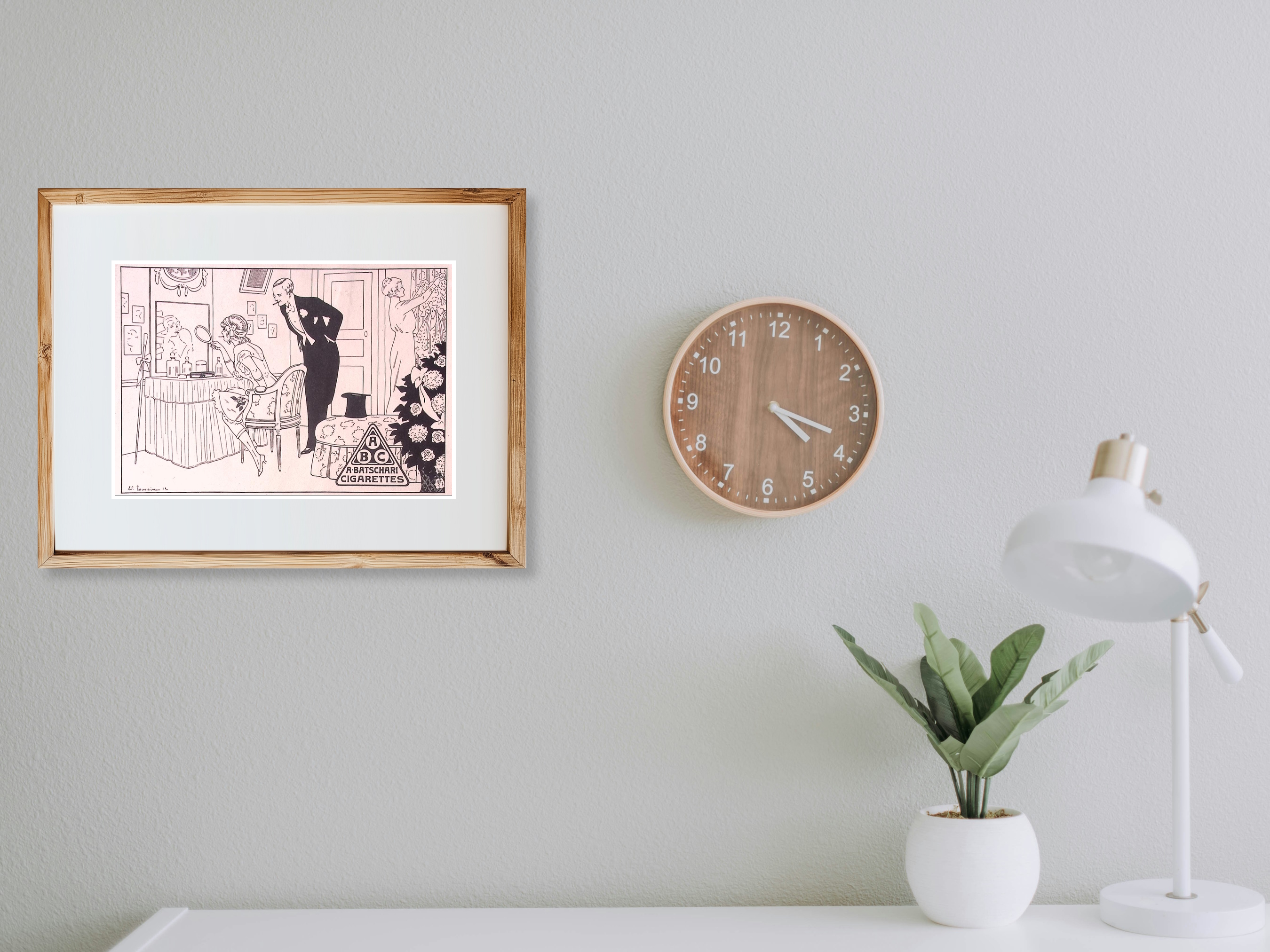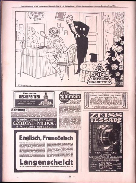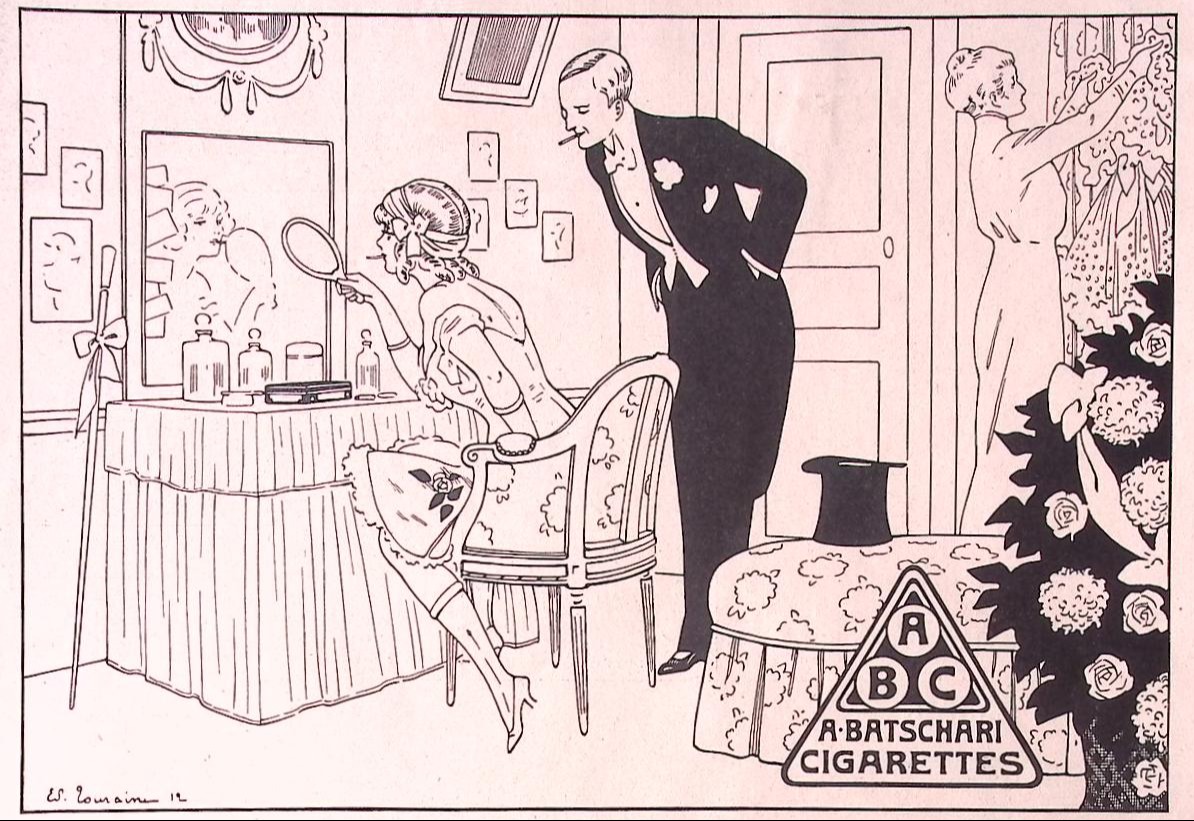 Batschari reclame. Bijzondere authentieke prent. Mooie inkijk in de mode en lifestyle van begin jaren 20e eeuw. Komt uit Duits weekblad Simplicissimus, waar elke week een mode, lifestyle of licht erotische prent werd afgedrukt. De prent wordt geleverd in passe partout in het formaat 30x40. Gedrukt in 1913, midden in de Art Nouveau periode.
