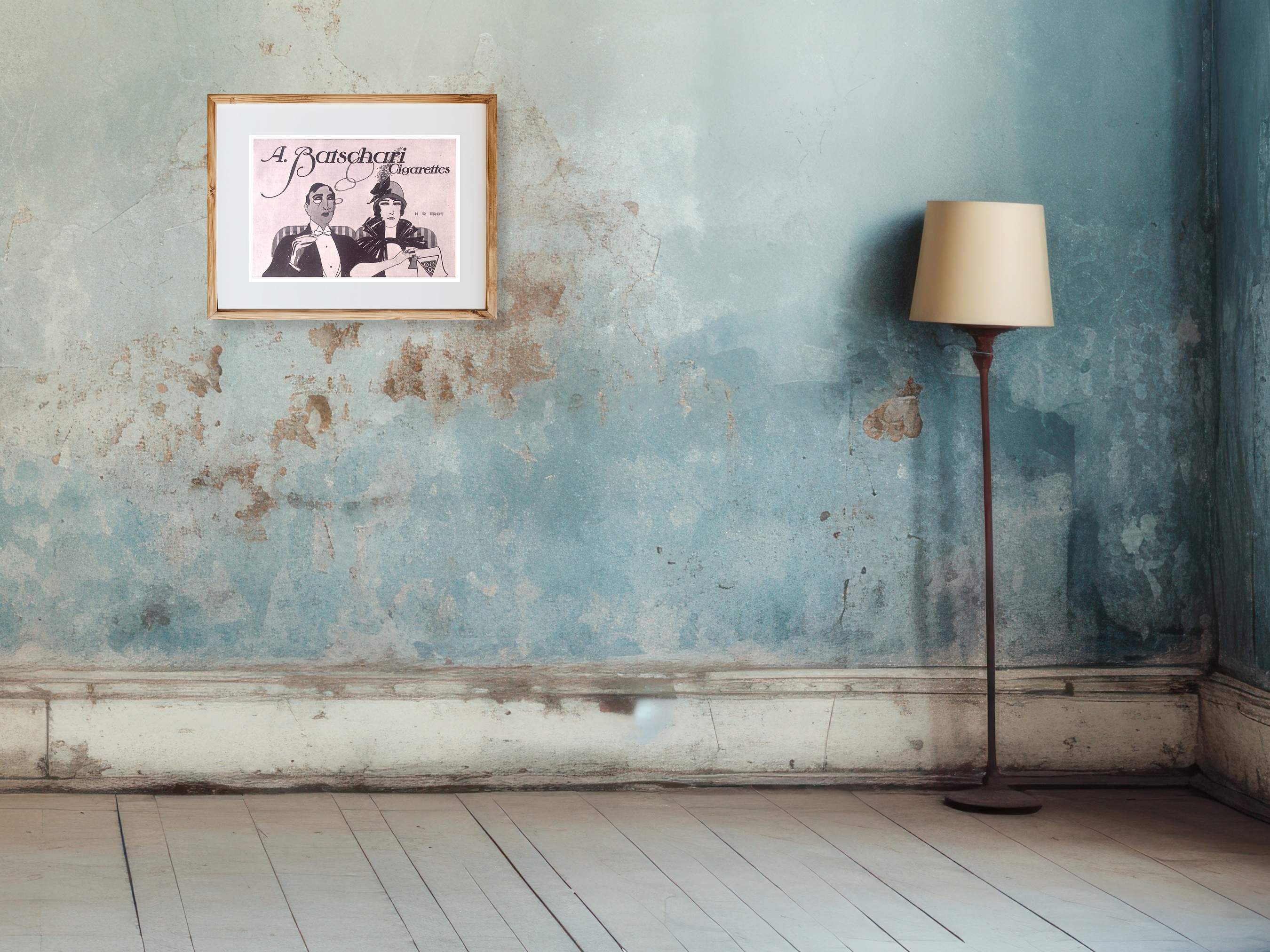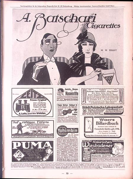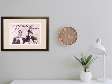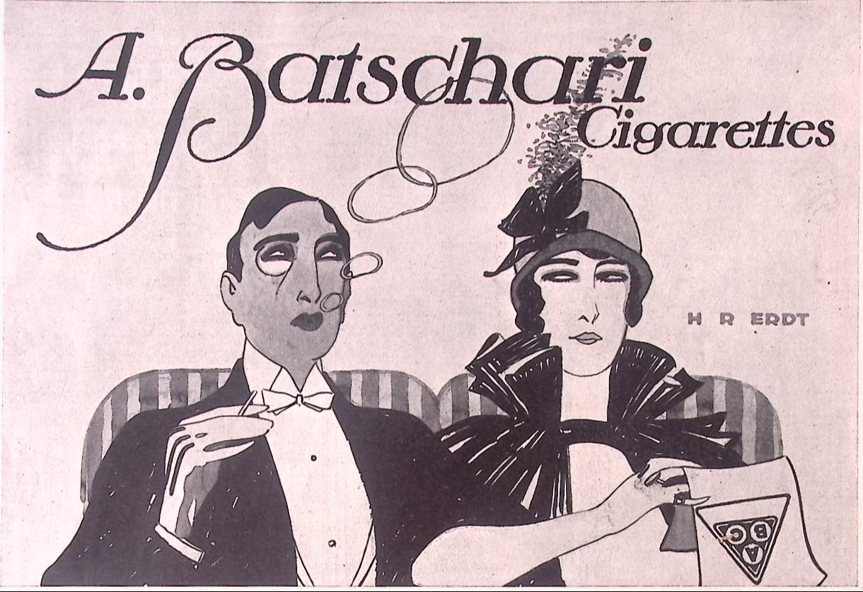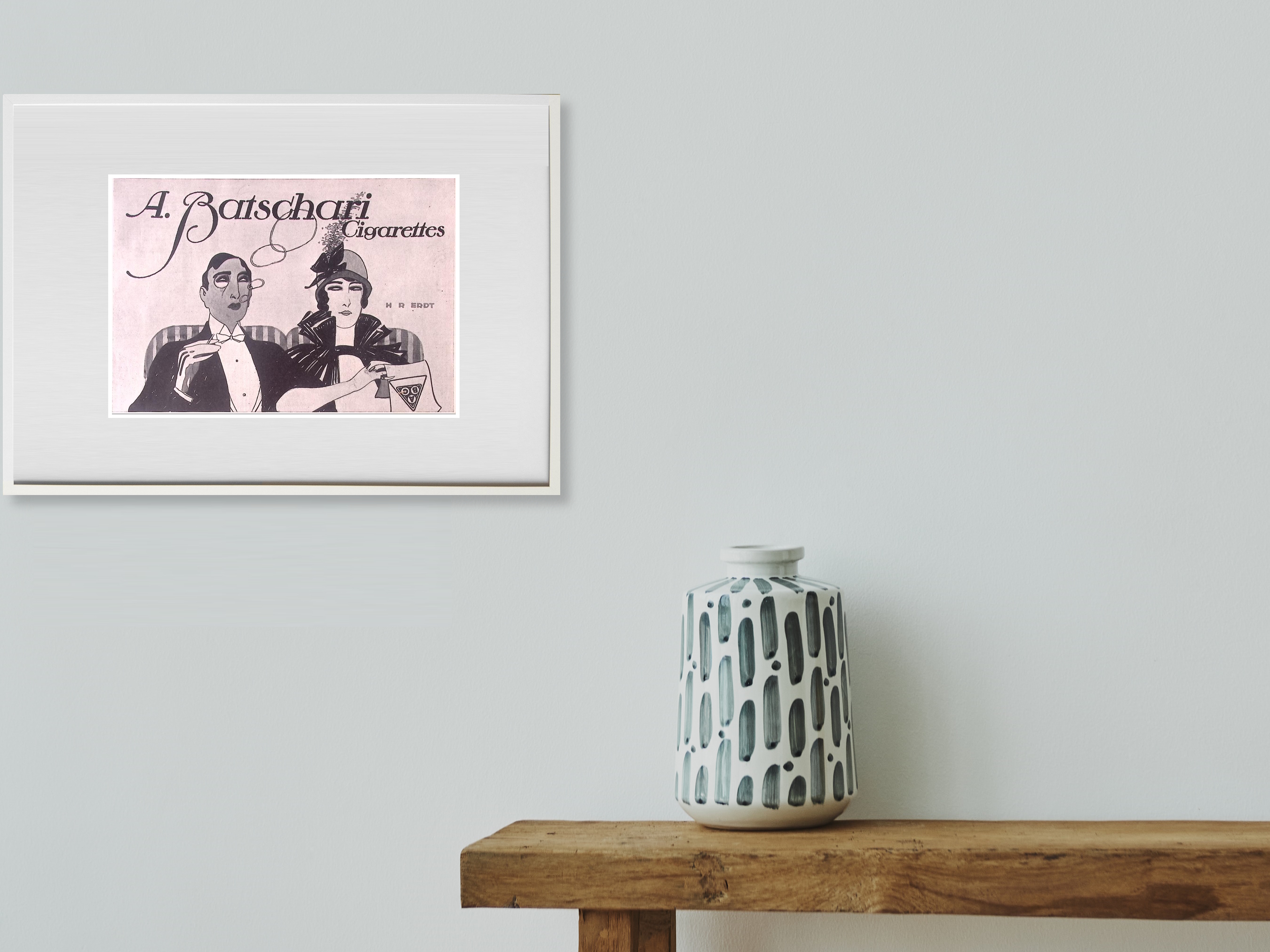 Batschari reclame. Originele prent uit de Jugendstil tijd. De prent is afkomstig uit het Duitse weekblad Simplicissimus. Mode, lifestyle en licht erotische prenten werden toegevoegd in een weekblad vol spotprenten. De prent wordt geleverd in passe partout in het formaat 30x40. Deze prent is gedrukt midden in de Jugendstil periode in 1913.