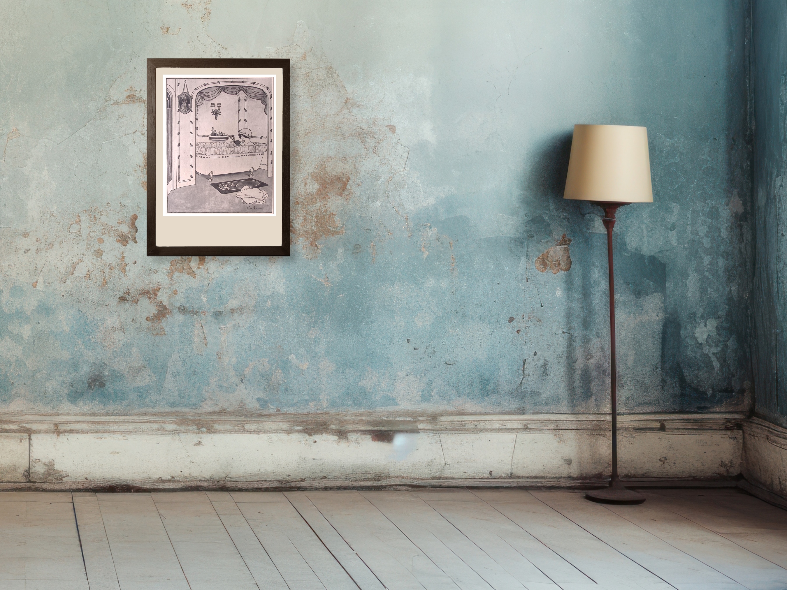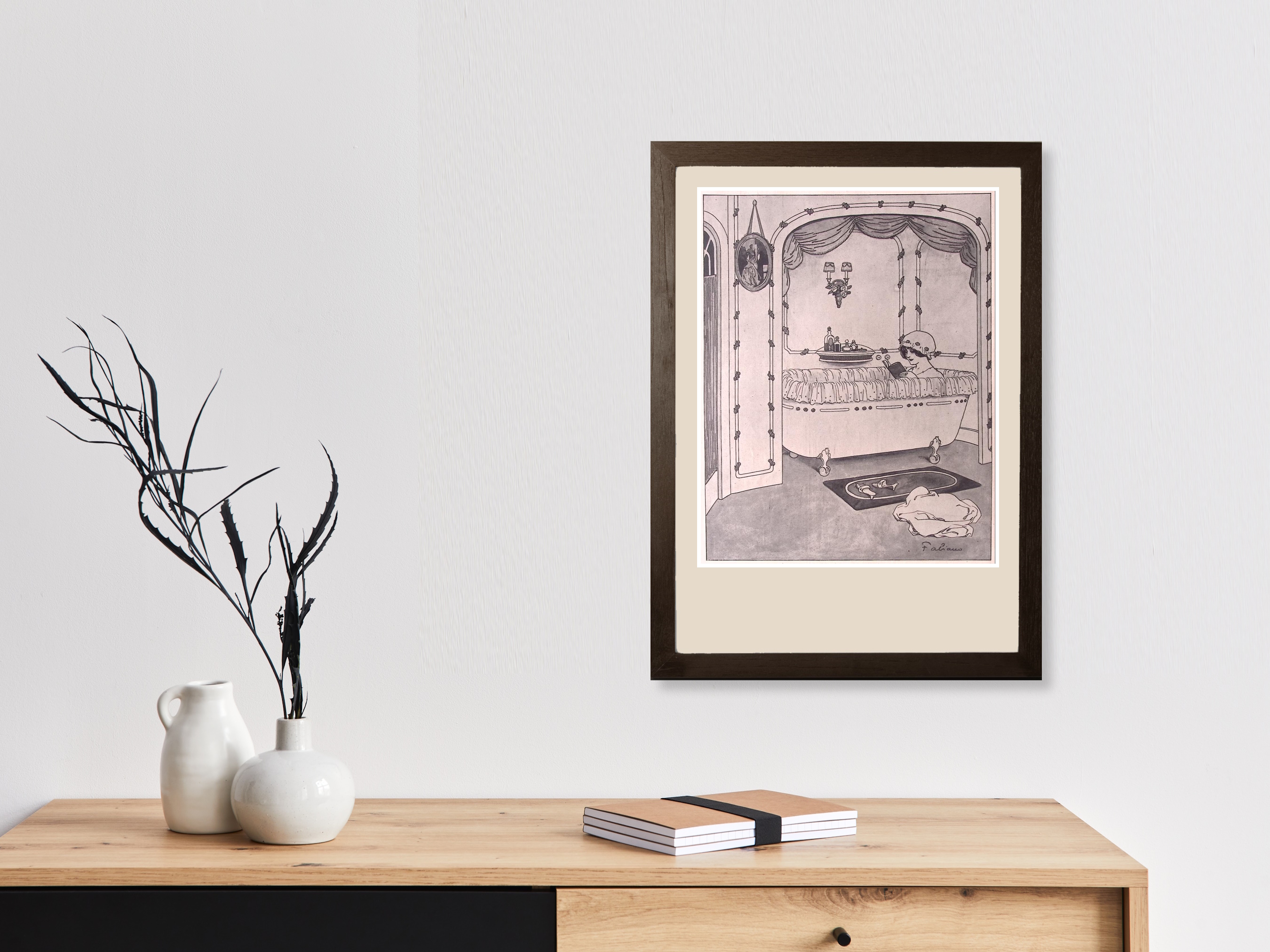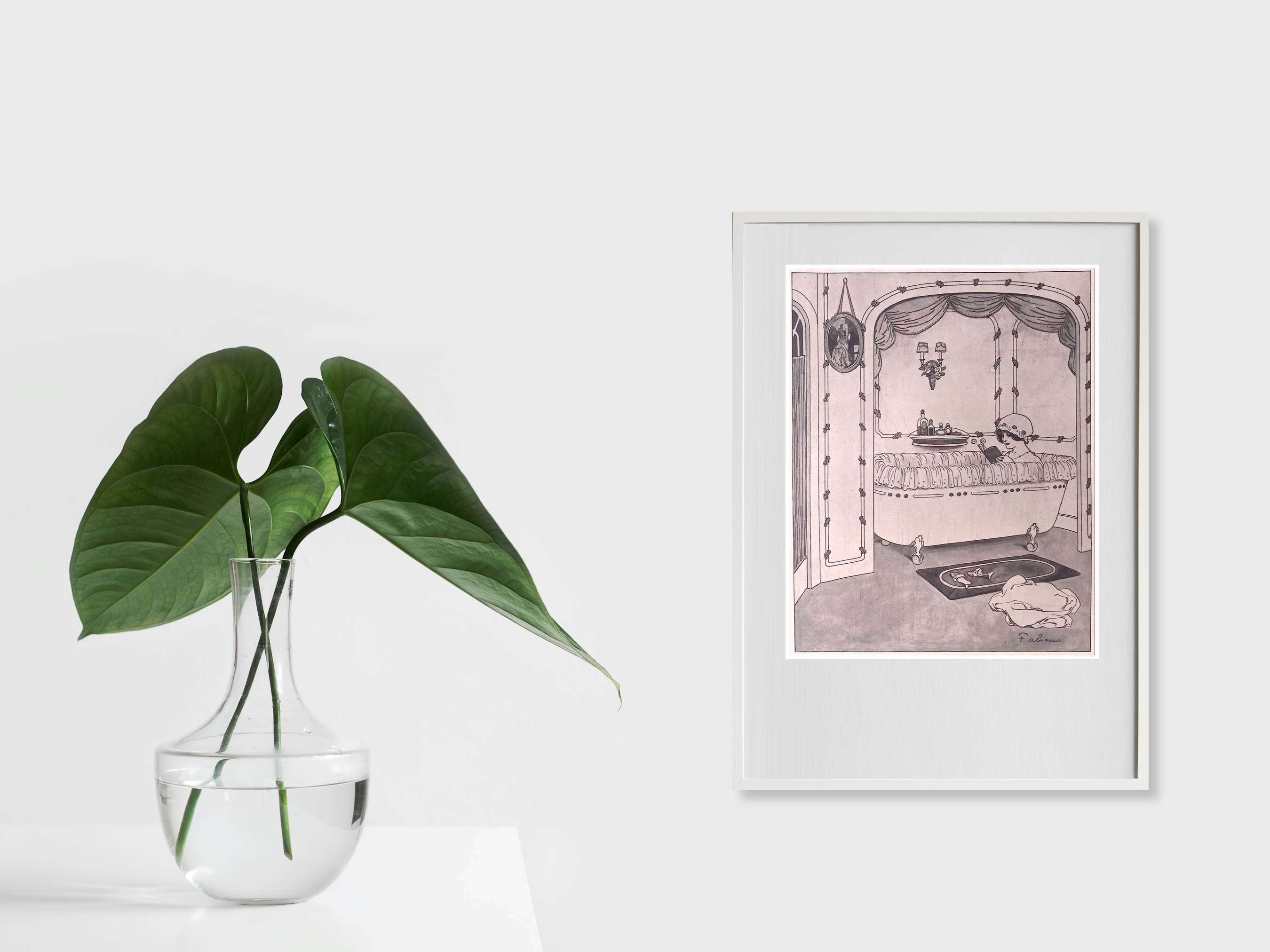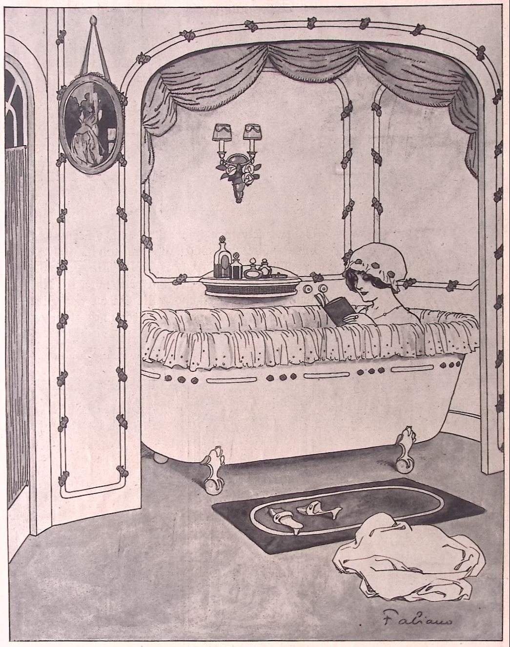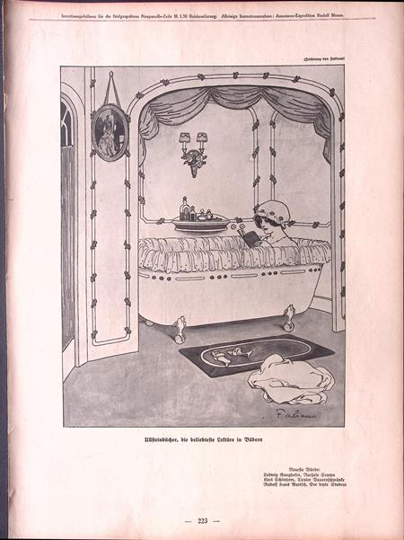 Lezen in bad. Leuke authentieke prent die een bijzondere inkijk geeft in de mode en lifestyle van begin jaren 20e eeuw. De prent is afkomstig uit het Duitse weekblad Simplicissimus. Elke week werd er een mode, lifestyle of licht erotische prent afgedrukt. De prent wordt geleverd in passe partout in het formaat 30x40. Gedrukt in 1913, midden in de Art Nouveau periode. Prent gemaakt door Fabien Fabiano in weekblad Simplicissimus.