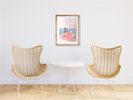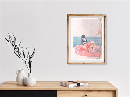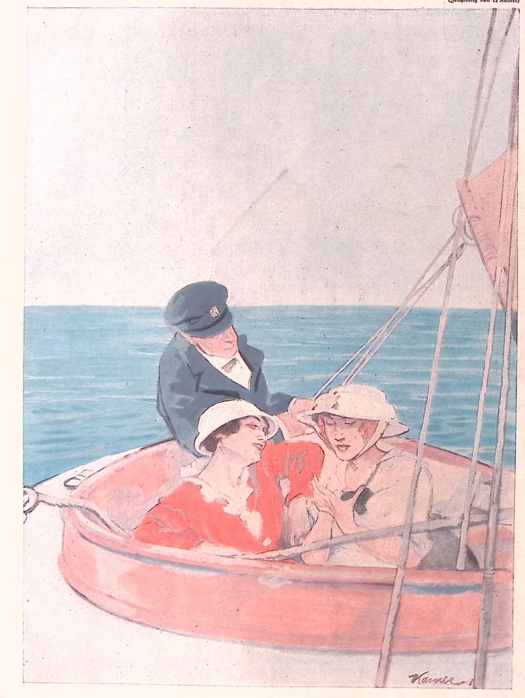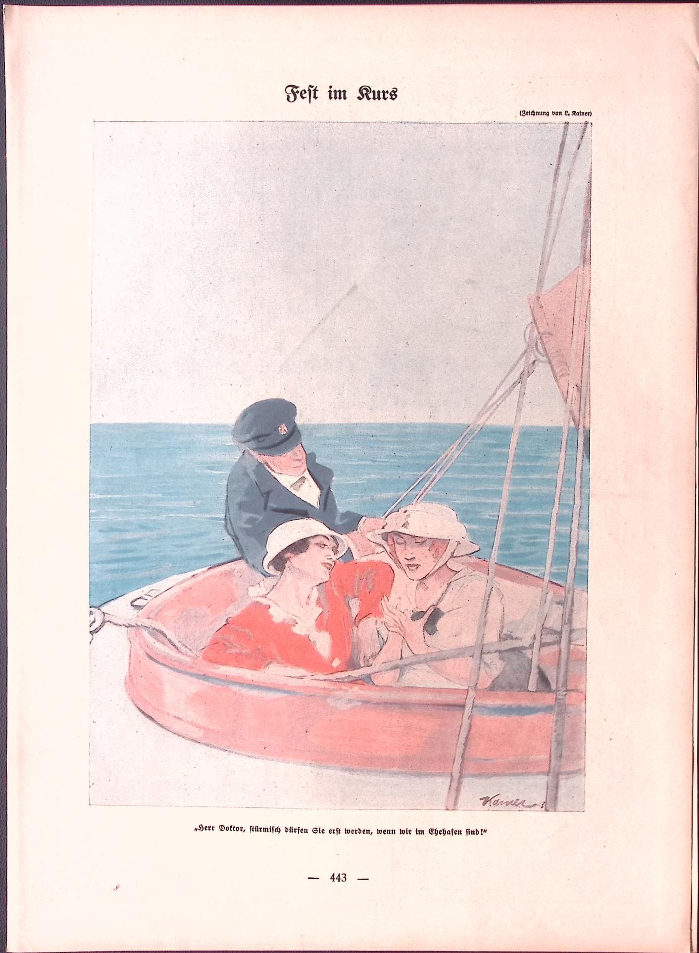 Feest op de boot. Leuke authentieke prent die een bijzondere inkijk geeft in de mode en lifestyle van begin jaren 20e eeuw. De prent is afkomstig uit het Duitse weekblad Simplicissimus. Elke week werd er een mode, lifestyle of licht erotische prent afgedrukt. De prent wordt geleverd in passe partout in het formaat 30x40. De vintage prent is gedrukt in 1913, midden in de Art Nouveau periode. L. Rainer maakte deze prent voor in weekblad Simplicissimus.