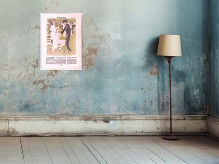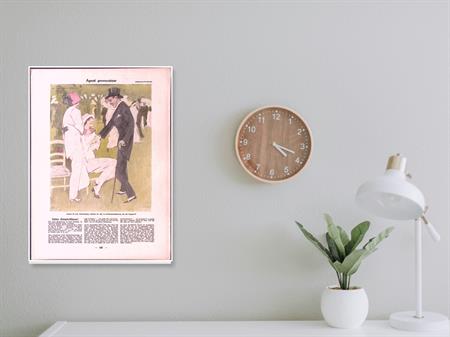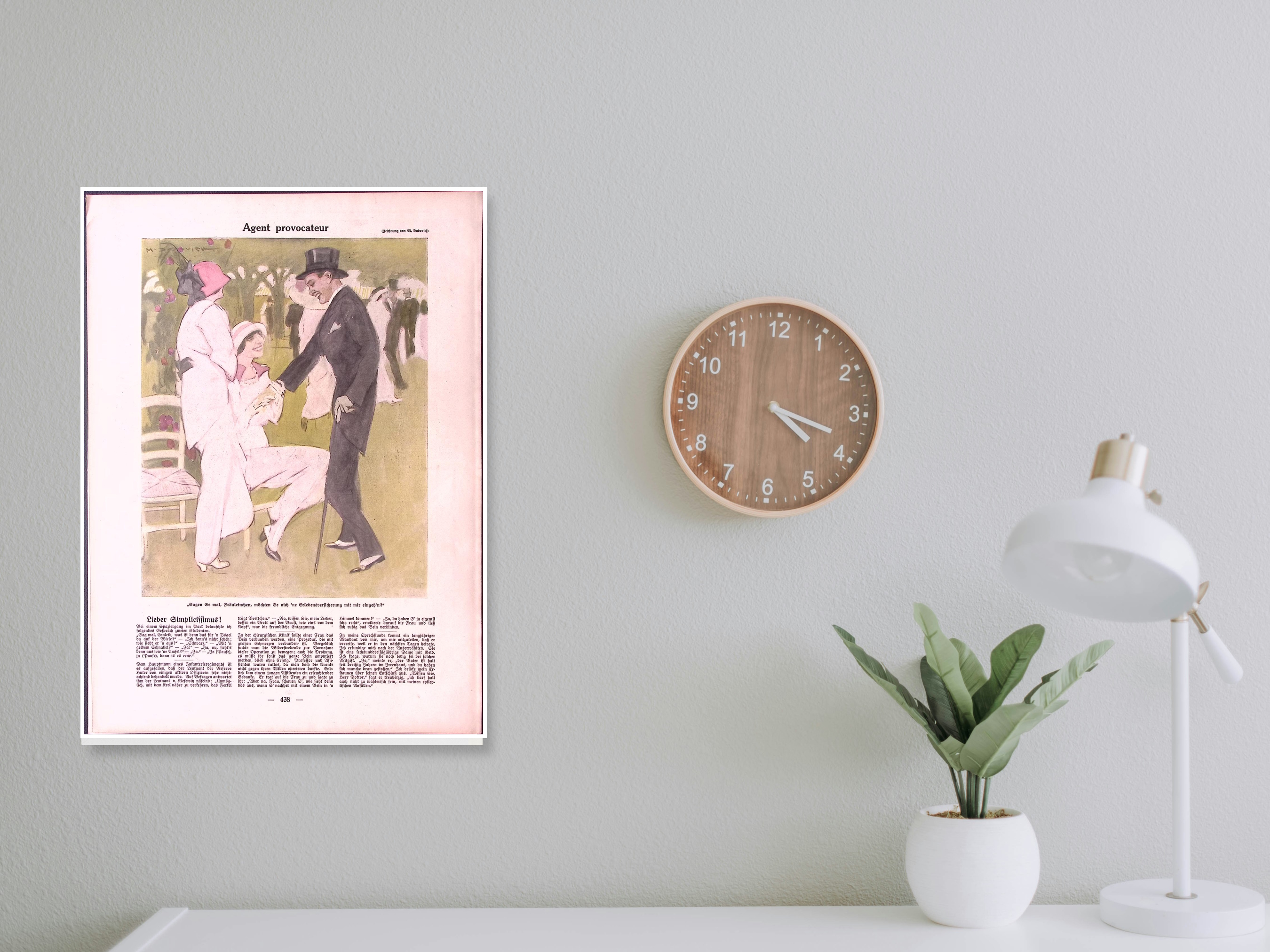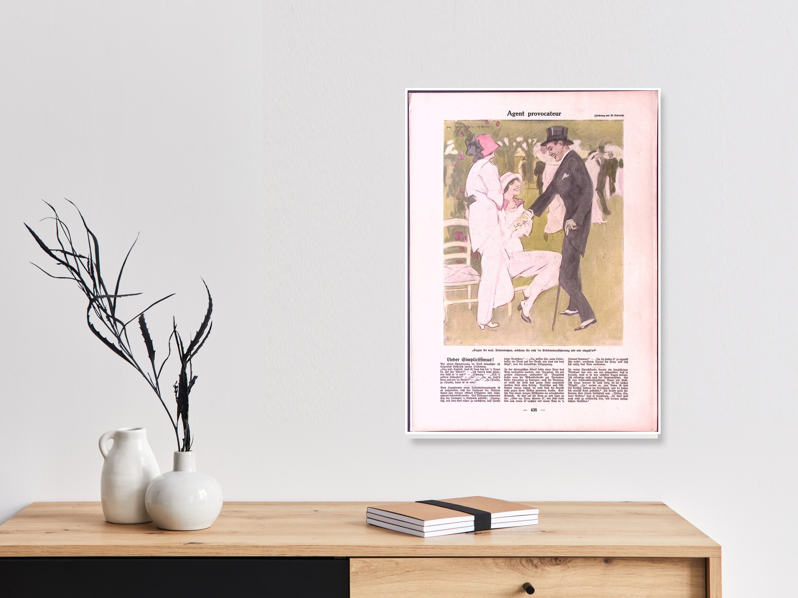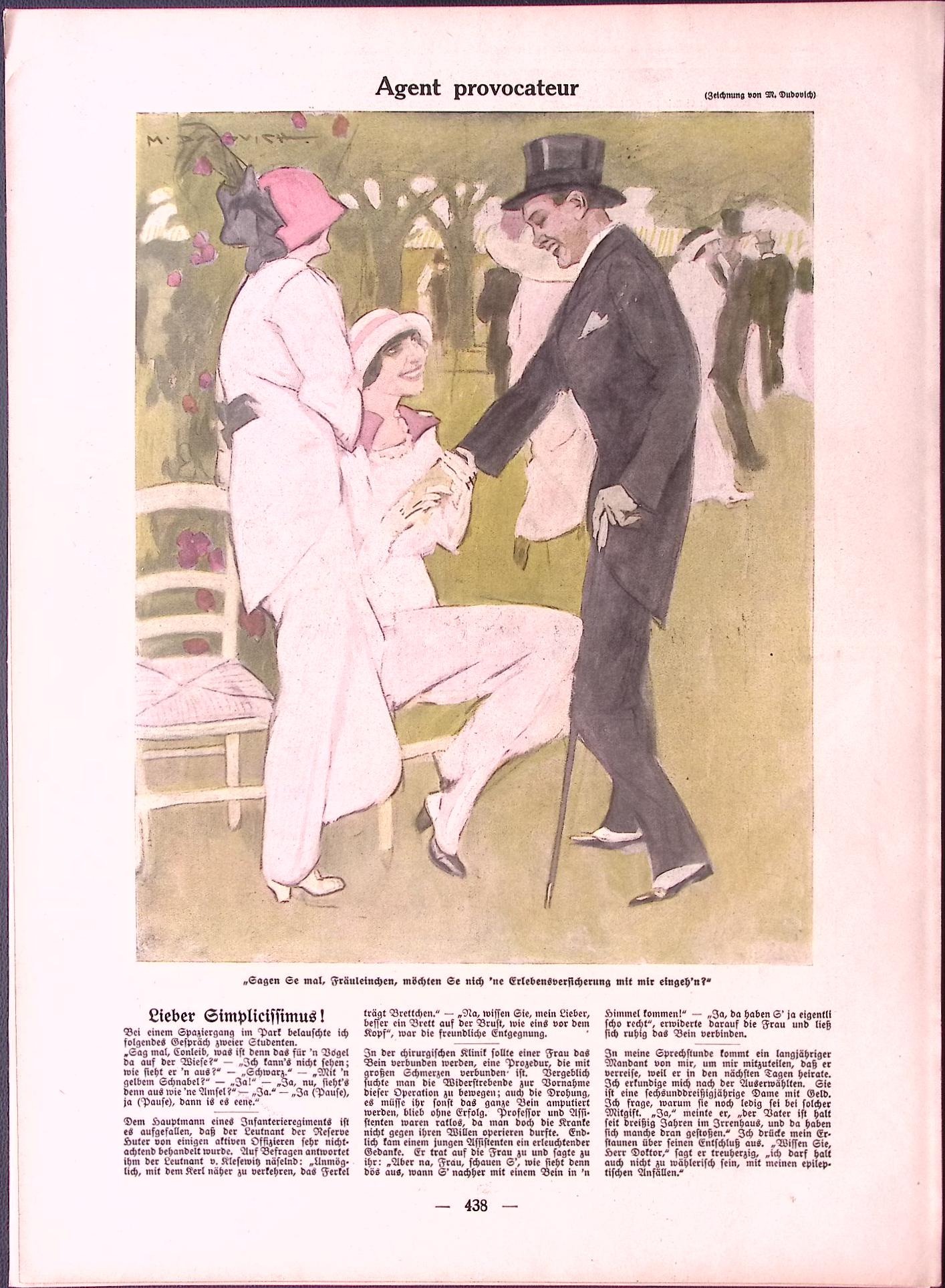 Mag ik je hand. Leuke authentieke prent die een bijzondere inkijk geeft in de mode en lifestyle van begin jaren 20e eeuw. De prent is afkomstig uit het Duitse weekblad Simplicissimus. Elke week werd er een mode, lifestyle of licht erotische prent afgedrukt. De prent wordt geleverd in passe partout in het formaat 30x40. De vintage prent is gedrukt in 1913, midden in de Art Nouveau periode. Marcello Dudovich maakte deze prent voor in weekblad Simplicissimus.
