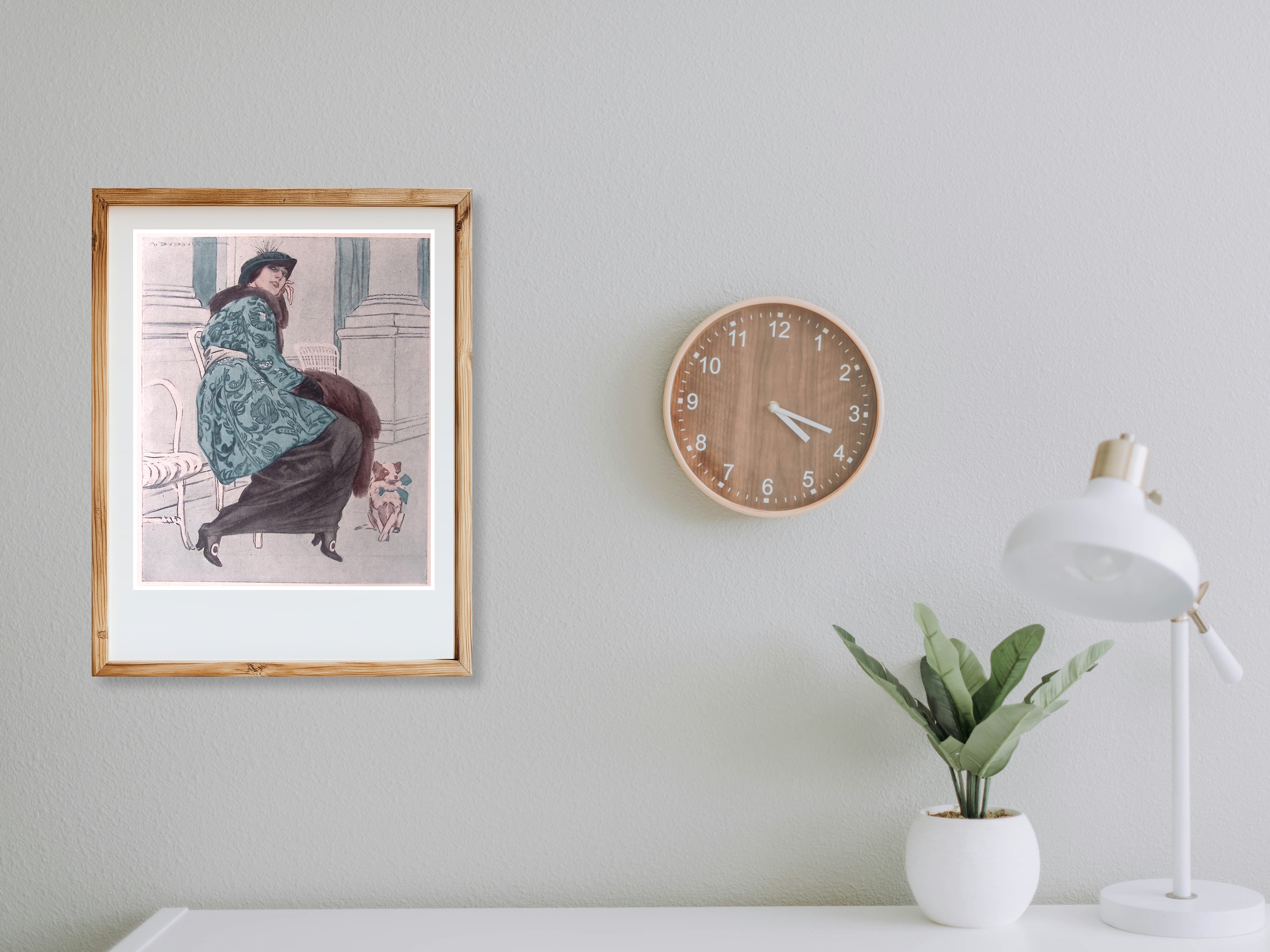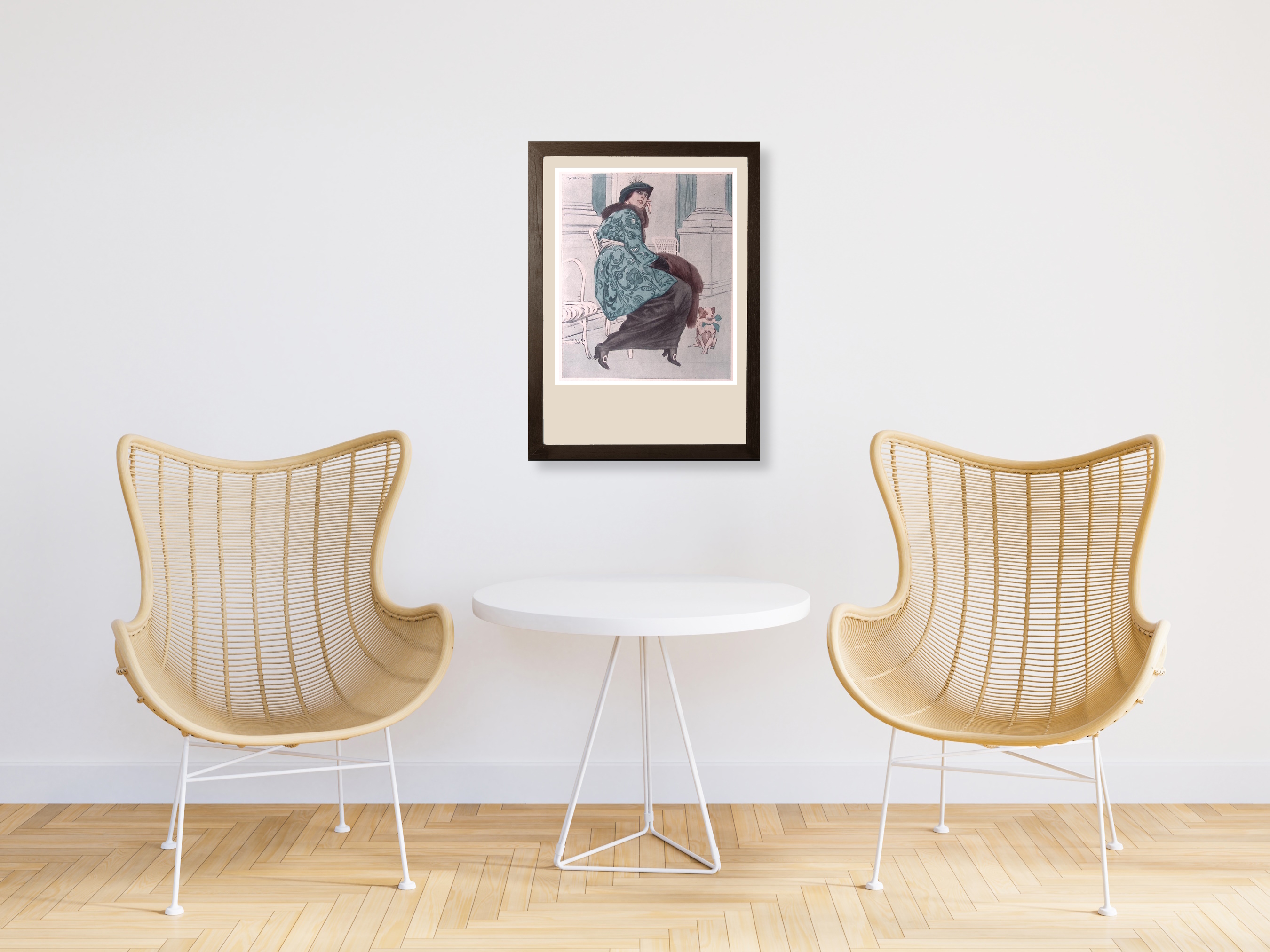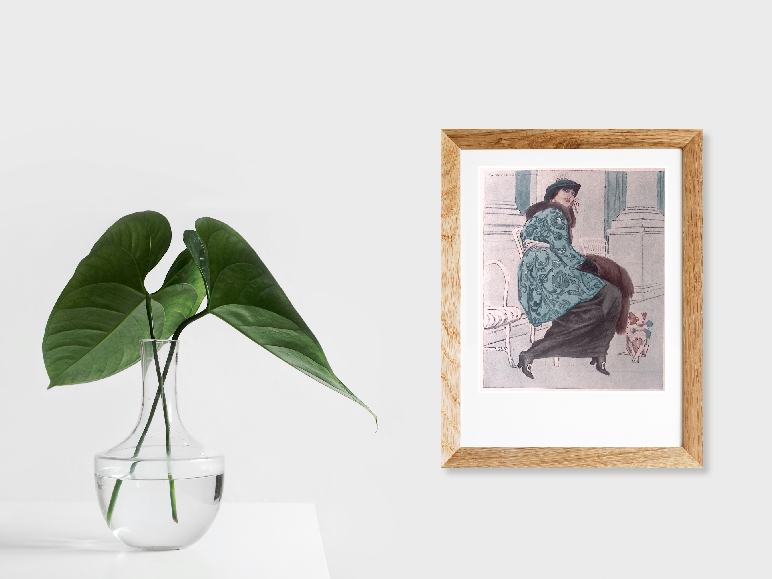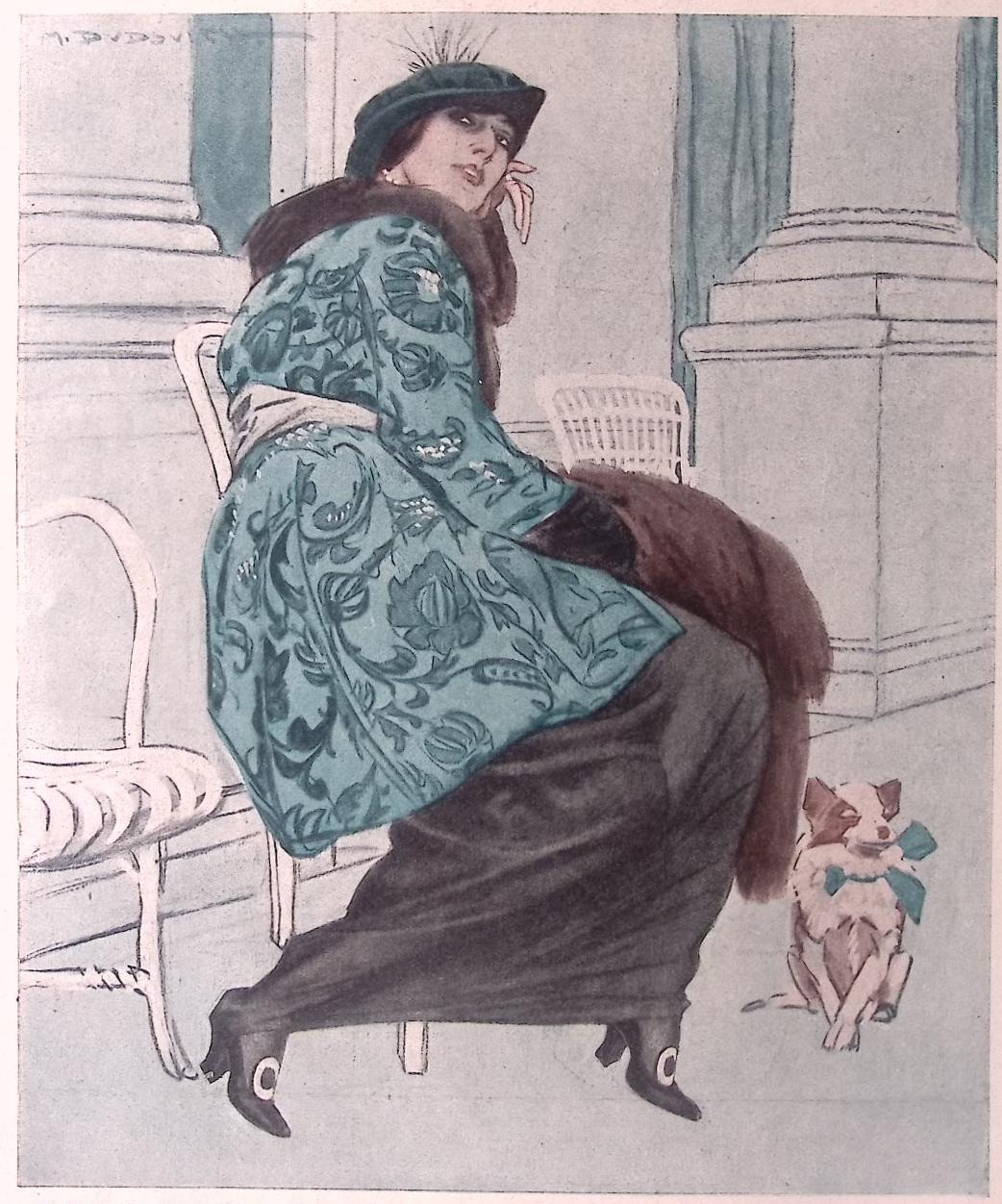 Matchende hond. Bijzondere authentieke prent. Mooie inkijk in de mode en lifestyle van begin jaren 20e eeuw. Komt uit Duits weekblad Simplicissimus, waar elke week een mode, lifestyle of licht erotische prent werd afgedrukt. De prent wordt geleverd in passe partout in het formaat 30x40. Deze prent is gedrukt midden in de Jugendstil periode in 1913. Prent gemaakt door Marcello Dudovich in weekblad Simplicissimus.