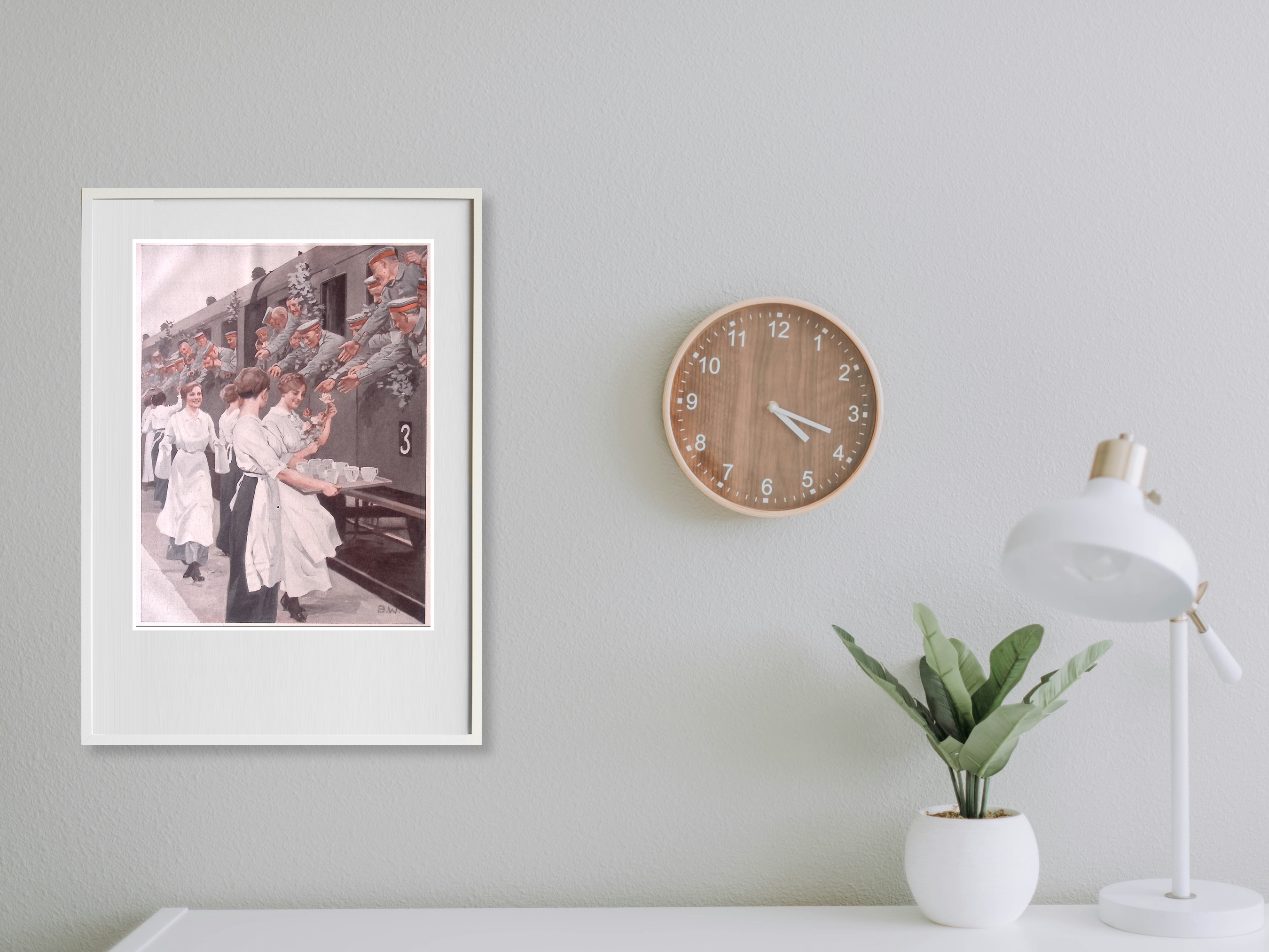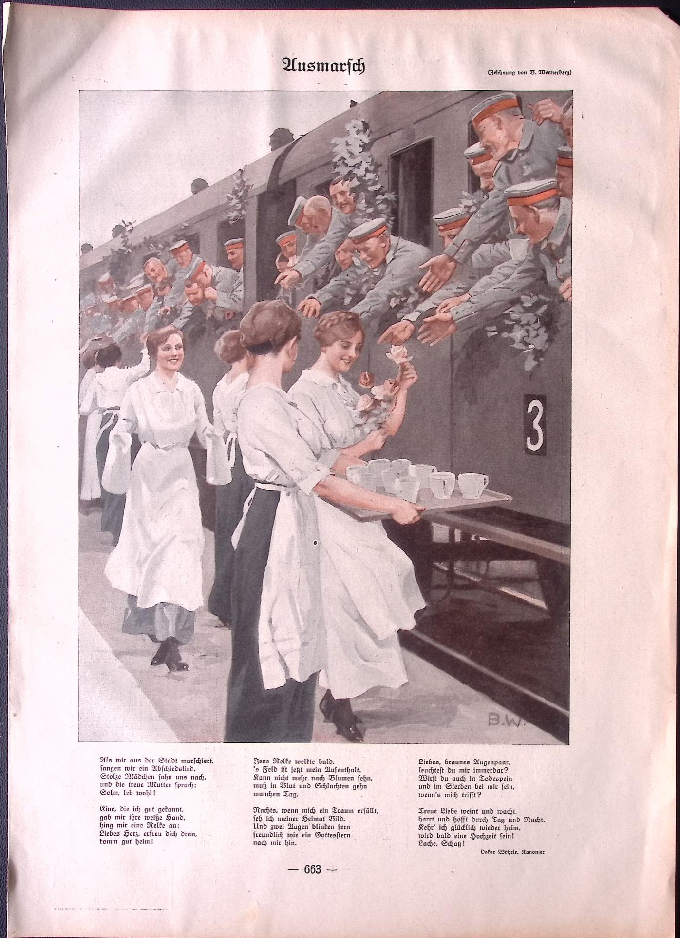 Tot snel. Originele prent uit de Jugendstil tijd. De prent is afkomstig uit het Duitse weekblad Simplicissimus. Mode, lifestyle en licht erotische prenten werden toegevoegd in een weekblad vol spotprenten. De prent wordt geleverd in passe partout in het formaat 30x40. Gedrukt in 1914, midden in de Art Nouveau periode. Prent gemaakt door Brynolf Wennerberg in weekblad Simplicissimus.