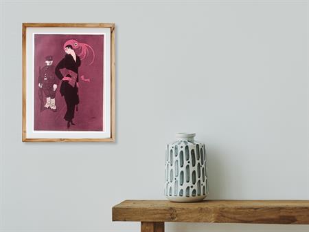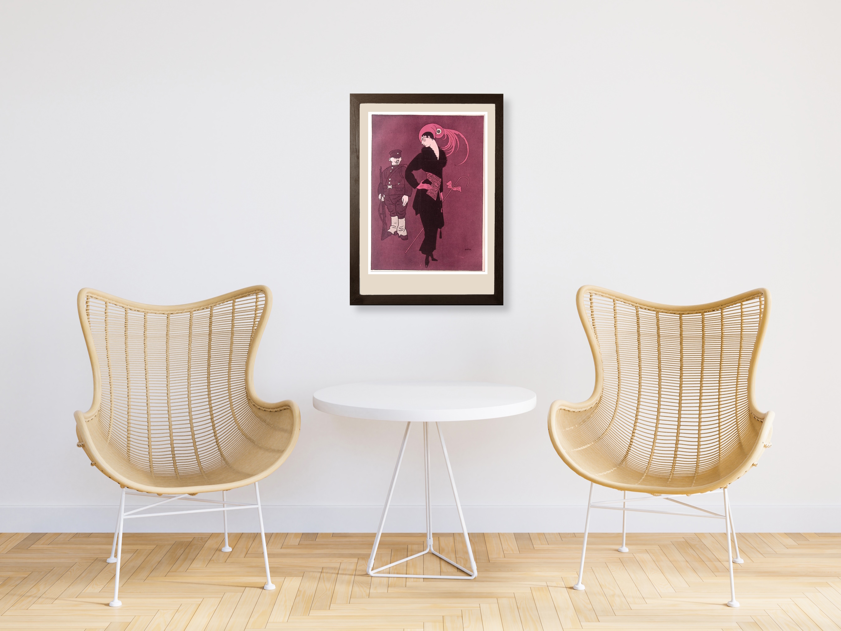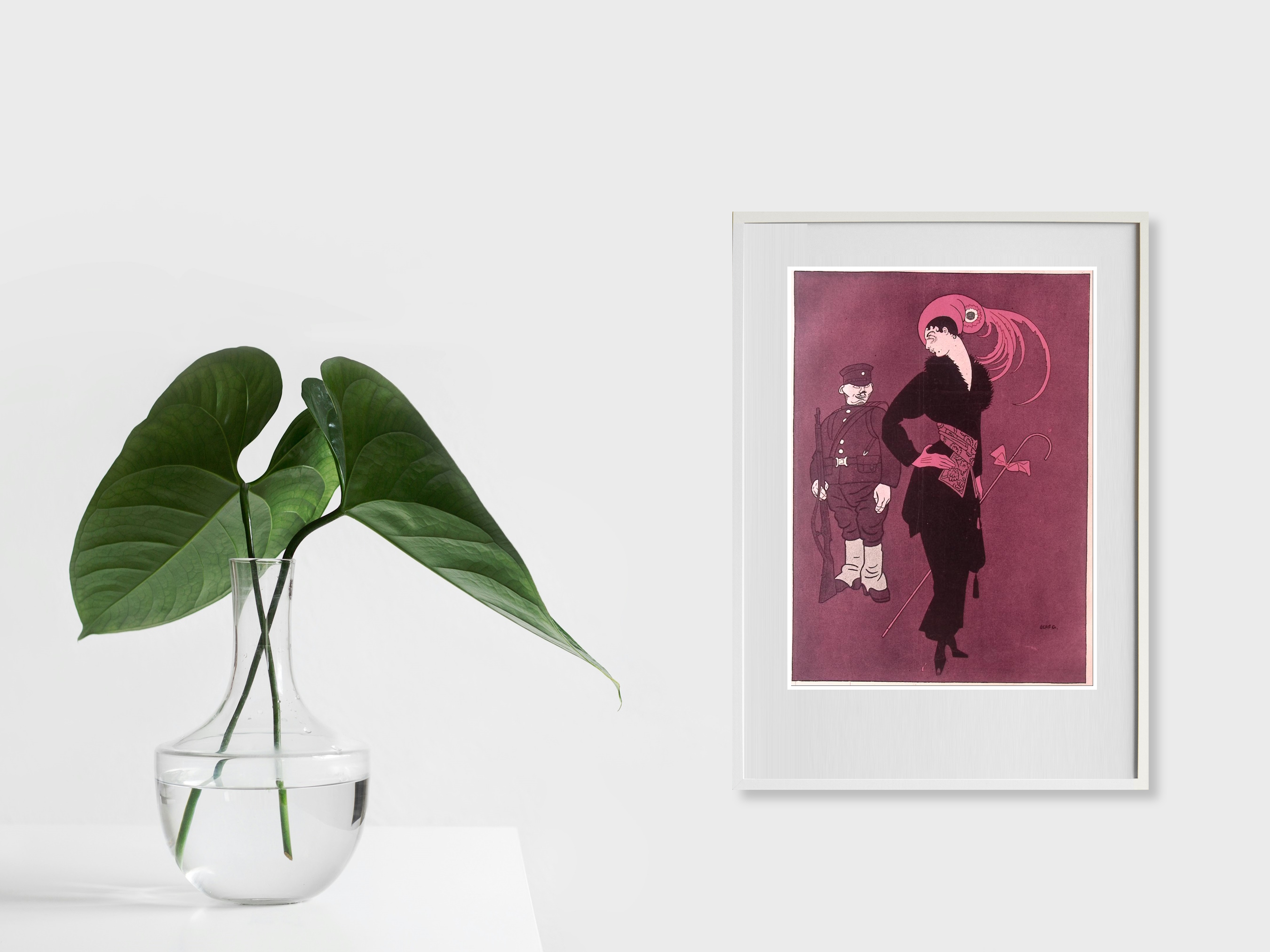 Wat kijk je nou. Bijzondere authentieke prent. Mooie inkijk in de mode en lifestyle van begin jaren 20e eeuw. Komt uit Duits weekblad Simplicissimus, waar elke week een mode, lifestyle of licht erotische prent werd afgedrukt. De prent wordt geleverd in passe partout in het formaat 30x40. Deze prent is gedrukt midden in de Jugendstil periode in 1914. Prent gemaakt door Olaf Gulbransson in weekblad Simplicissimus.