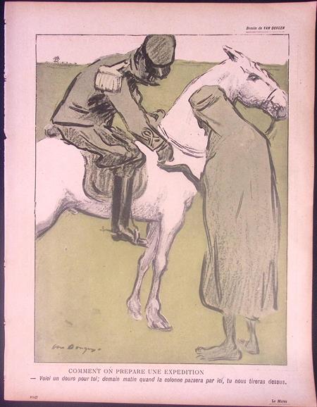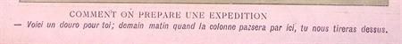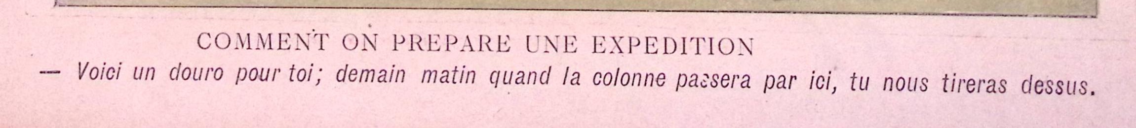 Vertaald uit het Frans: "COMMENT ON PREPARE UNE EXPEDITION Voici un douro pour tol; demain matin quand la colonne pazsera par lel, tu nous tireras dessus". Op de prent is een ondertitel te lezen: HOE JE EEN EXPEDITIE VOORBEREIDT Hier is een Douro voor jou; Morgenvroeg, als de colonne voorbijtrekt, schiet je op ons.