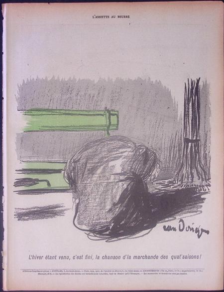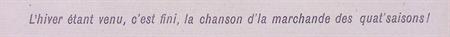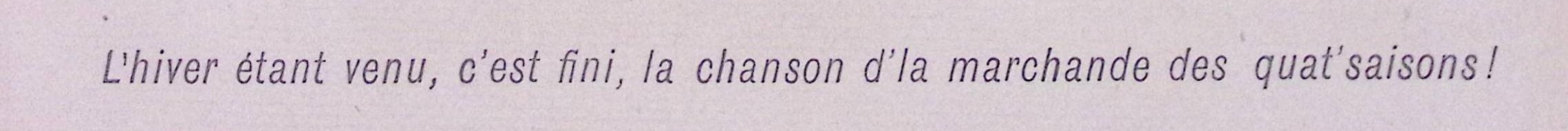 Vertaald uit het Frans "L'hiver étant venu, c'est fini, la chanson d'la marchande des quat'saisons!". Op de prent is een ondertitel te lezen: De winter is gekomen, het lied van de koopman van alle vier de seizoenen is voorbij!.