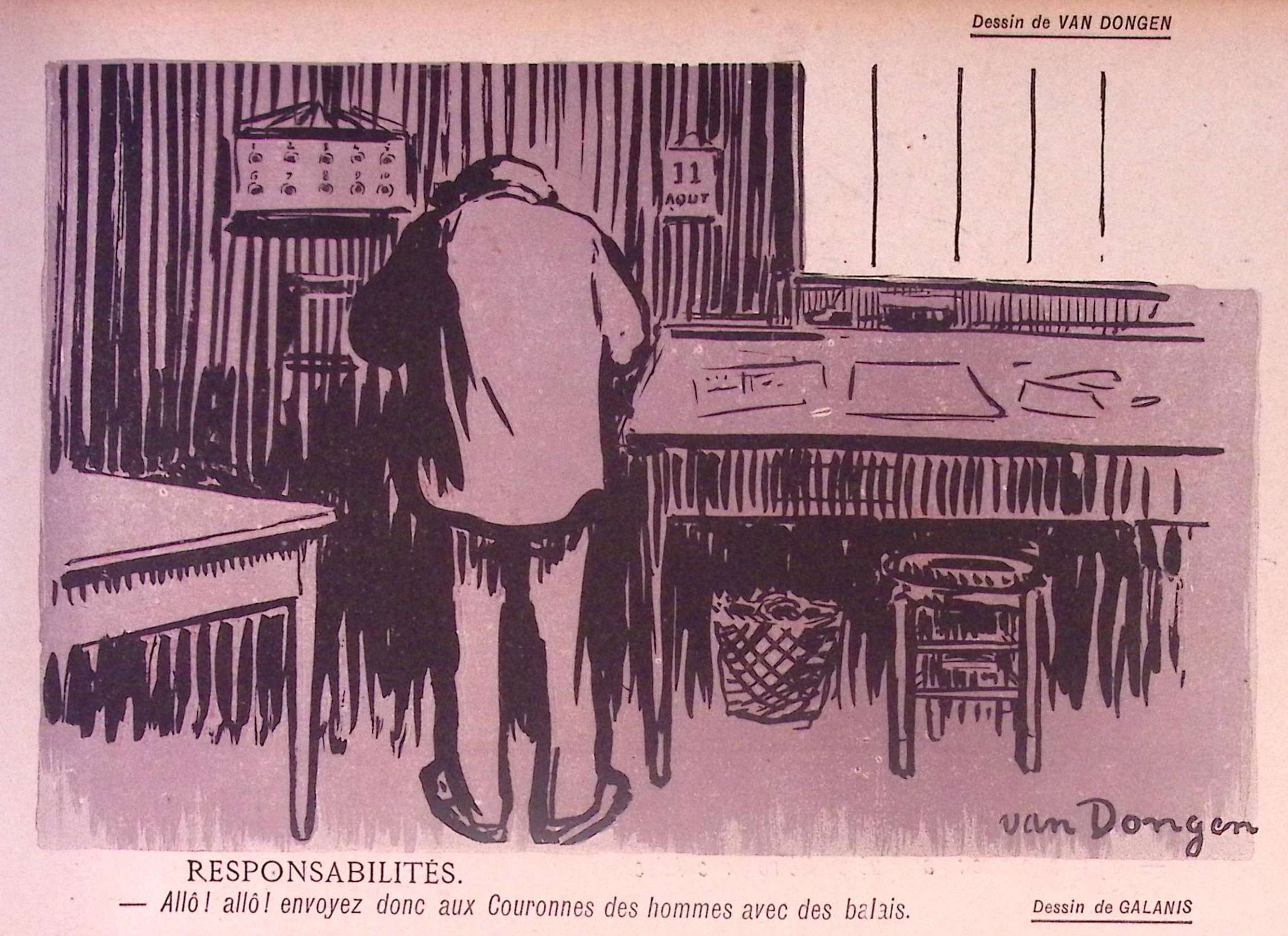 Vertaald uit het Frans: "RESPONSABILITES. Allo allo! envoyez donc aux Couronnes des hommes avec des belais.". Op de prent is een ondertitel te lezen: VERANTWOORDELIJKHEDEN. Hallo hallo! Stuur daarom mannen met zekeringen naar de Kronen..