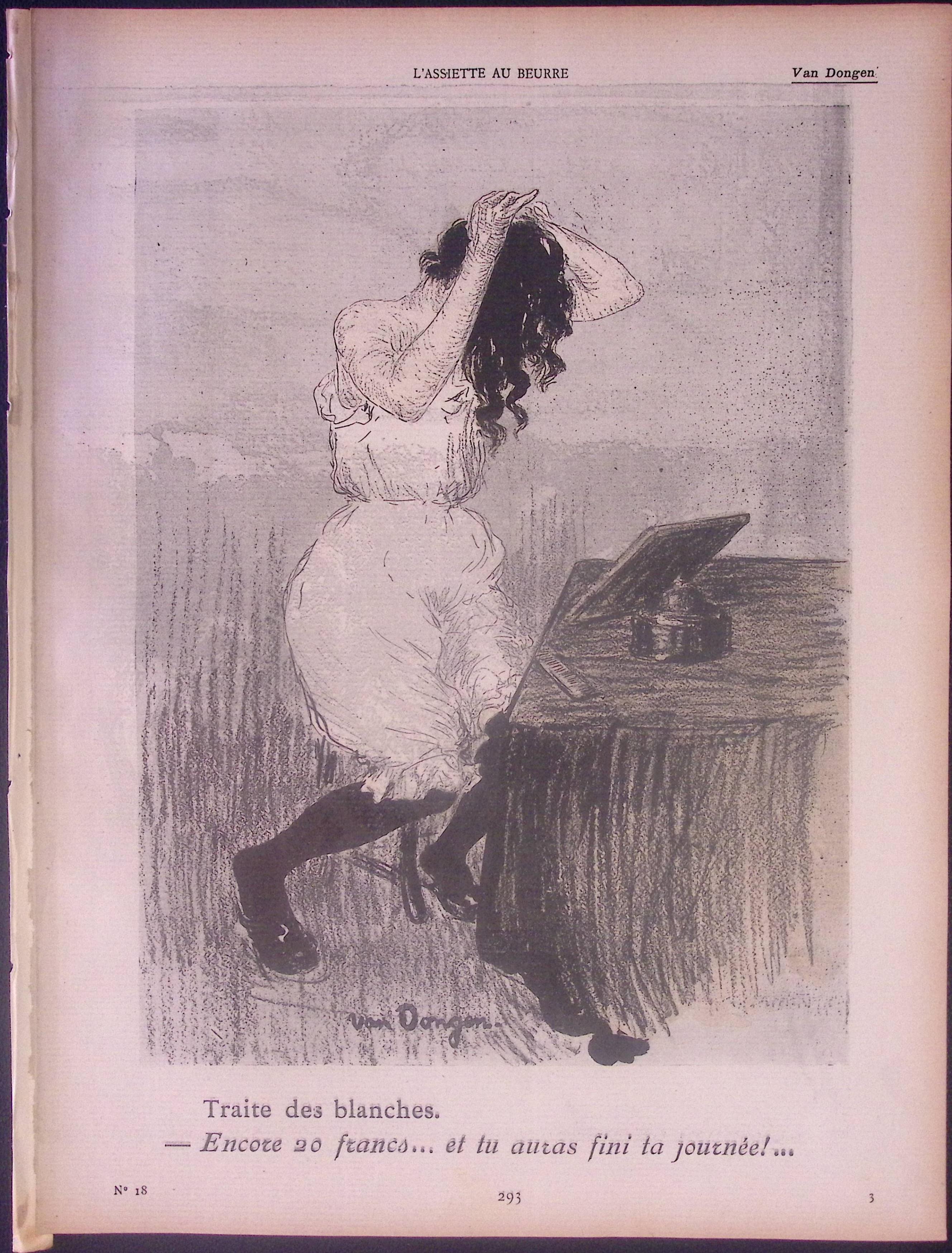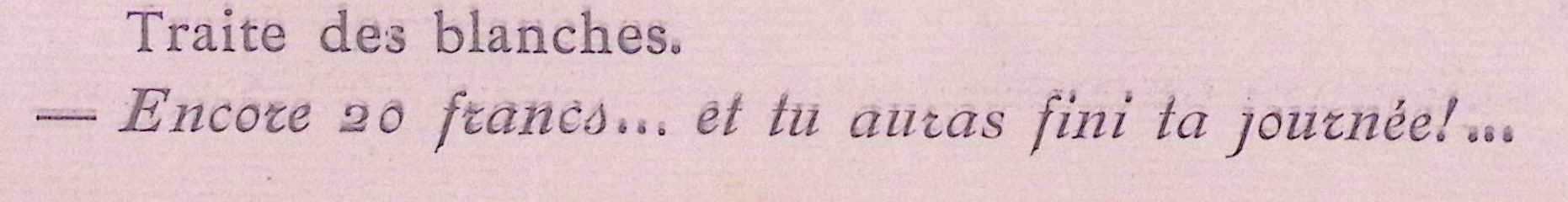 Vertaald uit het Frans "Traite des blanches. Encore 20 francs... et tu auras fini la journée!". De ondertitel leest: Handel in blanke slaven. Nog 20 frank... en je bent klaar voor vandaag!.