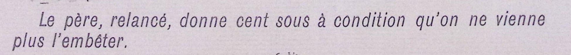 Vertaald uit het Frans "Le père, relancé, donne cent sous à condition qu'on ne vienne plus l'embéter.". De ondertitel leest: De vader, weer opgehitst, geeft honderd sous op voorwaarde dat niemand hem meer komt lastigvallen..