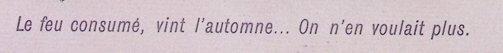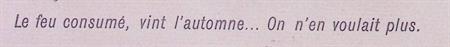 Vertaald uit het Frans "Le feu consumé, vint l'automne... On n'en voulait plus.". De ondertitel leest: Het vuur verteerde, de herfst kwam... We wilden het niet meer..