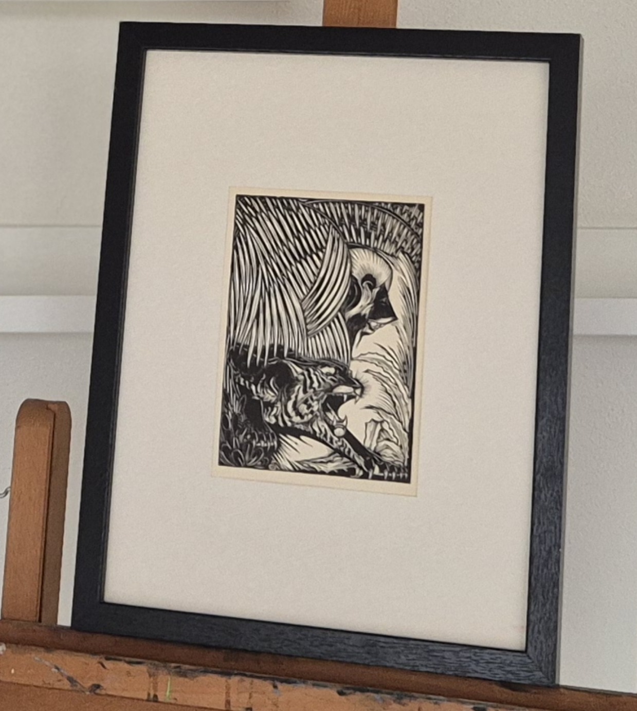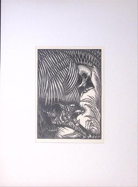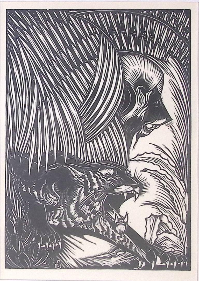 Bijzondere authentieke prent (houtsnede), geen herdruk! Komt uit het boek Misleidende Majesteit, waar dierenprenten in een verhaal verwerkt zijn Gemaakt door de bekende Nederlandse kunstenaar Jan Schonk. Wordt geleverd in passe partout in formaat 30x40.