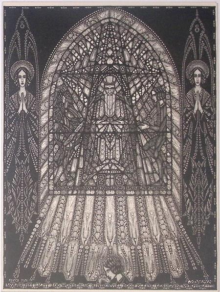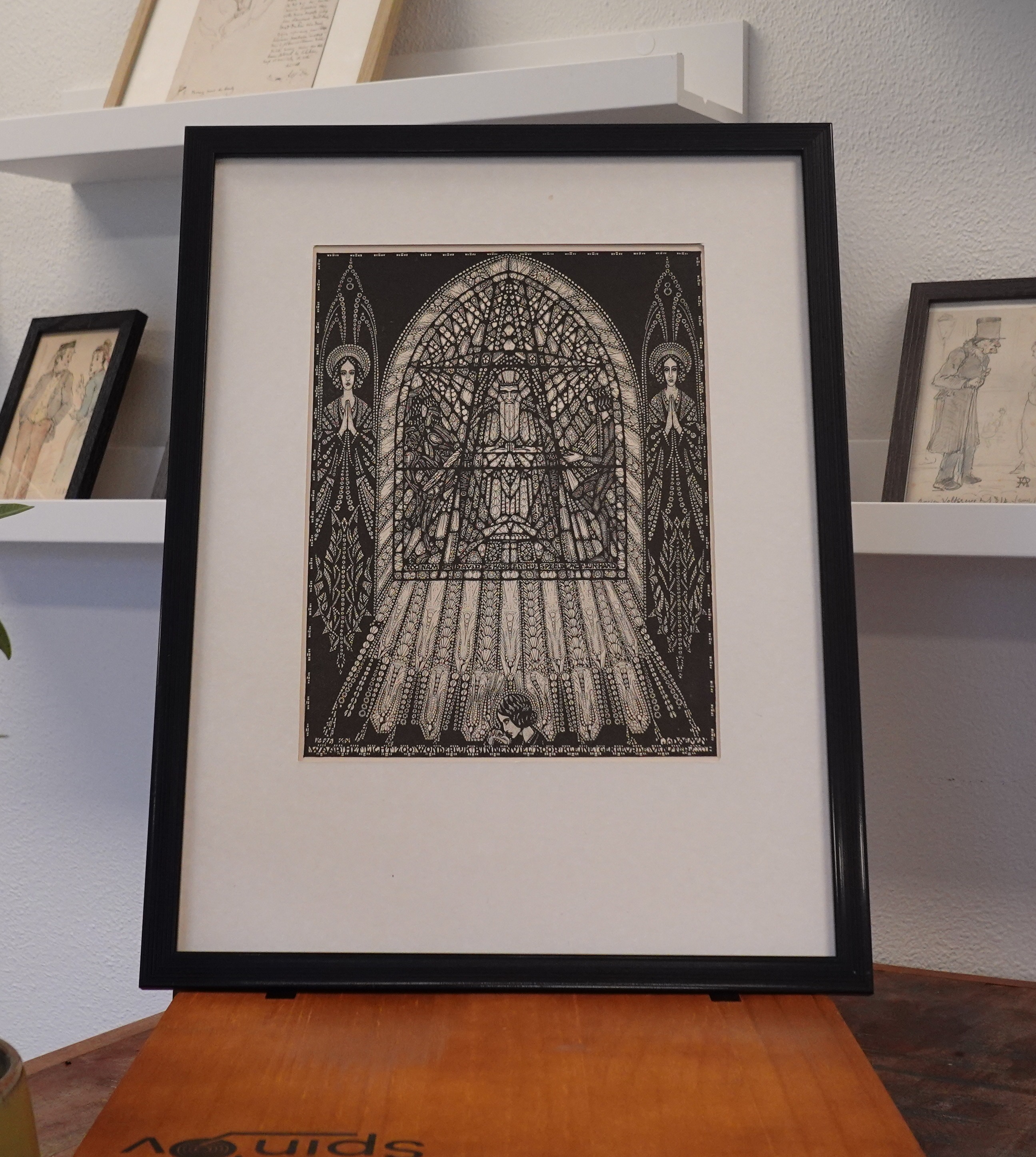 Bijzondere authentieke prent (houtsnede), geen herdruk! Komt uit het boek De heilige vlam, waar prachtige prenten in een verhaal verwerkt zijn Gemaakt door de bekende Nederlandse kunstenares Jo Daemen. Wordt geleverd in passe partout in formaat 30x40.