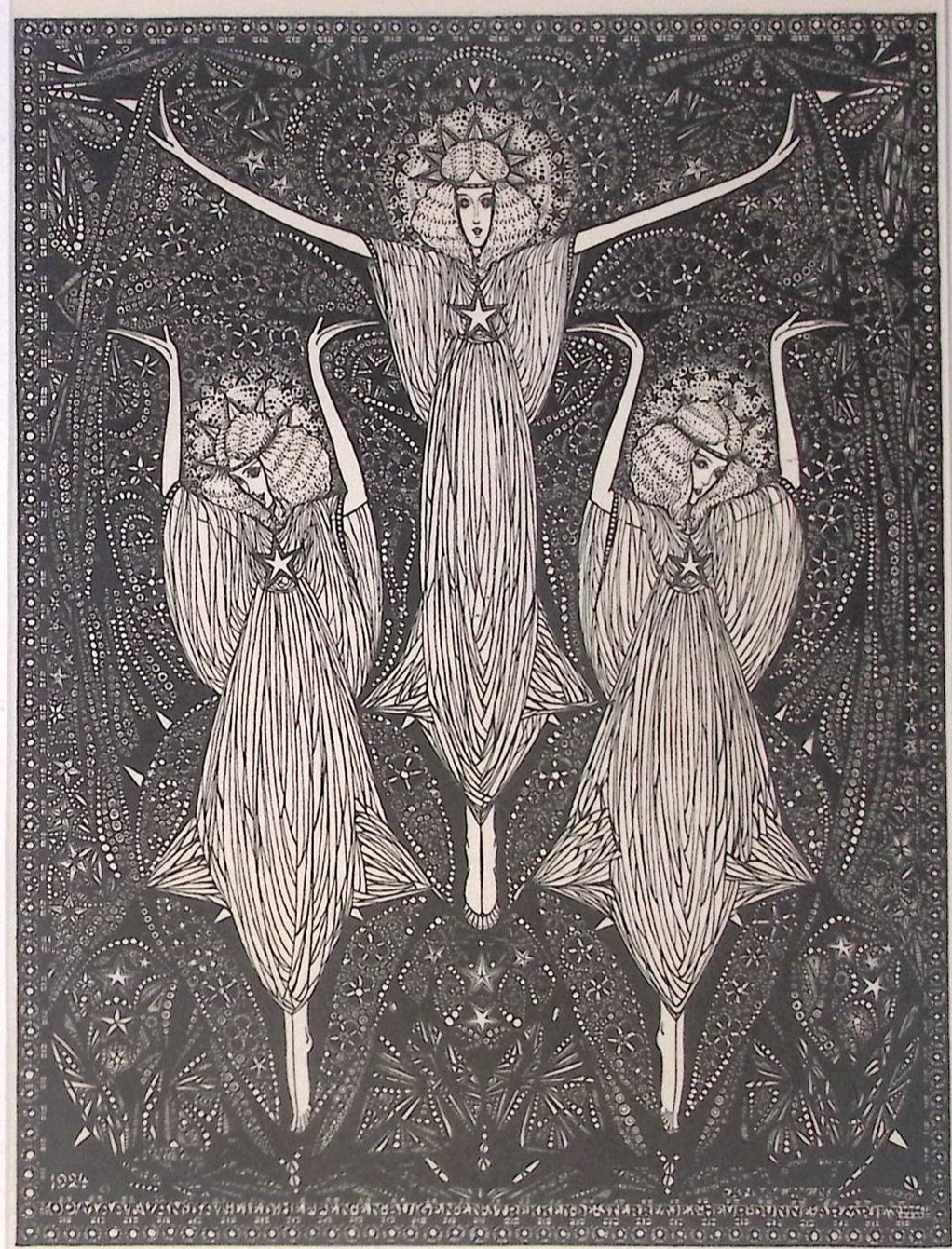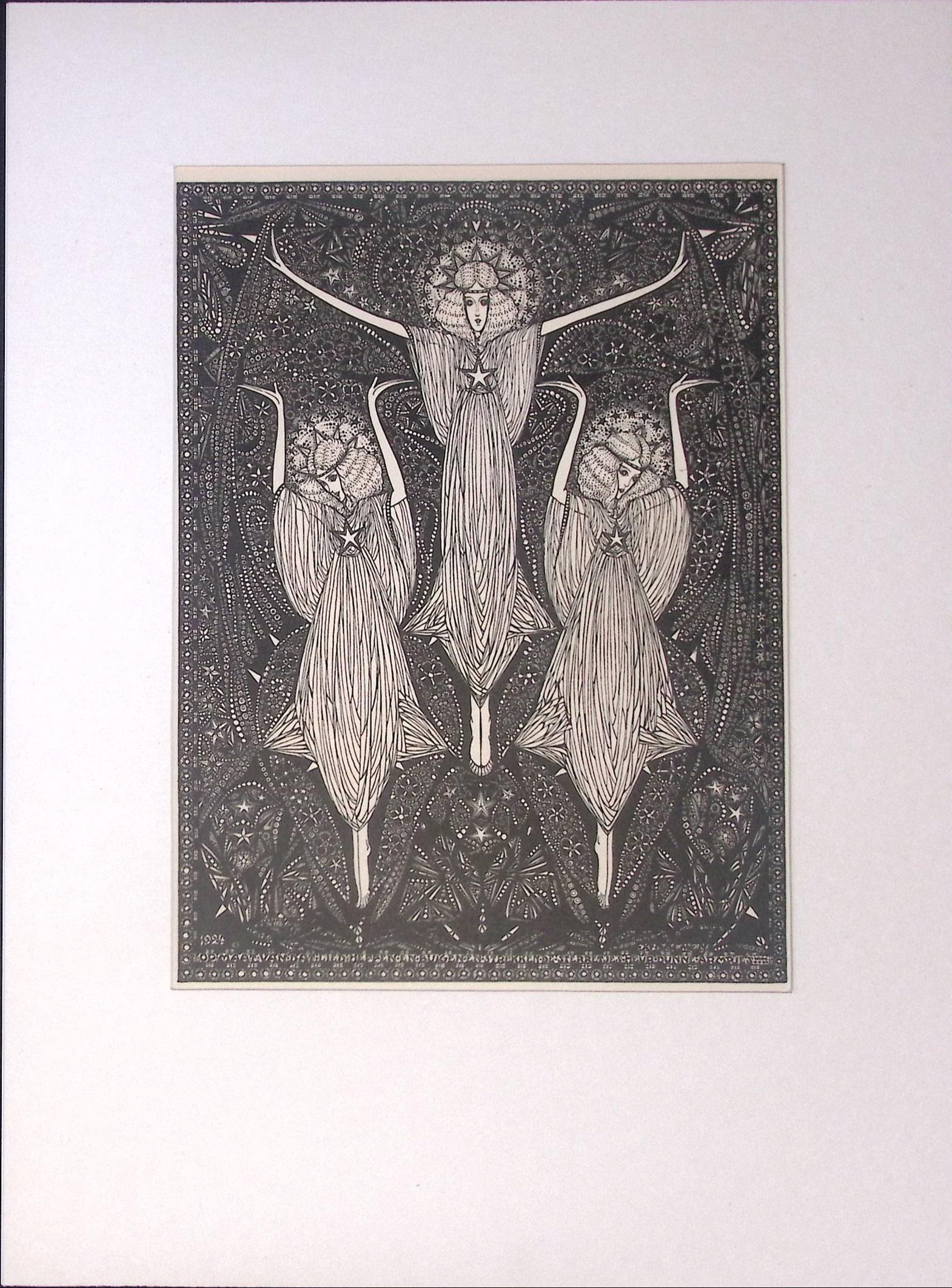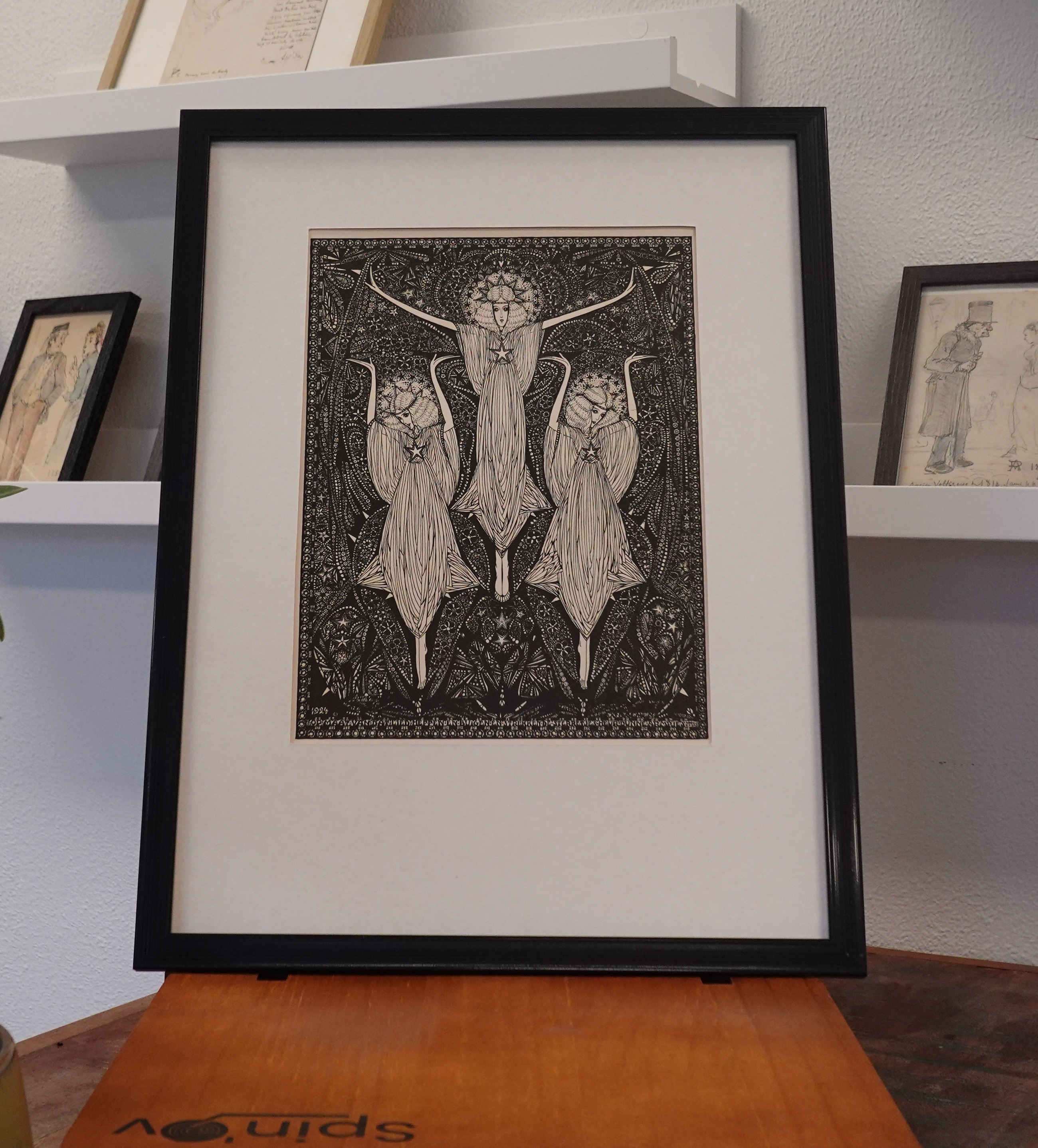 Bijzondere authentieke prent (houtsnede), geen herdruk! Komt uit het boek De heilige vlam, waar prachtige prenten in een verhaal verwerkt zijn Gemaakt door de bekende Nederlandse kunstenares Jo Daemen. Wordt geleverd in passe partout in formaat 30x40.