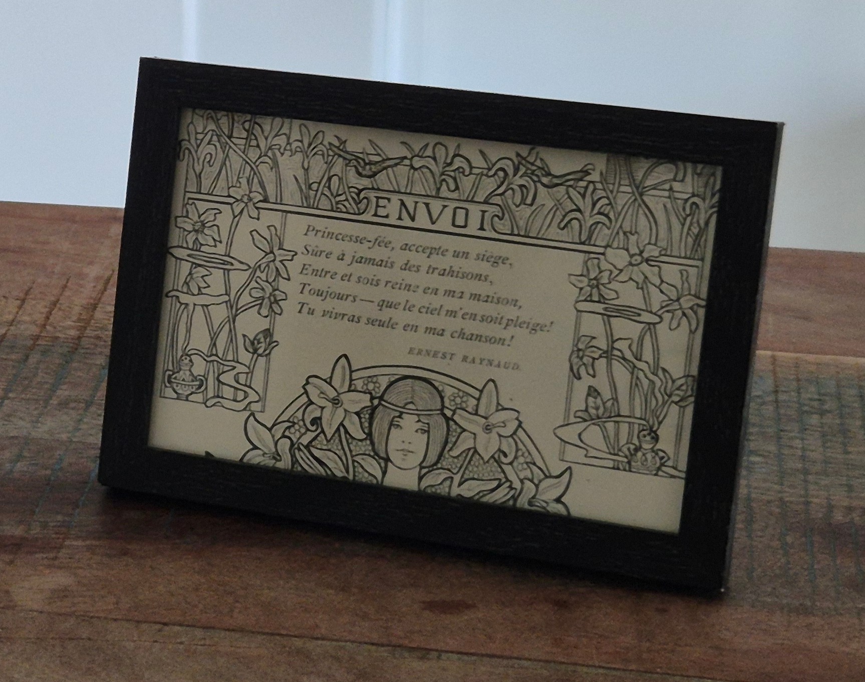 Bijzondere authentieke mini prent (houtsnede), zit in zwarte lijst, geen herdruk! Komt uit begin jaren 1900, midden in de Belle Epoque periode in Frankrijk. Mooie inkijk in de mode en lifestyle uit die tijd. Komt uit Franse weekblad L'Image, waar elke week een mode, lifestyle en sierlijke prenten werden afgedrukt.