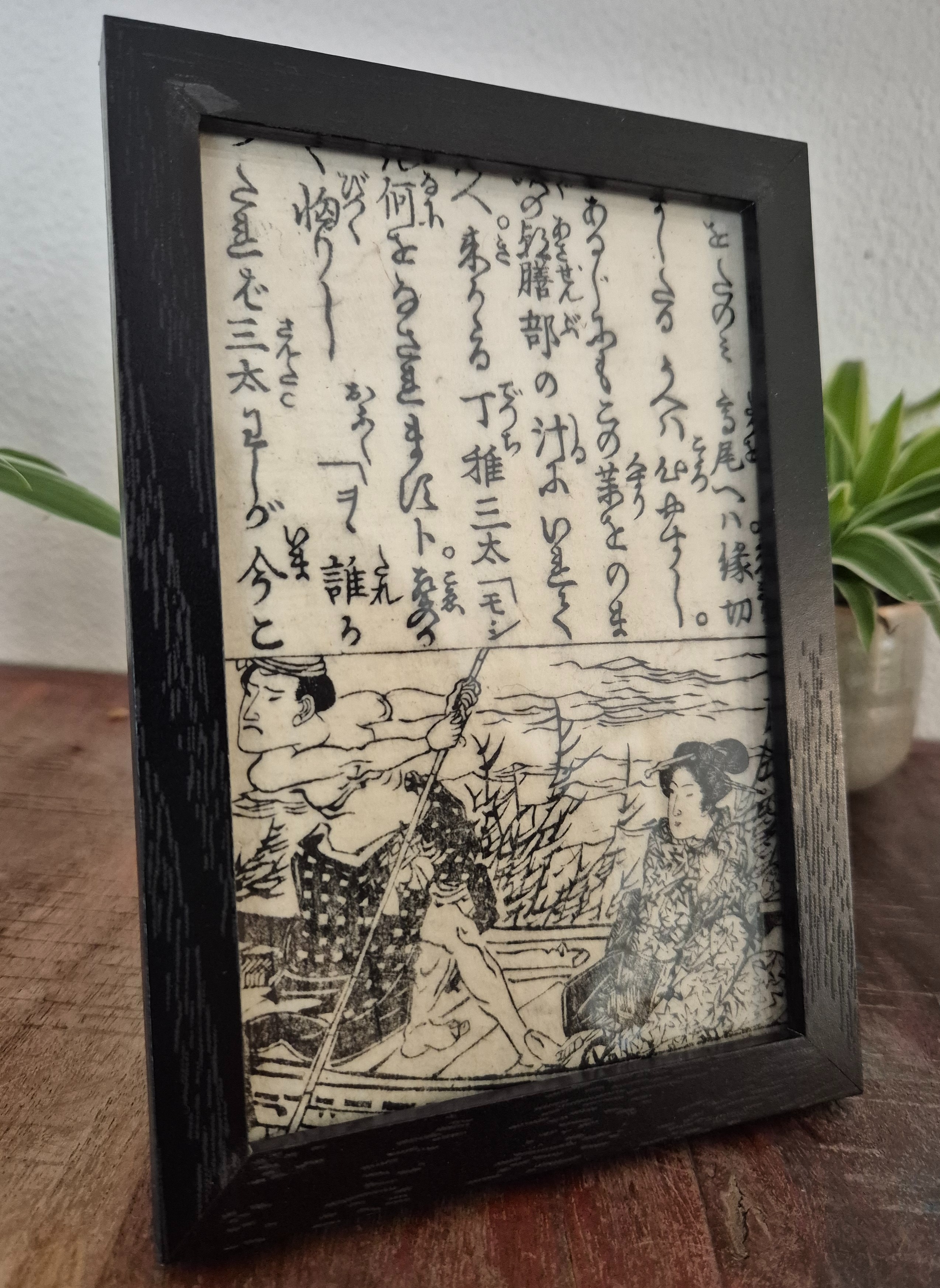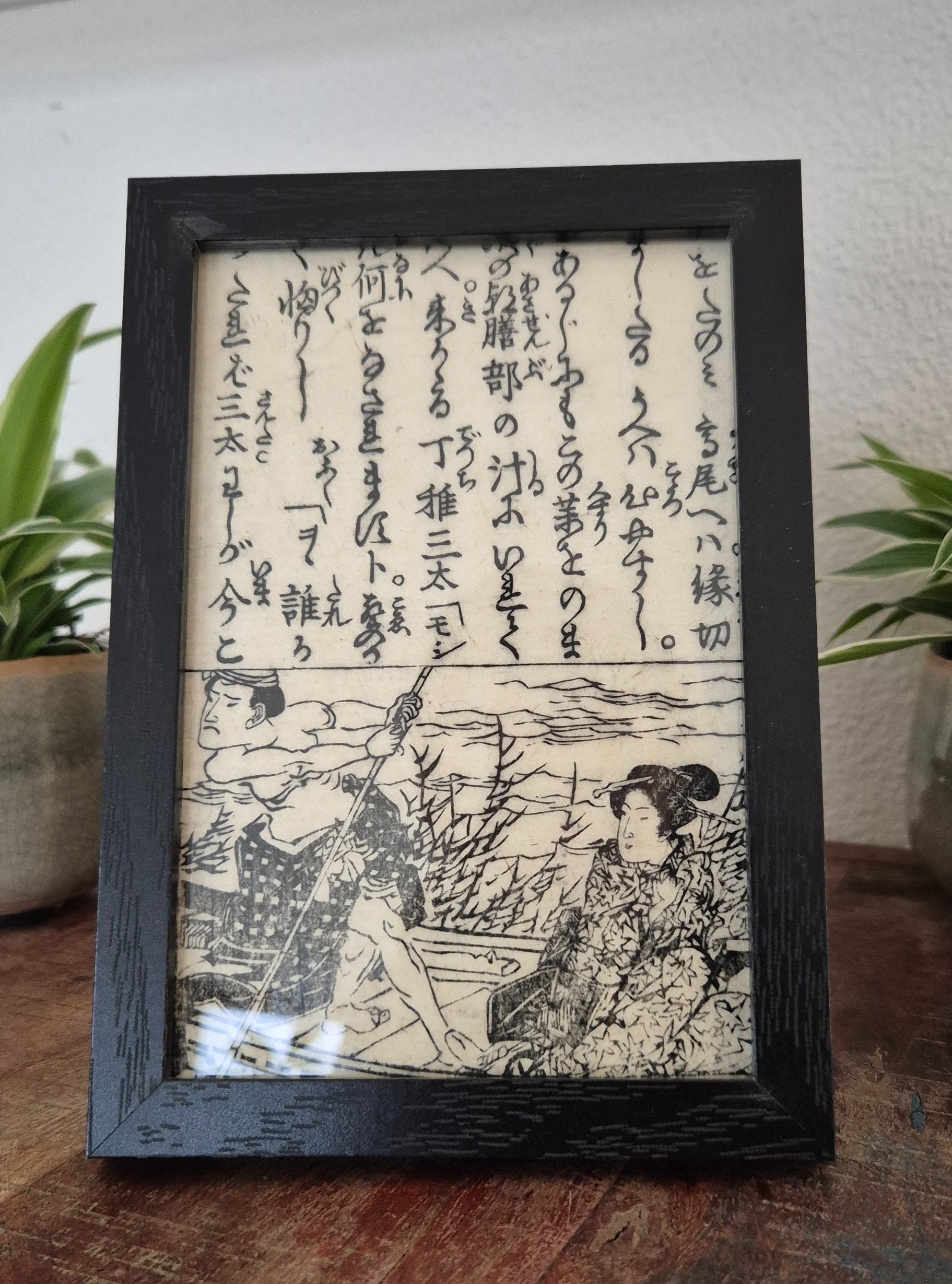 Deze authentieke Edo-periode houtsnede is afkomstig uit het geïllustreerde verhaal Ehon Katakiuchi Takao Gaiden, een dramatische vertelling over de beroemde geisha Takao uit het Yoshiwara-district. De illustratie is vervaardigd door Keisai Eisen, een meester van de ukiyo-e en vooral bekend om zijn elegante bijin-ga. Eisen’s kenmerkende stijl – fijne lijnen, verfijnde details en een sfeervolle sfeer – komt prachtig tot uiting in deze originele houtsnede. Gedrukt op traditioneel mulberry paper (washi), met een tijdloze uitstraling die bijna twee eeuwen geschiedenis met zich meedraagt.