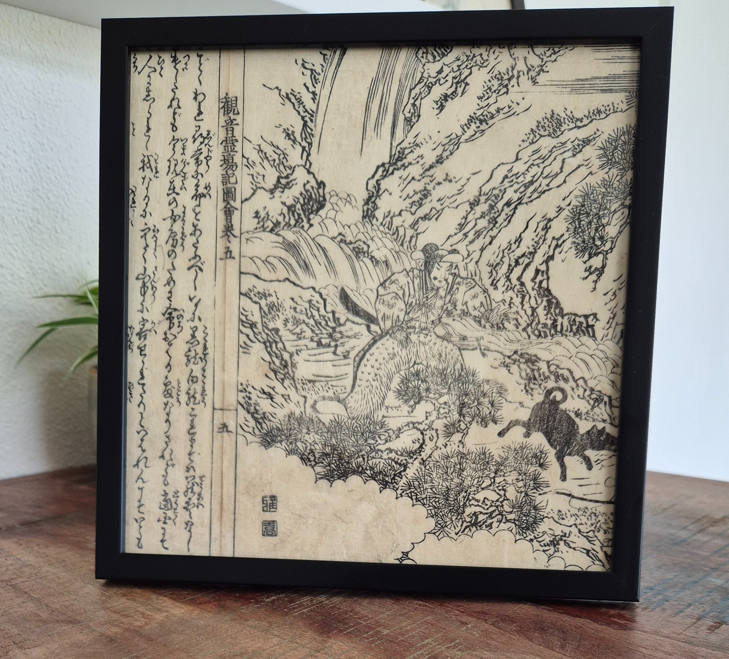 Originele Edo-periode houtsnede uit 1845, afkomstig uit een zeldzaam boeddhistisch illustratieboek met circa 100 pagina’s en prachtige dubbele houtdrukken; geschreven door Kōyo Shun’ō en geïllustreerd door Tsujimoto Motosada, met een visuele reis langs heilige Kannon-pelgrimsplaatsen. U koopt één individuele, authentieke en direct inlijstklare houtsnede uit de late Edo-periode.