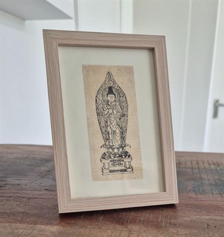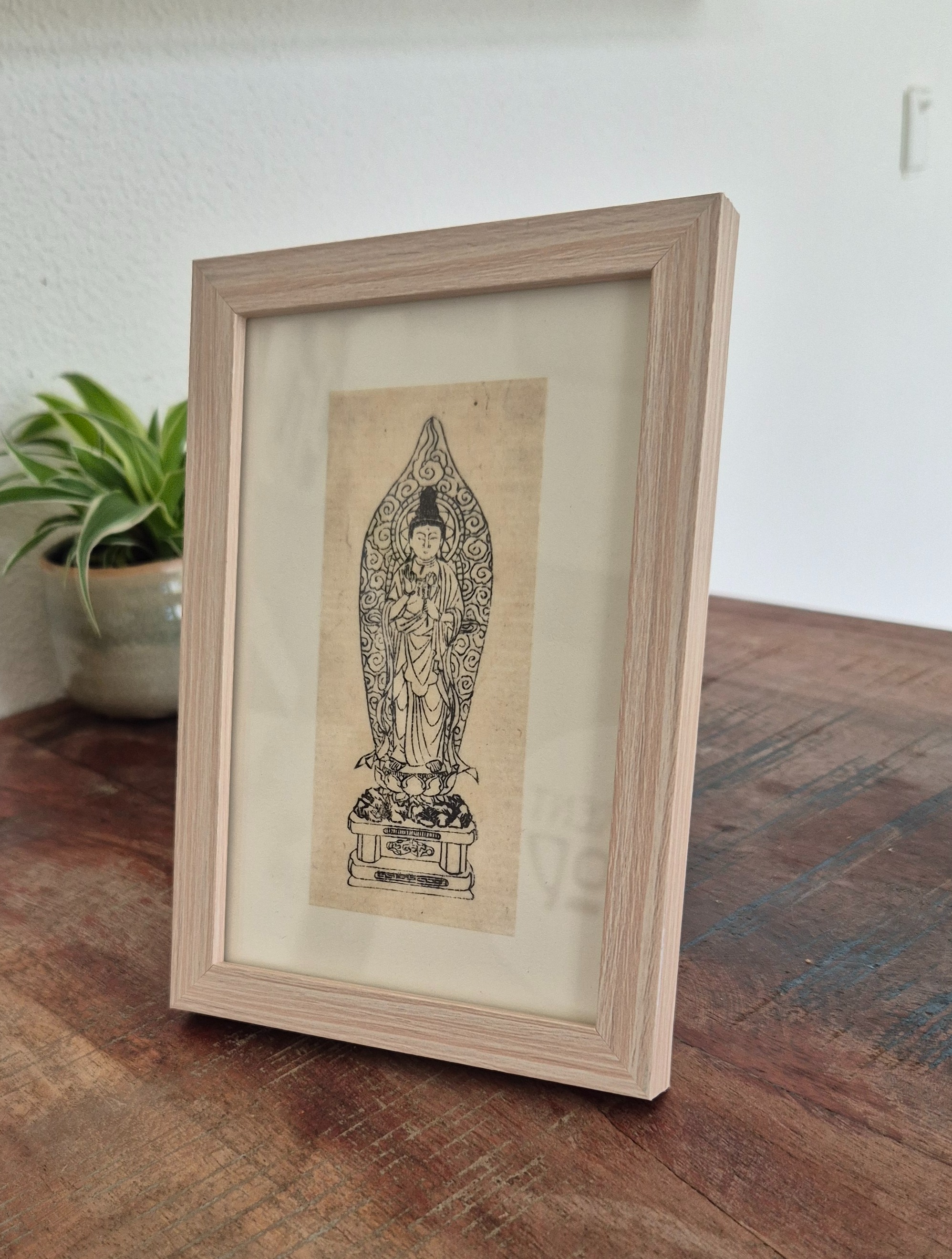 Originele Edo-periode houtsnede uit 1845, afkomstig uit een zeldzaam boeddhistisch illustratieboek met circa 100 pagina’s en prachtige dubbele houtdrukken; geschreven door Kōyo Shun’ō en geïllustreerd door Tsujimoto Motosada, met een visuele reis langs heilige Kannon-pelgrimsplaatsen. U koopt één individuele, authentieke en direct inlijstklare houtsnede uit de late Edo-periode. Lijst maat: 12 x 17.