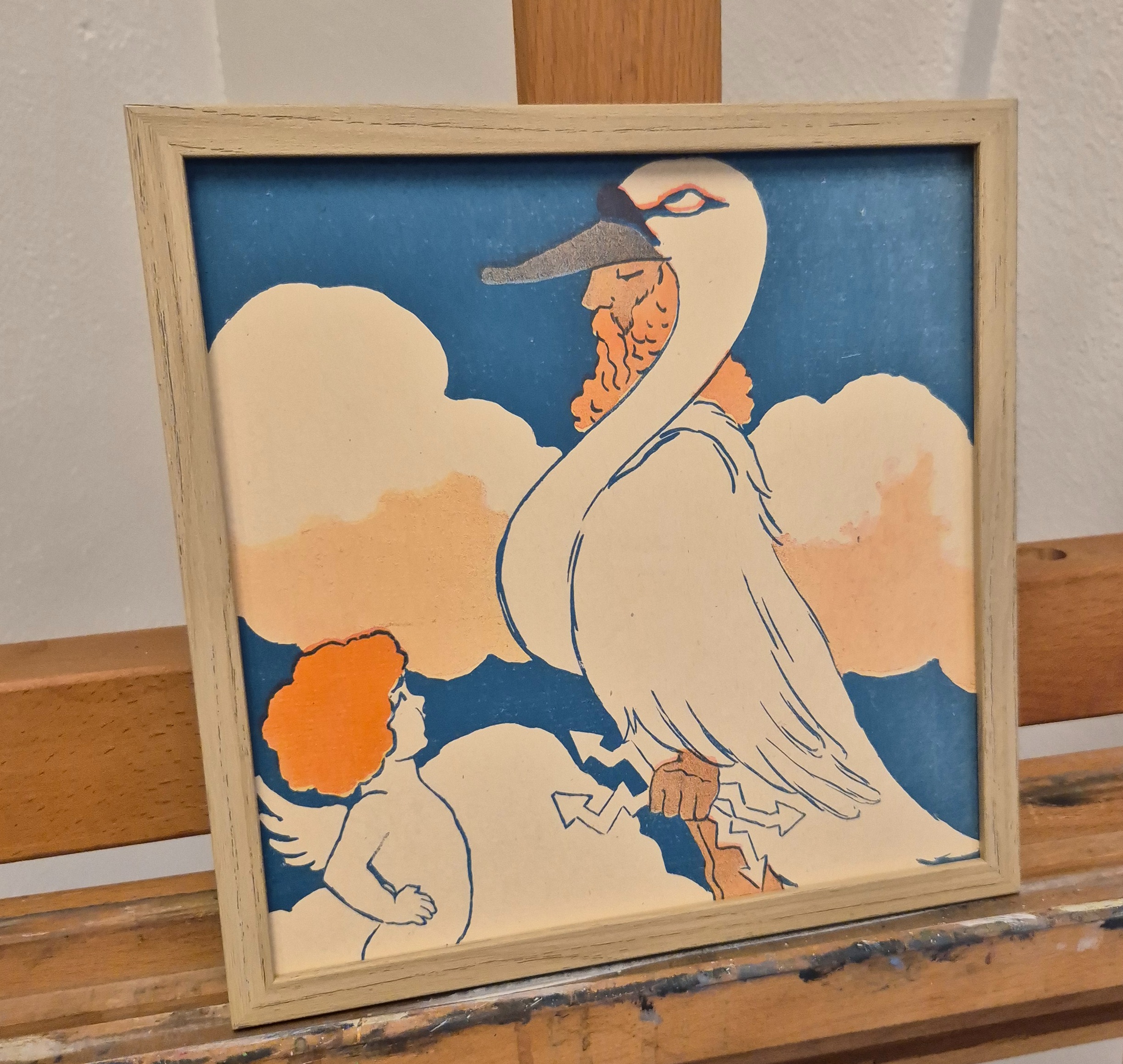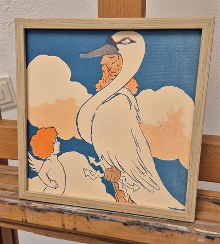 cupido kijkt naar de goddelijke zwaan. Bijzondere authentieke prent. Komt uit Franse weekblad L'Assiette au Beurre, waarin aan het begin van de 20e eeuw zeer artistieke prenten zijn uitgegeven. De vintage prent is gedrukt in 1902 in Parijs, midden in de Belle Epoque periode.