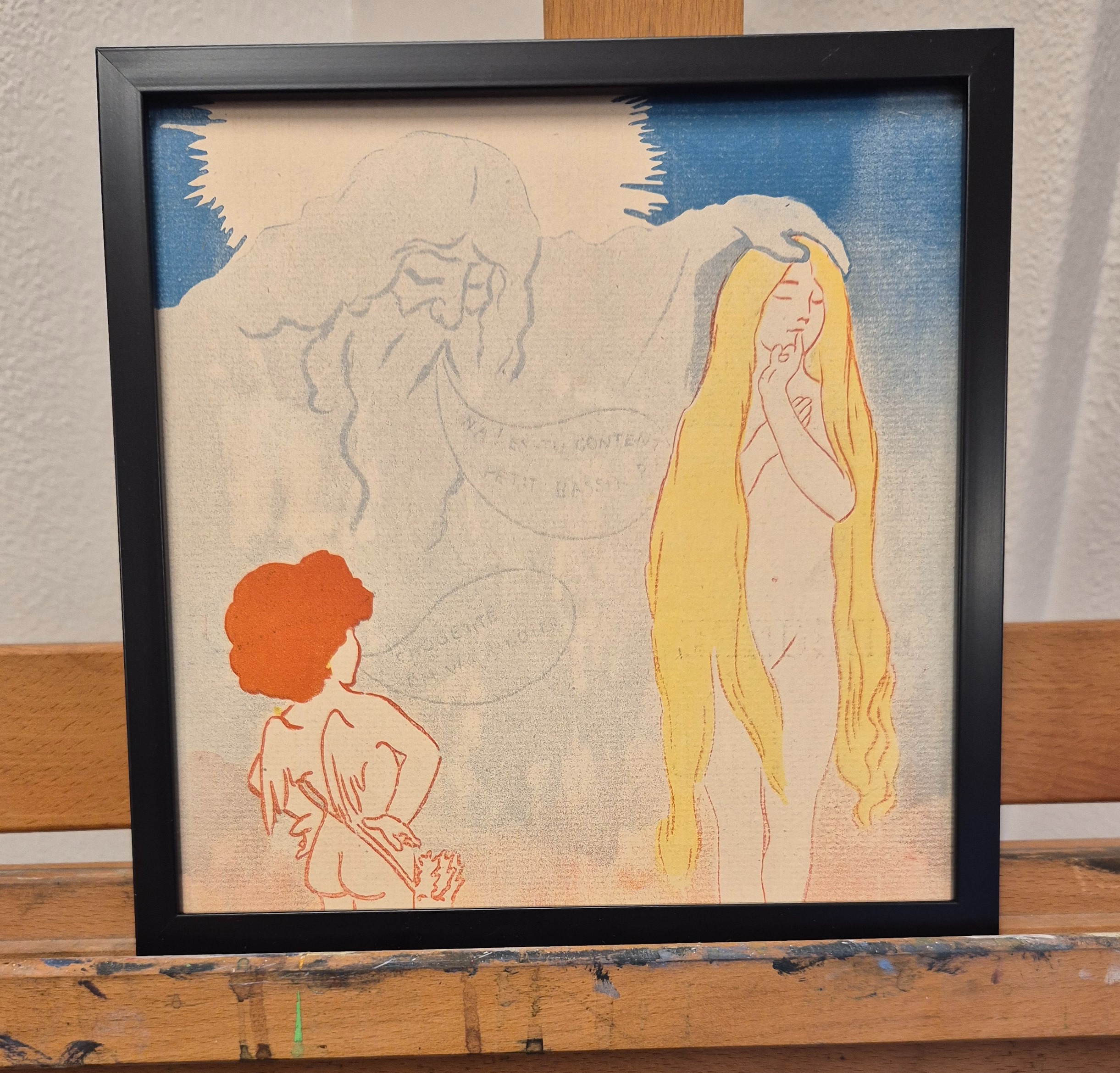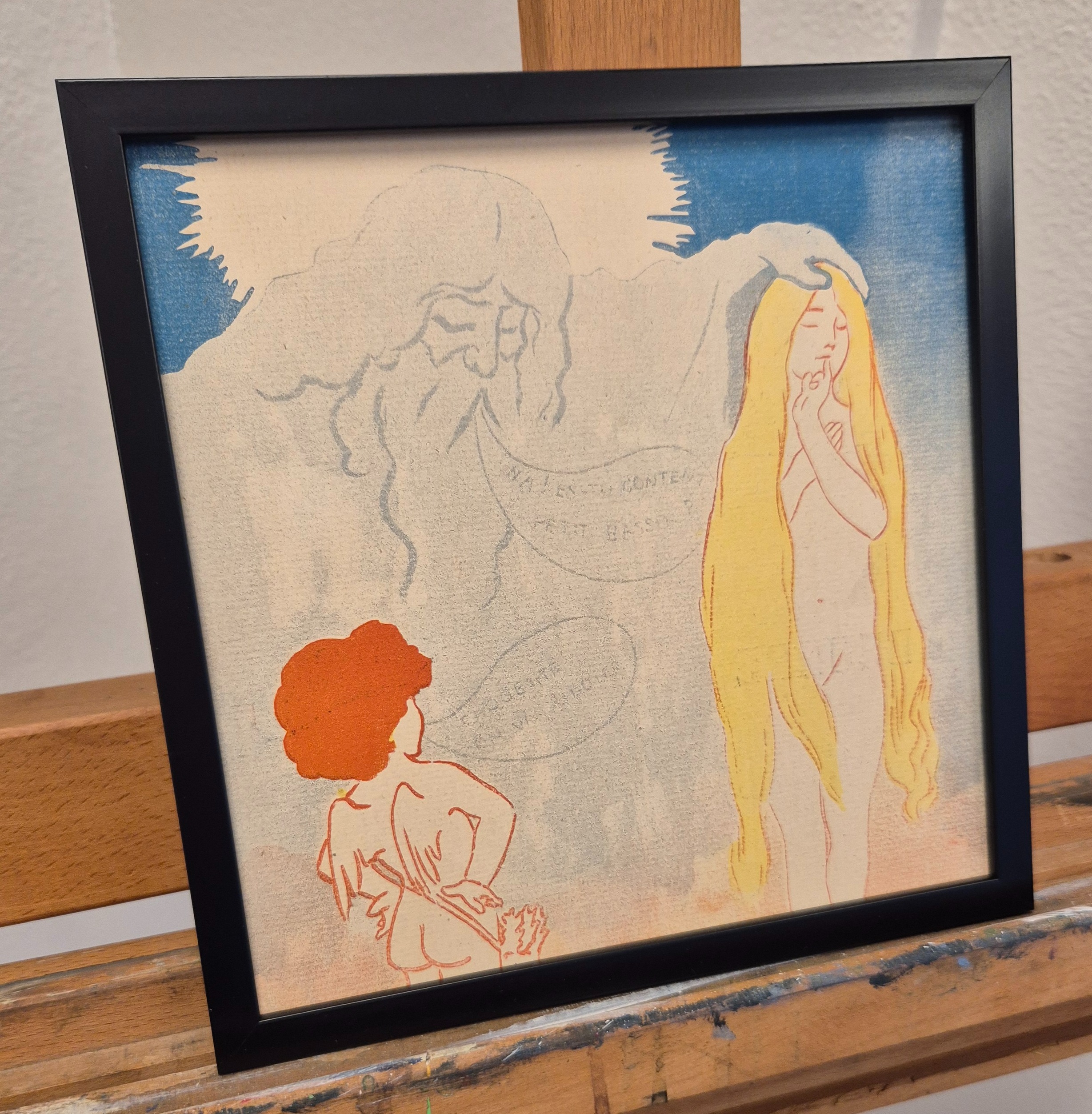 cupido kijkt naar handoplegging naakte vrouw. Bijzondere authentieke prent. Komt uit Franse weekblad L'Assiette au Beurre, waarin aan het begin van de 20e eeuw zeer artistieke prenten zijn uitgegeven. Gedrukt in 1902 in Parijs, midden in de Belle Epoque periode.