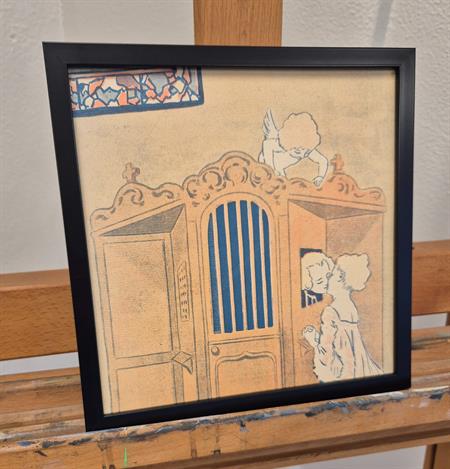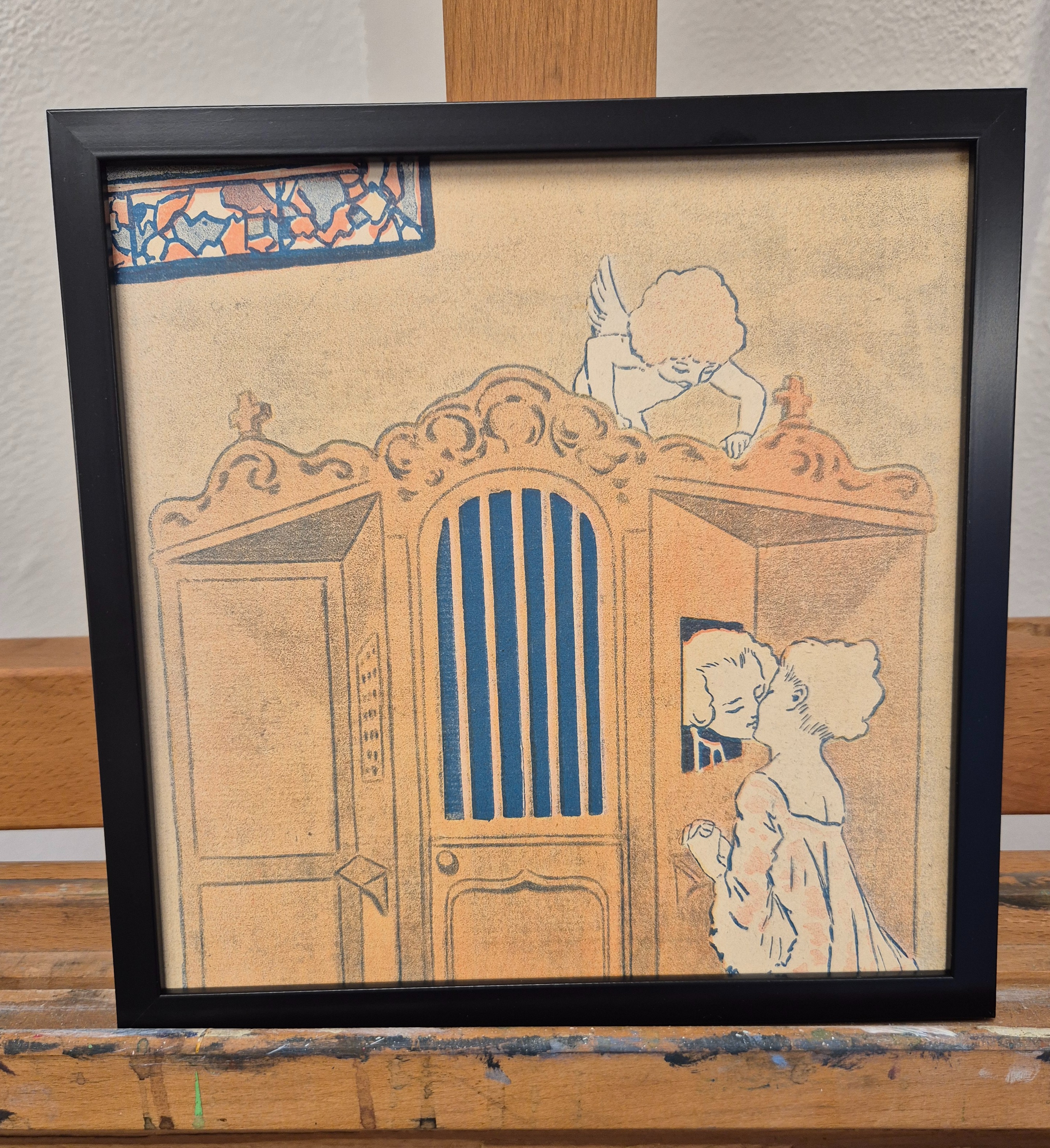 Cupido kijkt naar de kus in de biecht. Originele prent uit het begin van de 20e eeuw. De prent is afkomstig uit het Franse weekblad L'Assiette au Beurre. Deze prent is gedrukt midden in de Belle Epoque periode in 1902 in Parijs.
