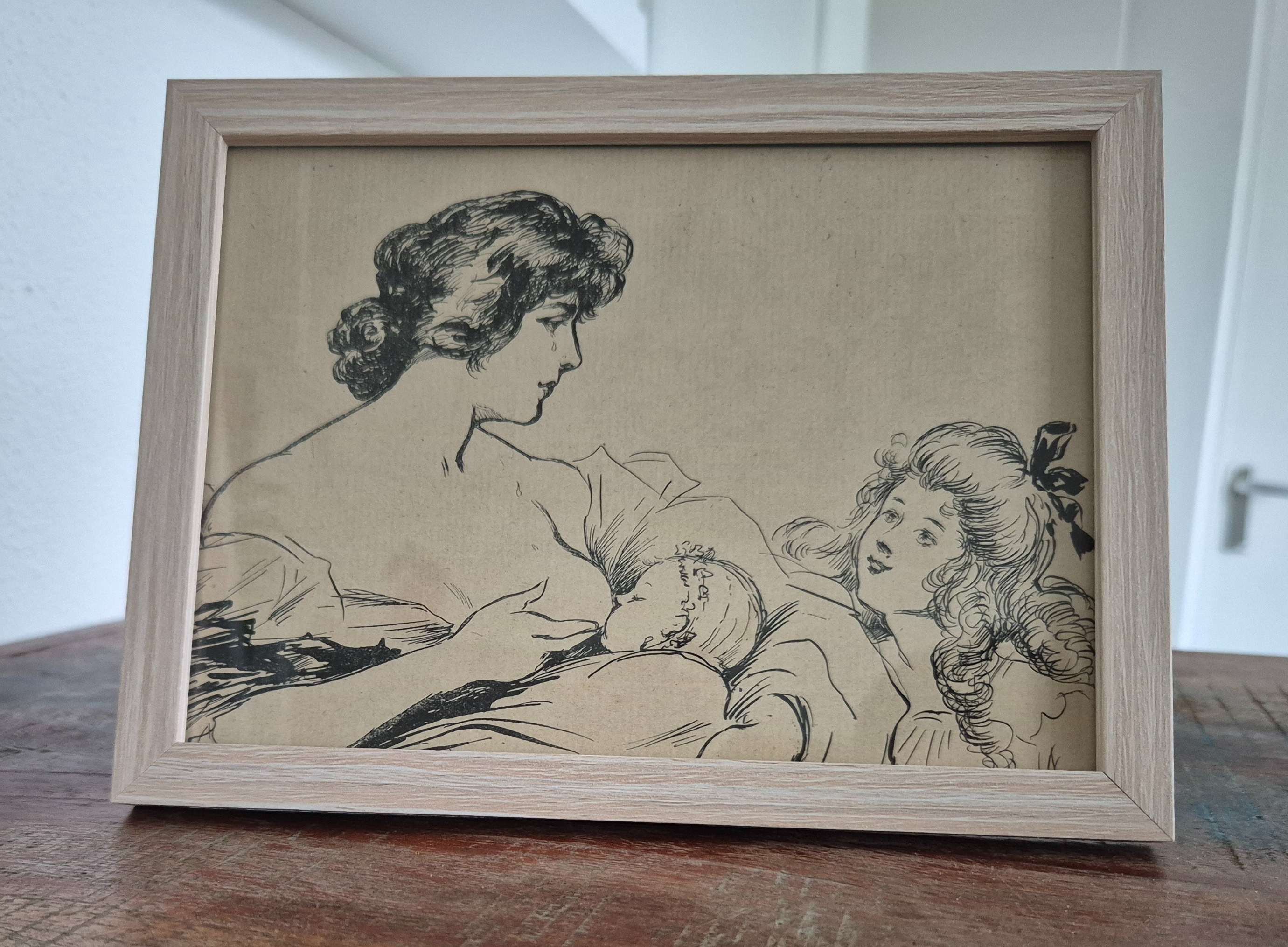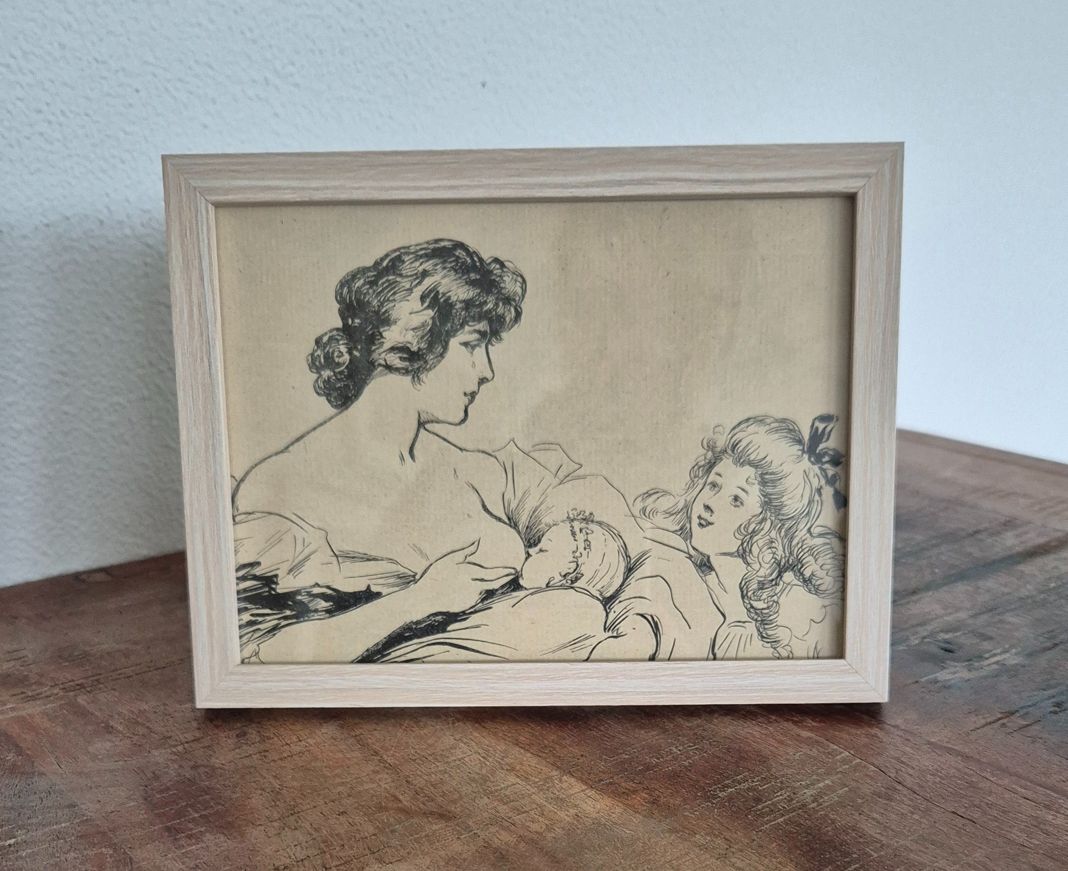 De zuigeling, de moeder en dochter. Originele prent uit het begin van de 20e eeuw. De prent is afkomstig uit het Franse weekblad L'Assiette au Beurre. De vintage prent is gedrukt in 1901 in Parijs, midden in de Belle Epoque periode. Lami maakte deze prent voor in weekblad L'Assiette au Beurre.