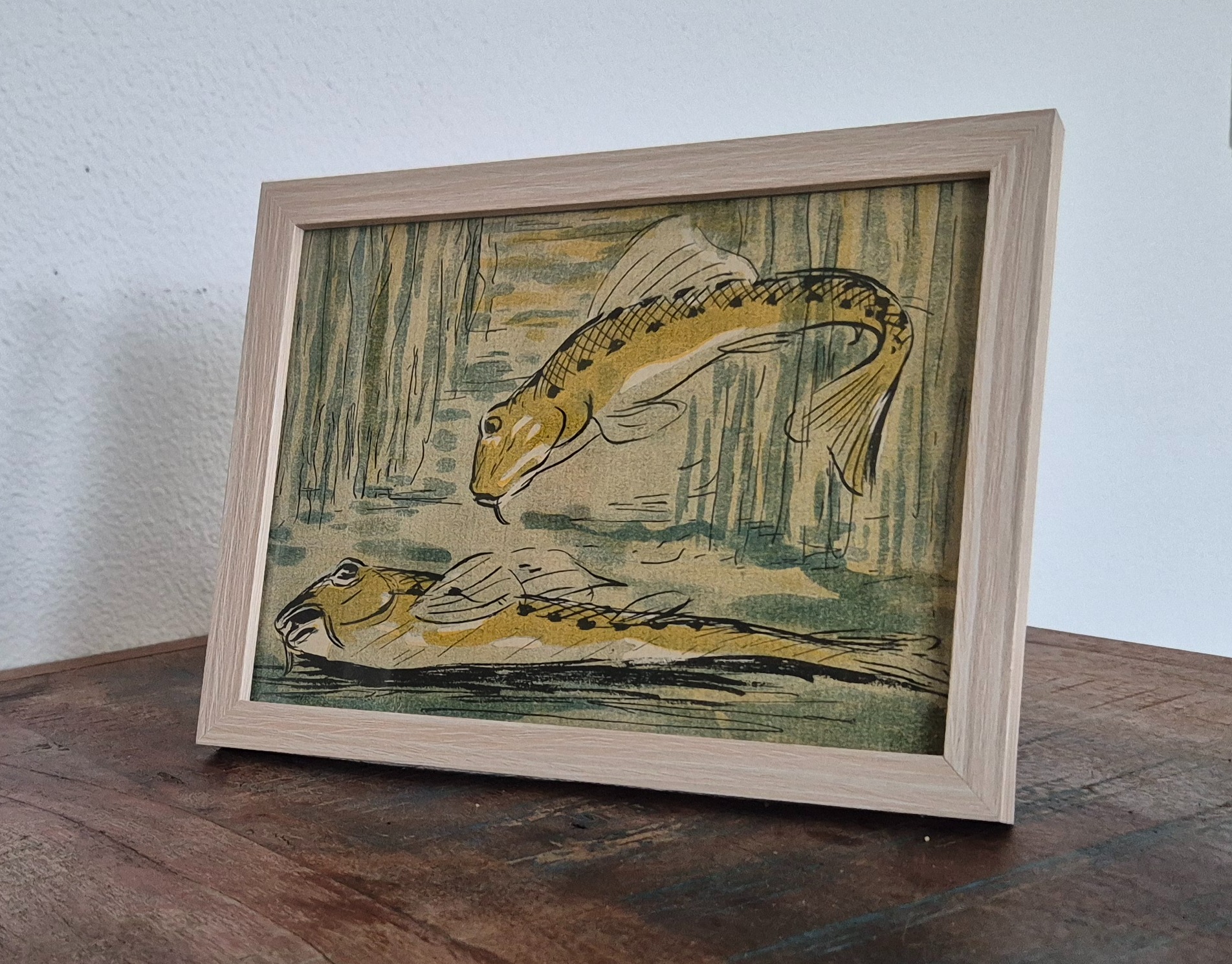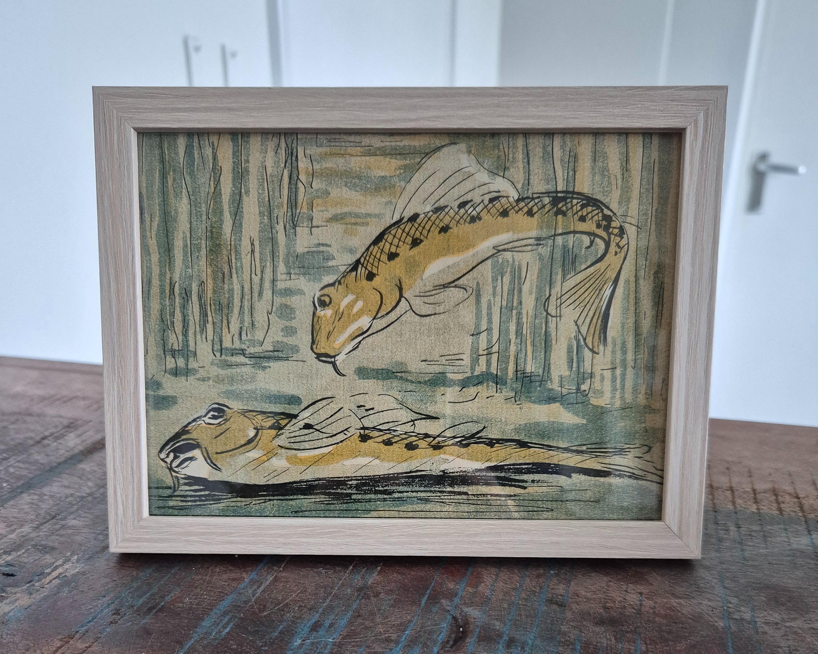 onder water - de twee vissen. Bijzondere authentieke prent. Komt uit Franse weekblad L'Assiette au Beurre, waarin aan het begin van de 20e eeuw zeer artistieke prenten zijn uitgegeven. Deze prent is gedrukt midden in de Belle Epoque periode in 1901 in Parijs. Prent gemaakt door Henri-Gabriel Ibels in weekblad L'Assiette au Beurre.