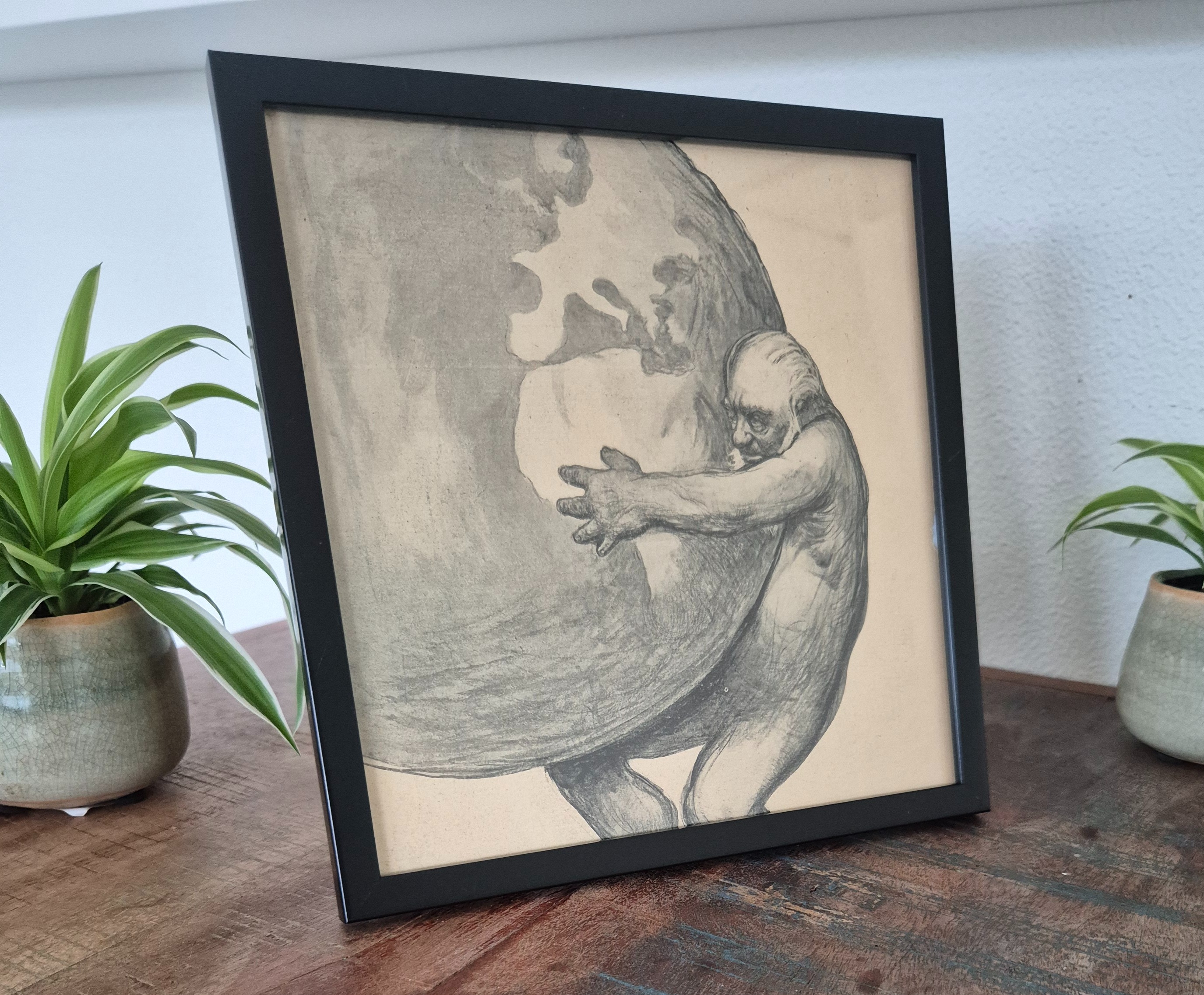 De last van de wereld. Leuke authentieke prent. De prent is afkomstig uit het Franse weekblad L'Assiette au Beurre. Elke week werd er een weekblad uitgegeven met circa 10 spotprenten. De vintage prent is gedrukt in 1901 in Parijs, midden in de Belle Epoque periode. Prent gemaakt door Jean Veber in weekblad L'Assiette au Beurre.